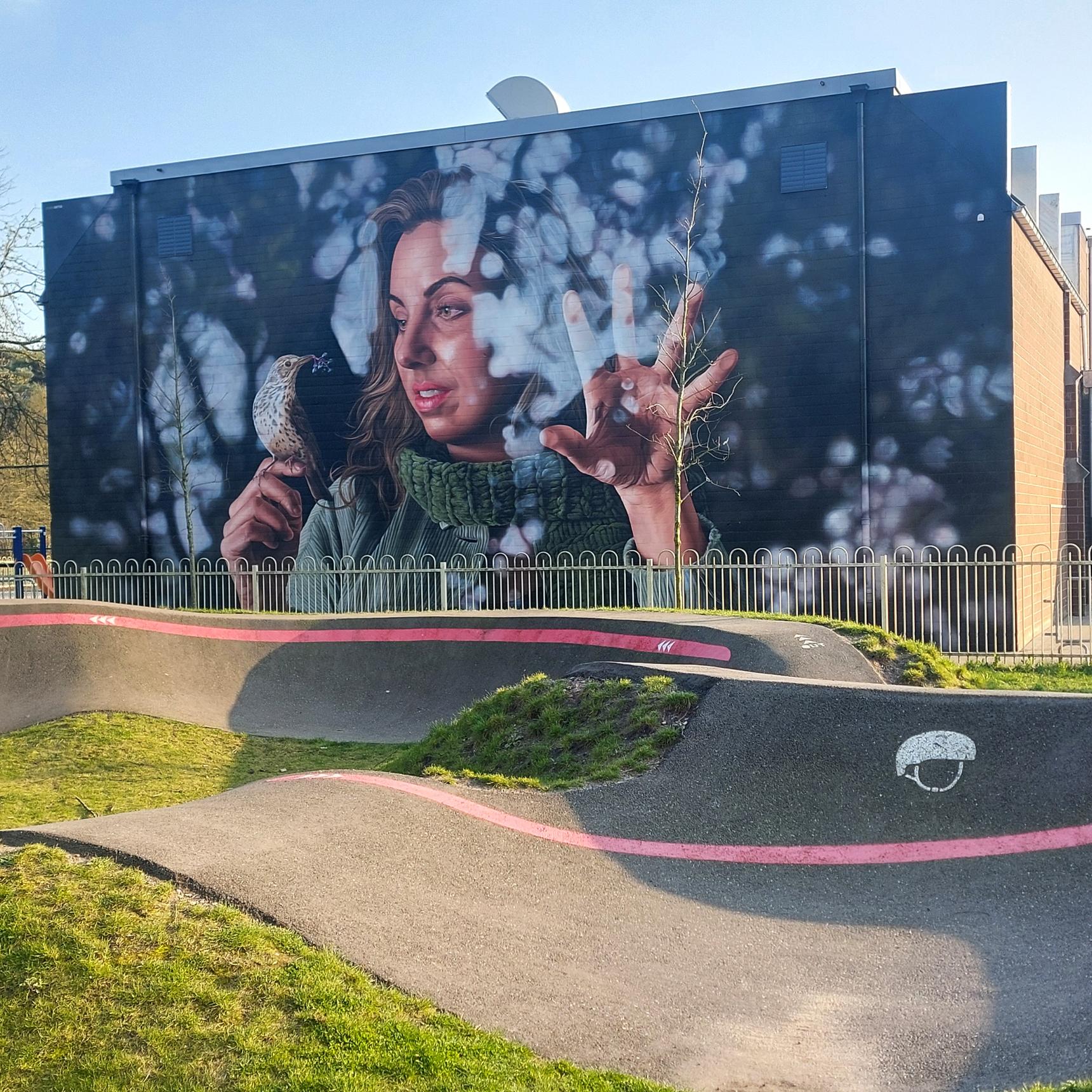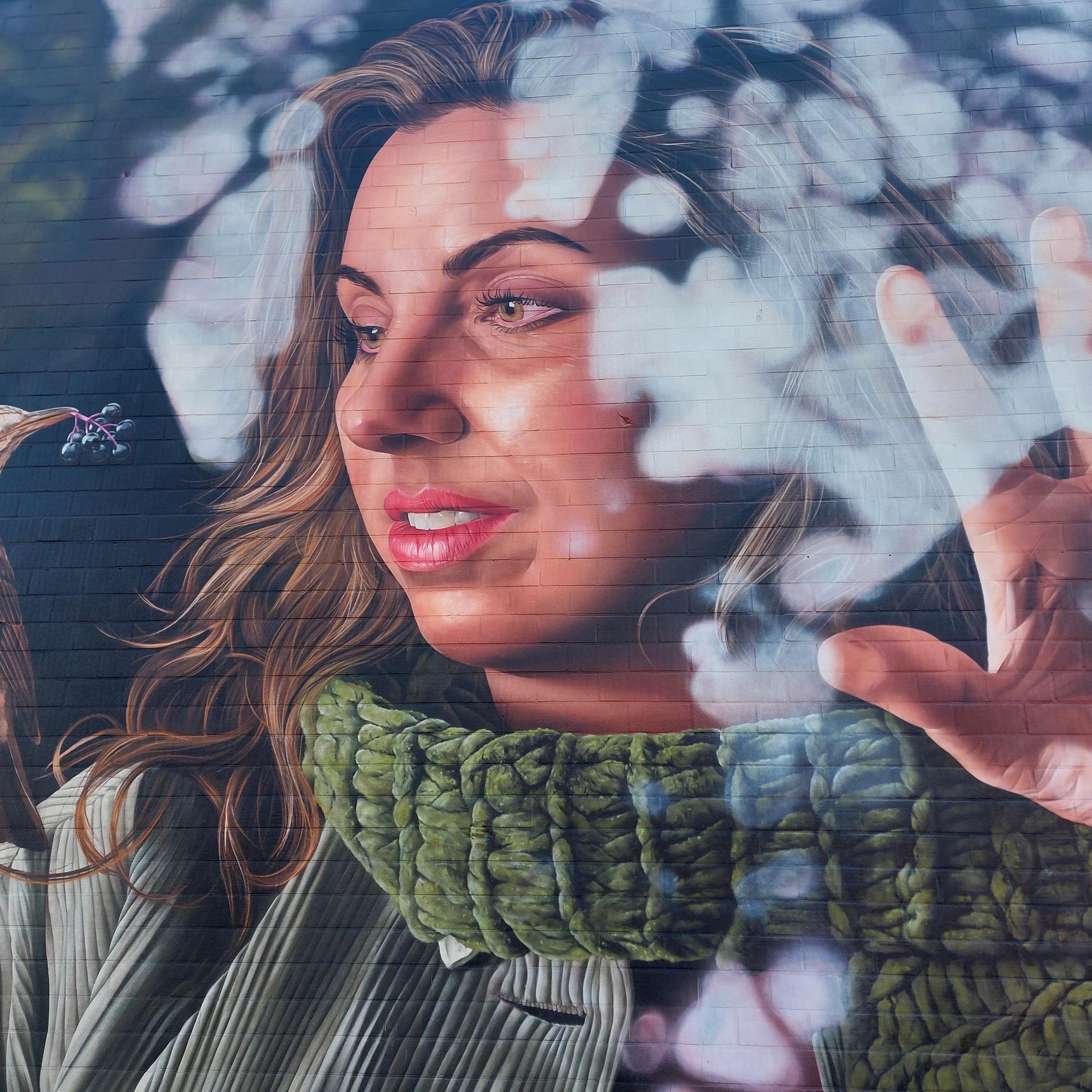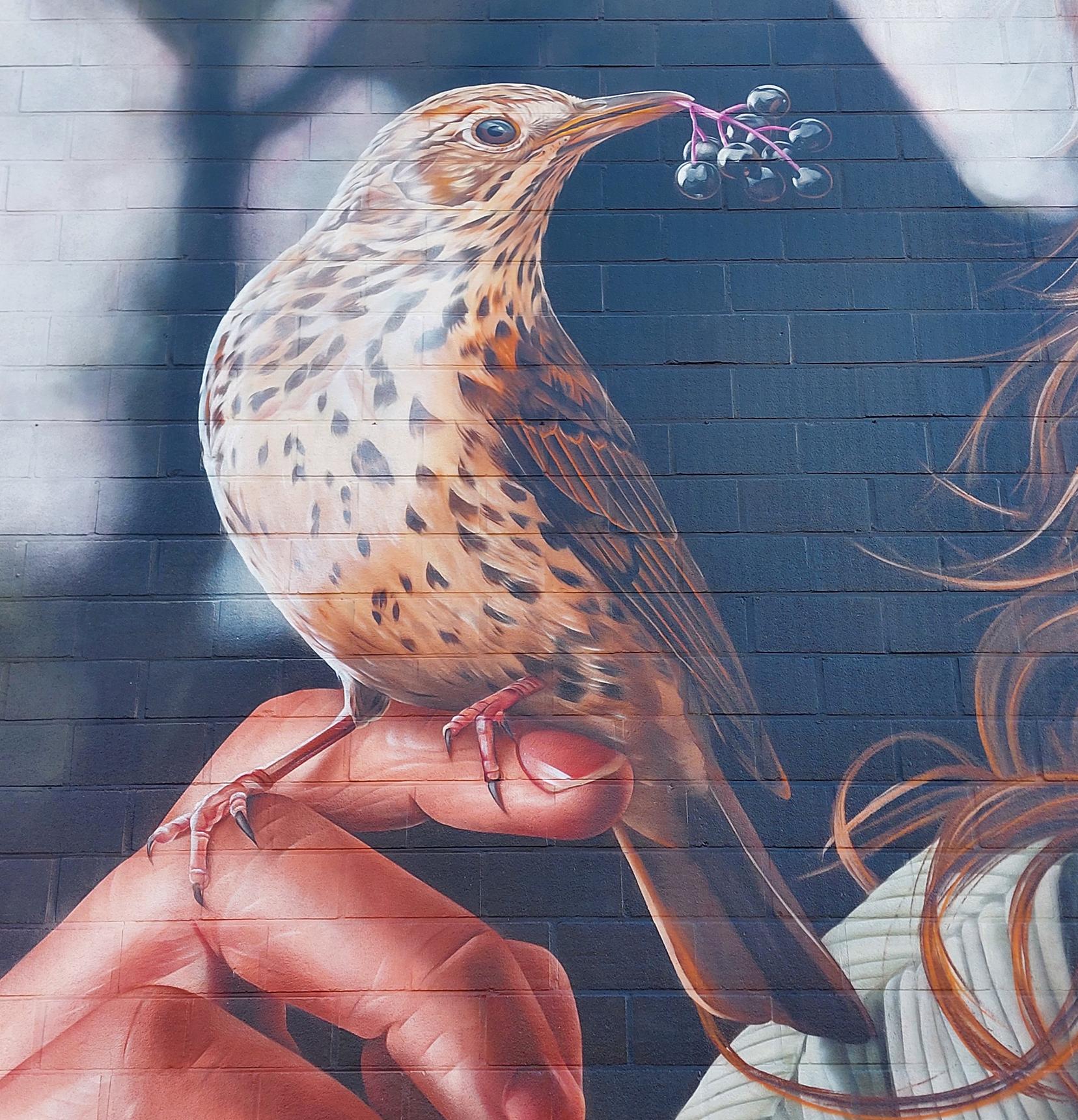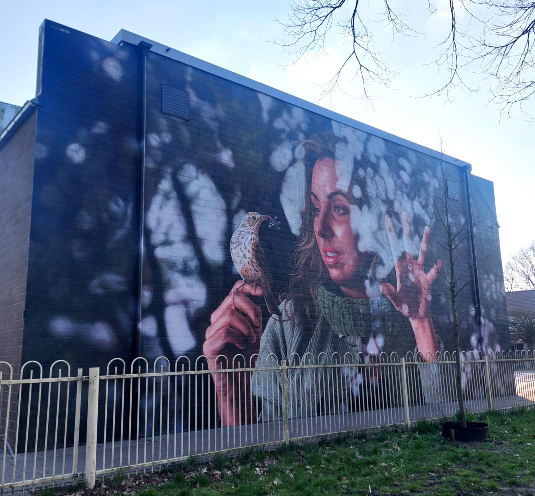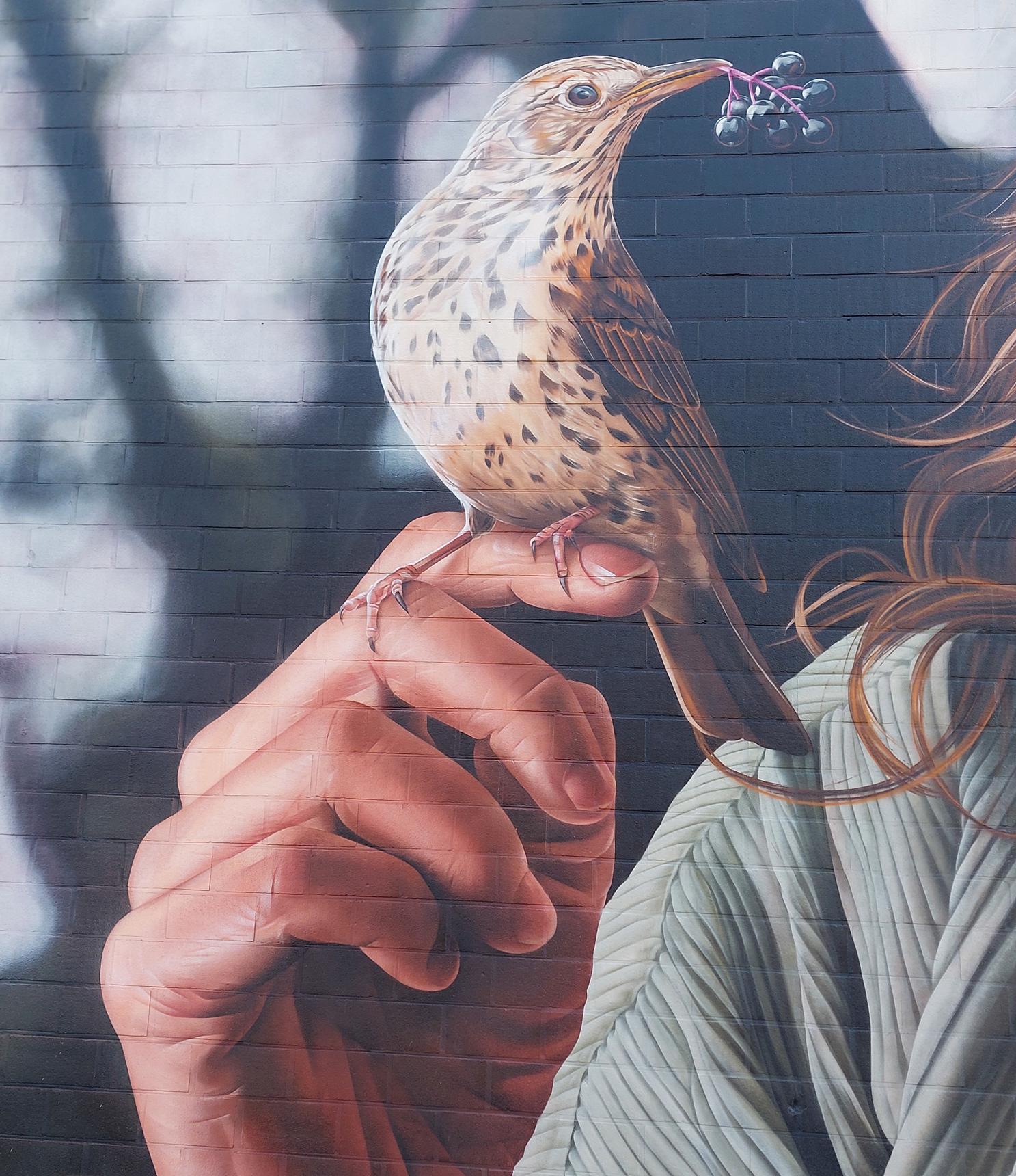 The mural brings together glass, nature and culture. A woman appears behind a subtle glass panel, in which a reflection refers to the Sahara nature reserve in Lommel. A song thrush perches on her finger as a symbol of culture and experience, which occupy a prominent place in this neighbourhood. Small details such as elderberries nod to local produce.