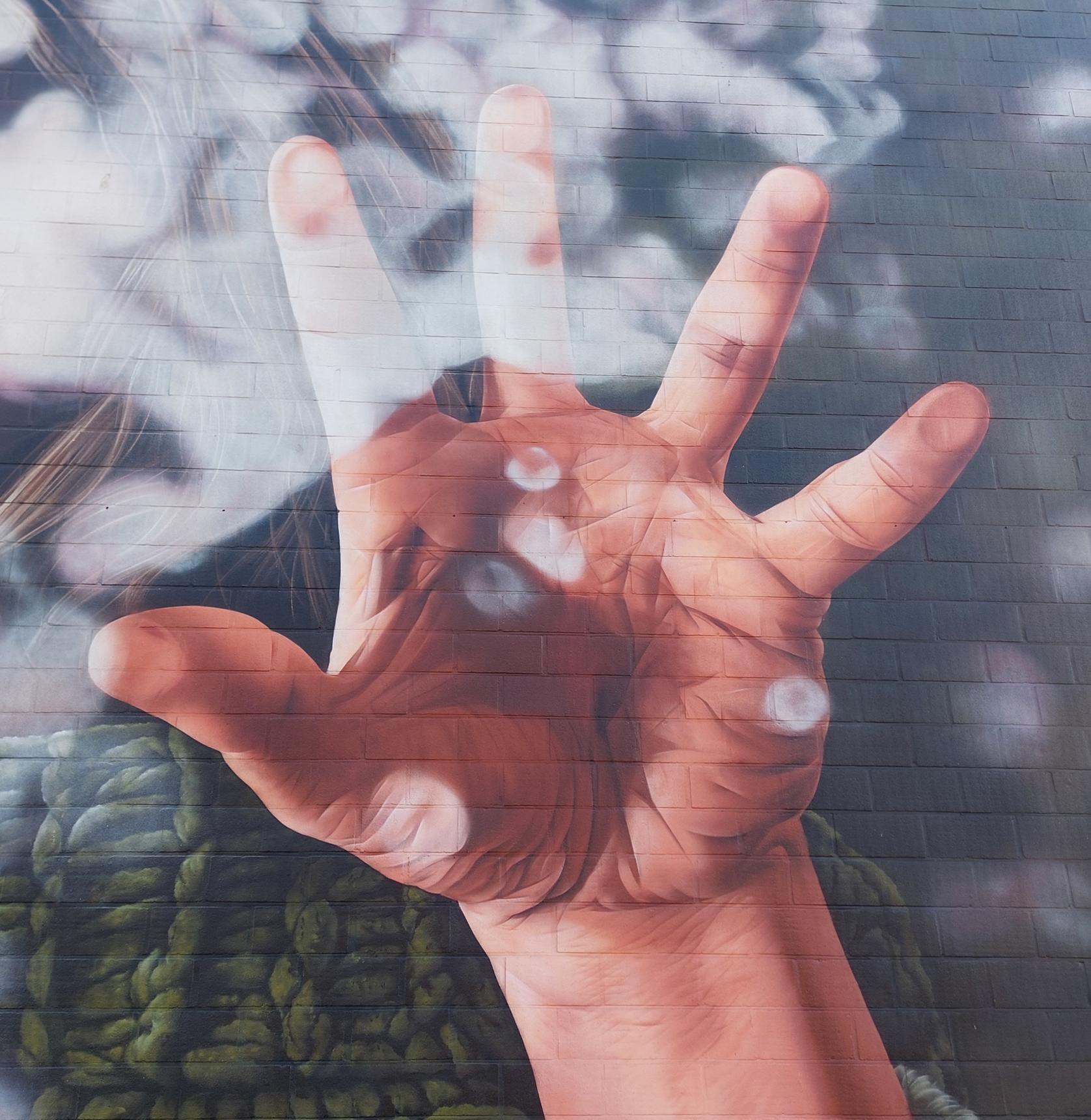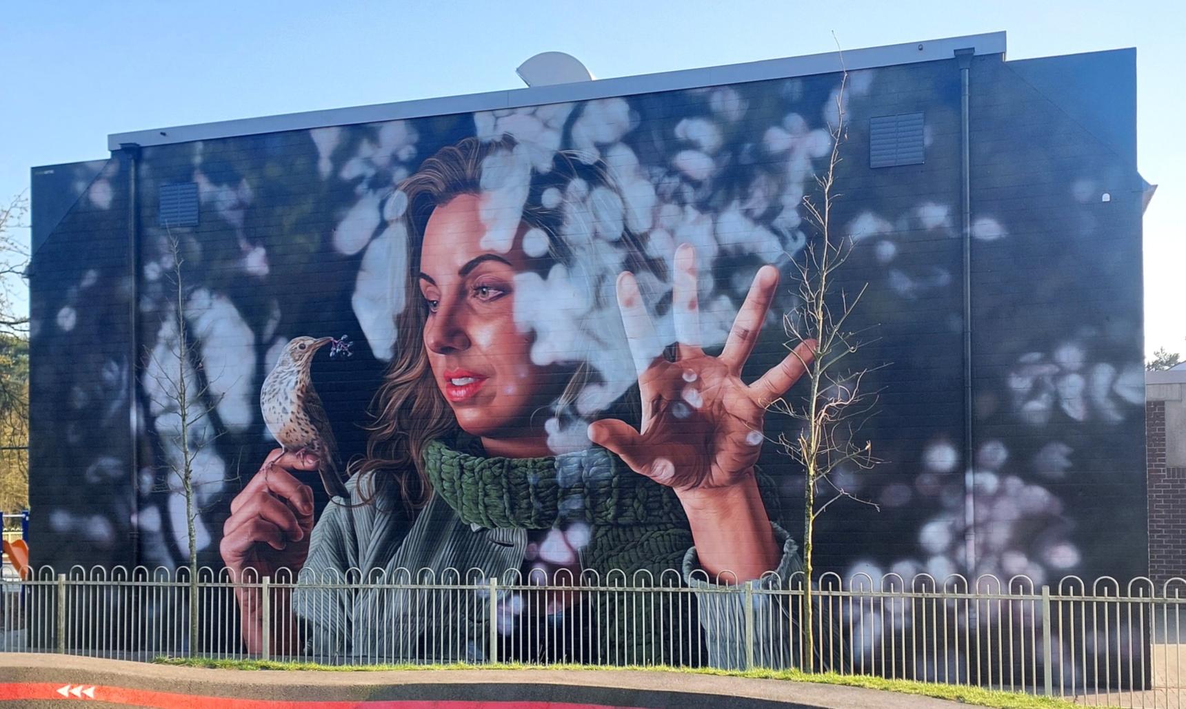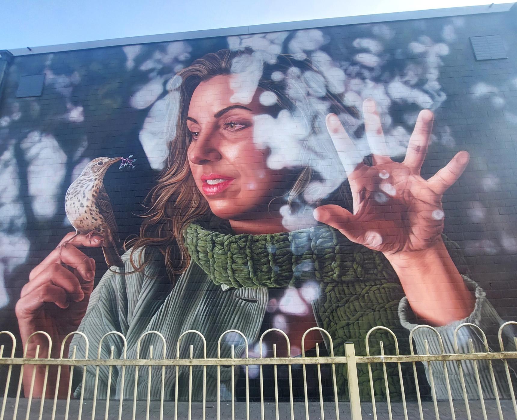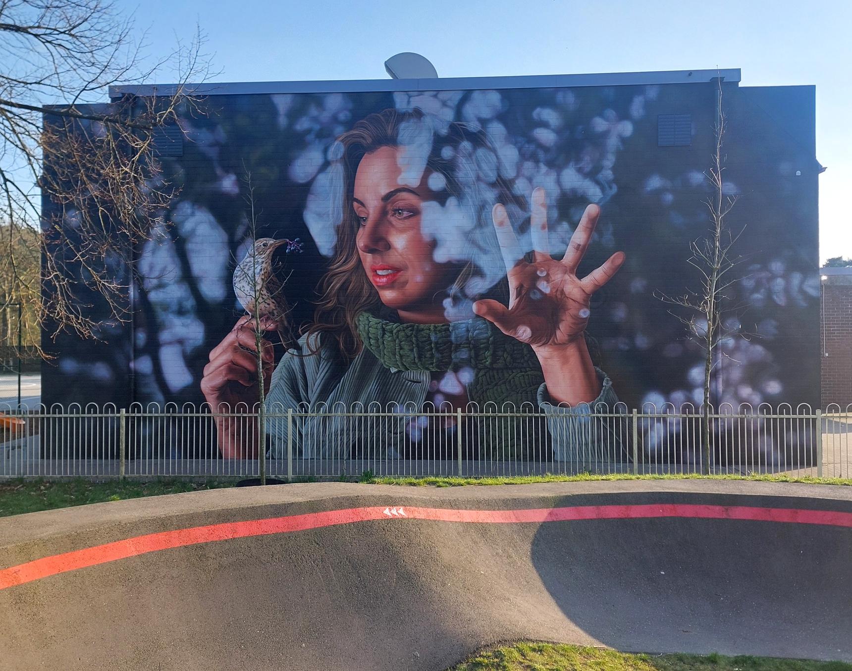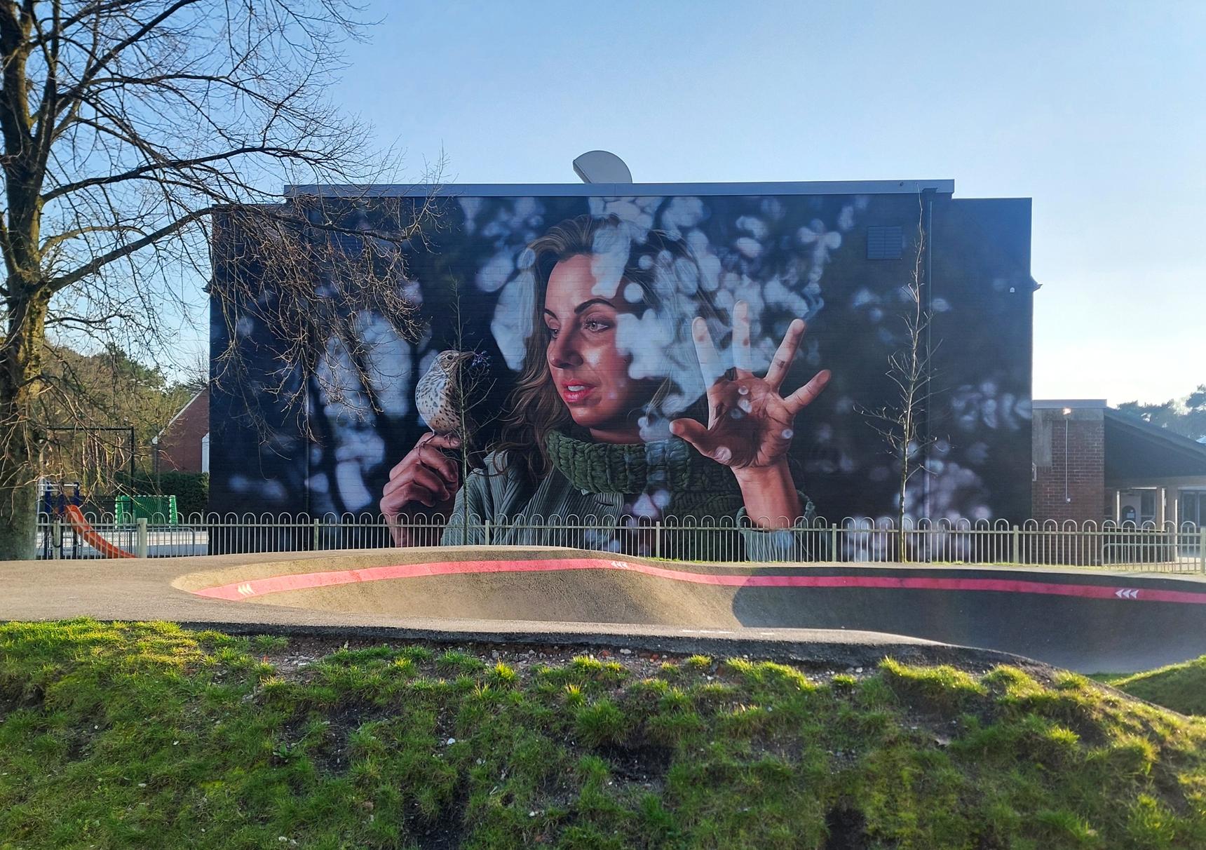The mural brings together glass, nature and culture. A woman appears behind a subtle glass panel, in which a reflection refers to the Sahara nature reserve in Lommel. A song thrush perches on her finger as a symbol of culture and experience, which occupy a prominent place in this neighbourhood. Small details such as elderberries nod to local produce.