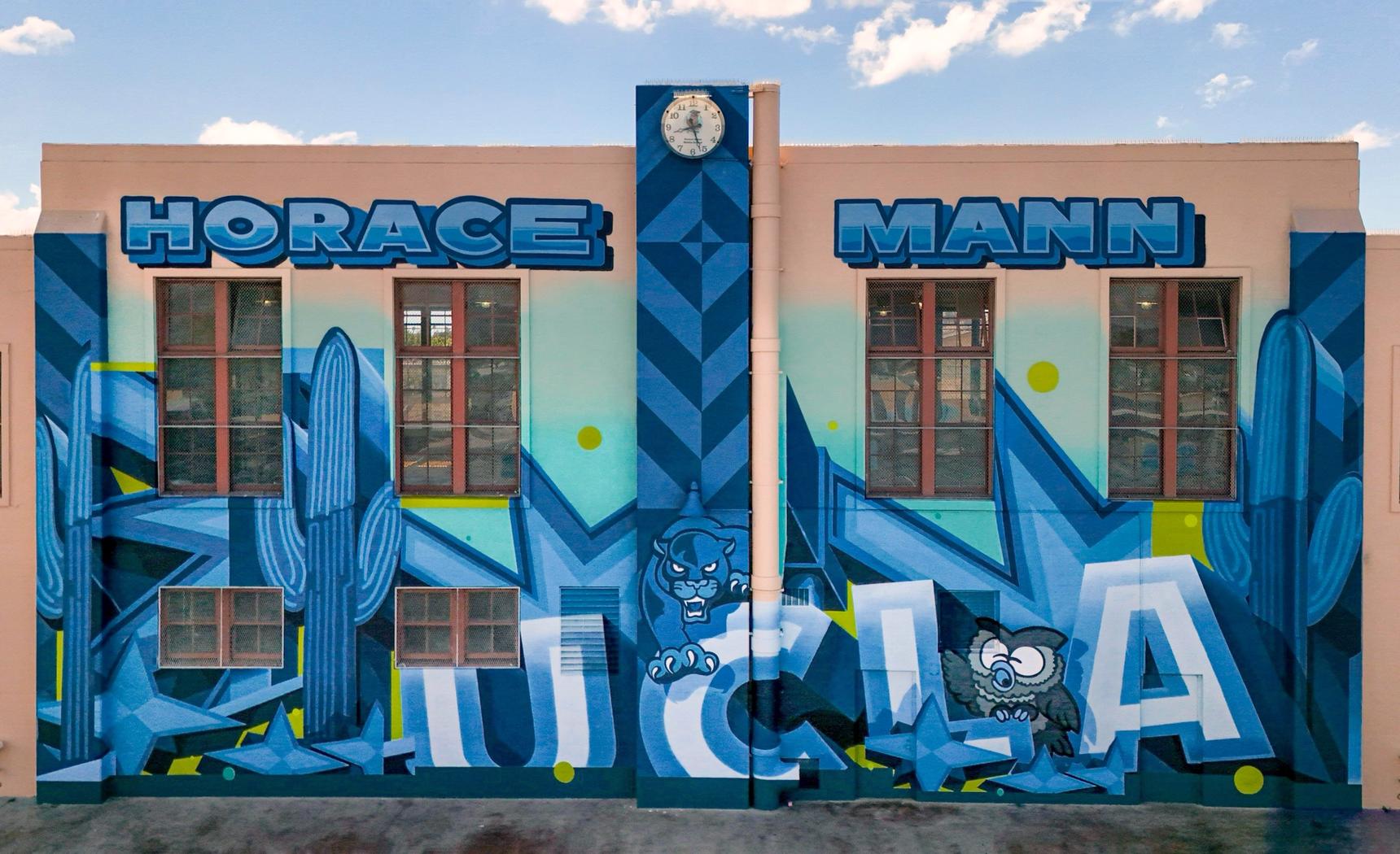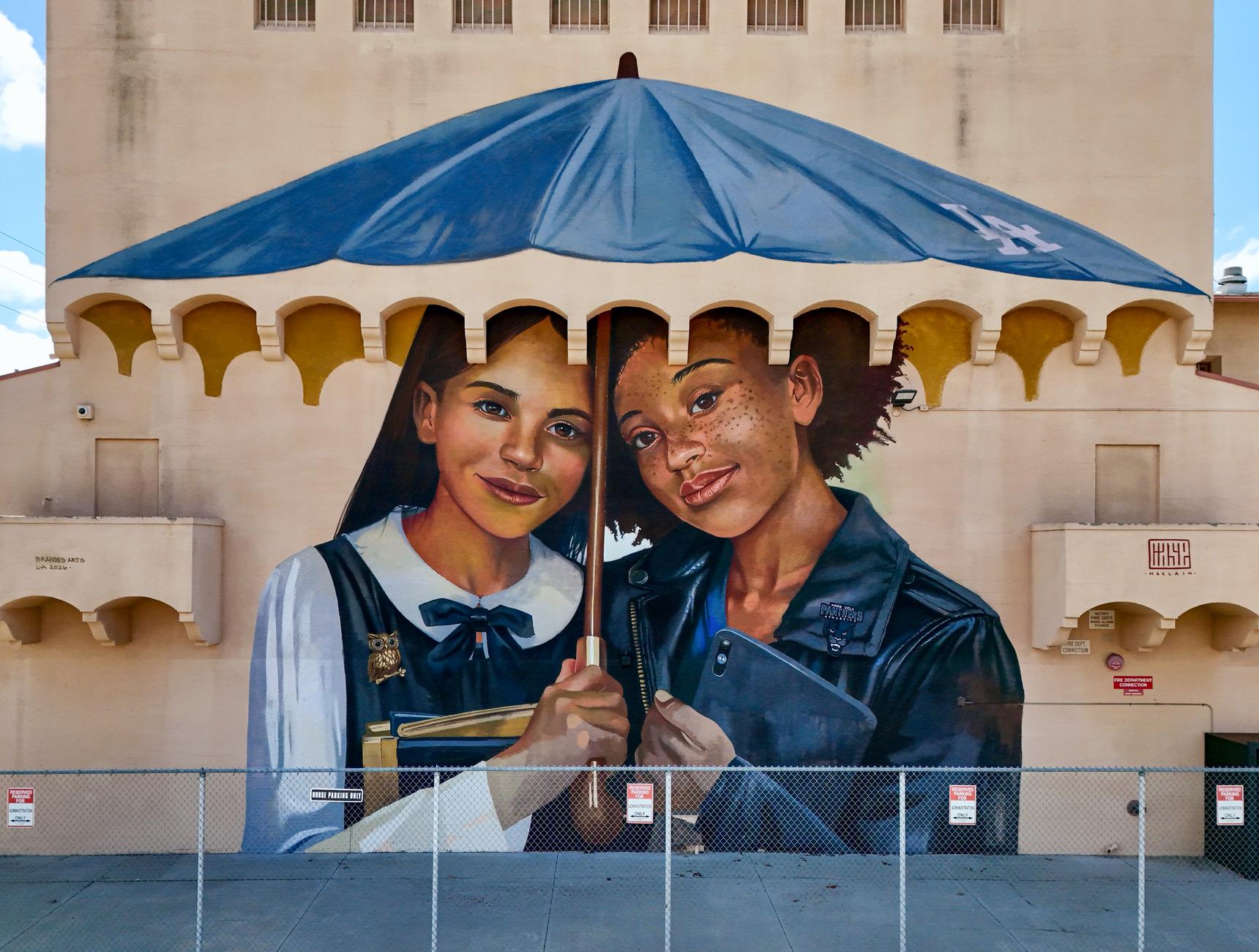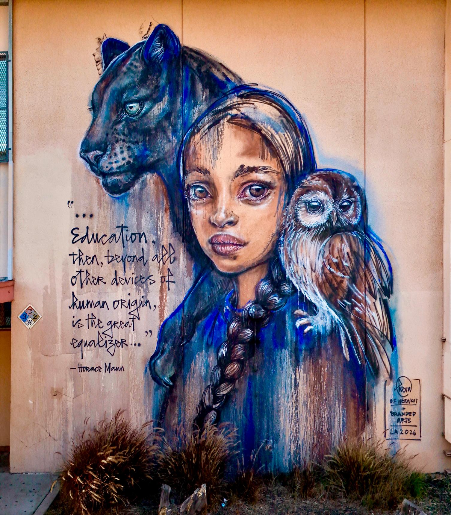 These three murals and more on the grounds of Horace Mann UCLA Community School, painted for this year’s edition of Branded Arts Festival. Tricky to see or photograph most of the murals unless you can get on school grounds or bring a drone when school’s not in session.