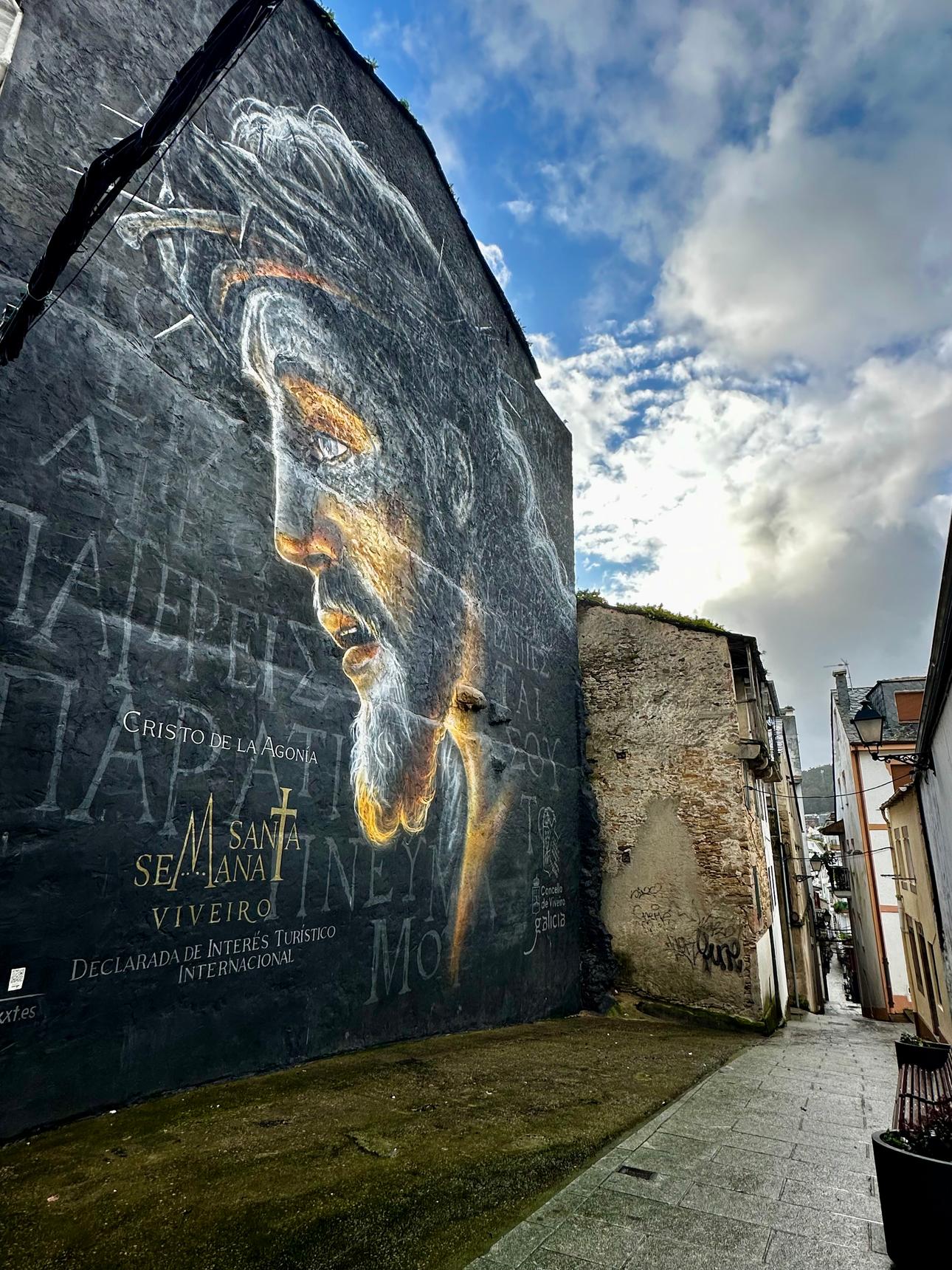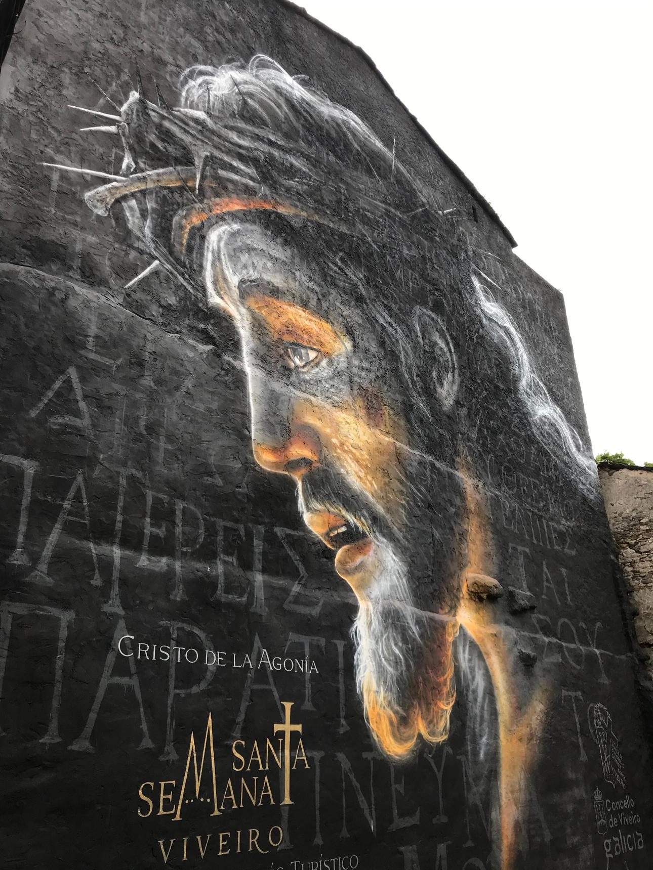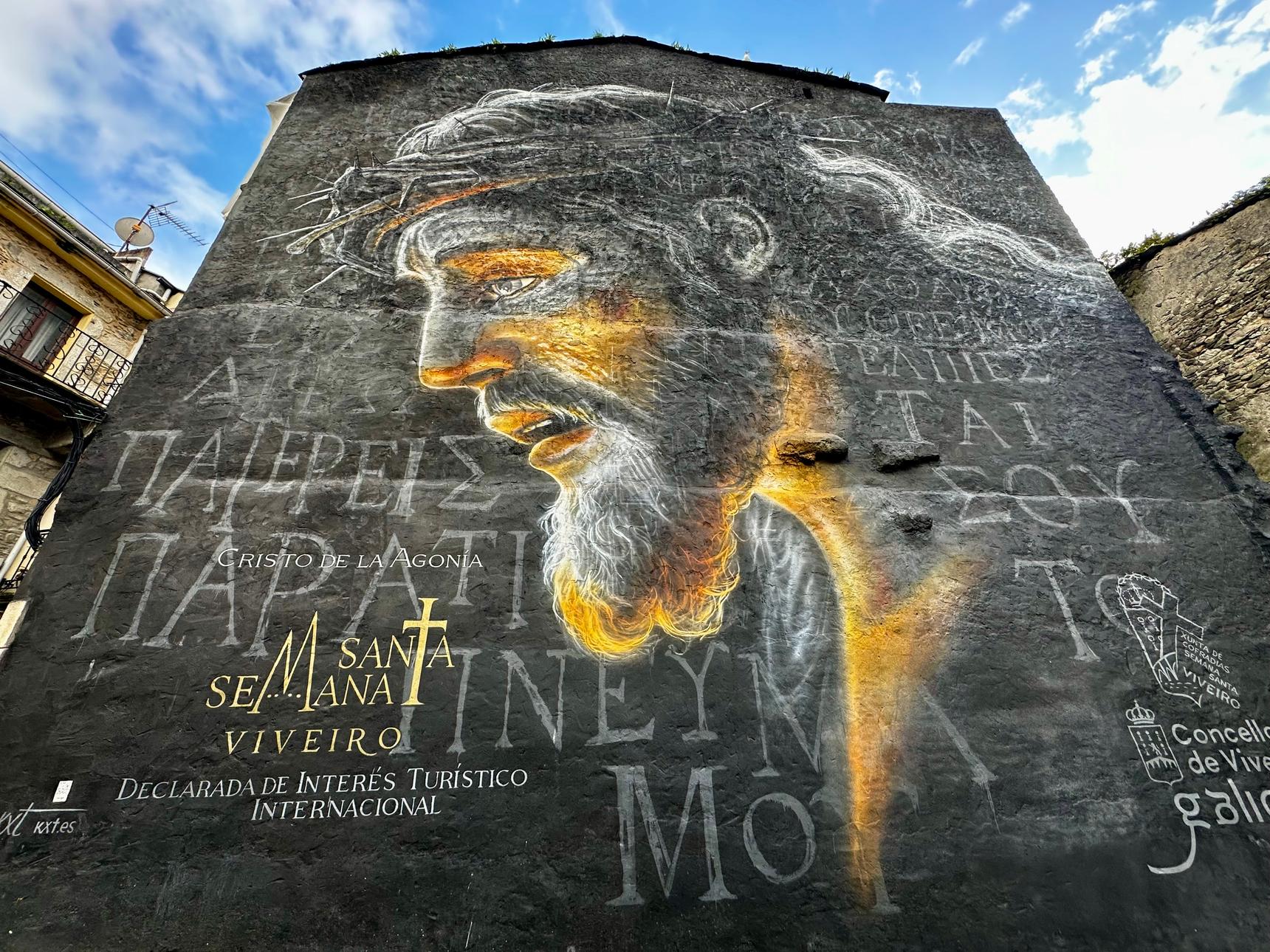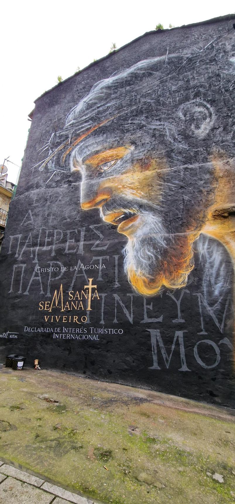 Mural created in the historic center of Viveiro (Lugo), on a rustic wall. Based on the sacred image of Christ of the Agony from the Church of San Francisco. Various techniques: Airbrush, Spray Paint, Brush, Roller, Airless Spray.