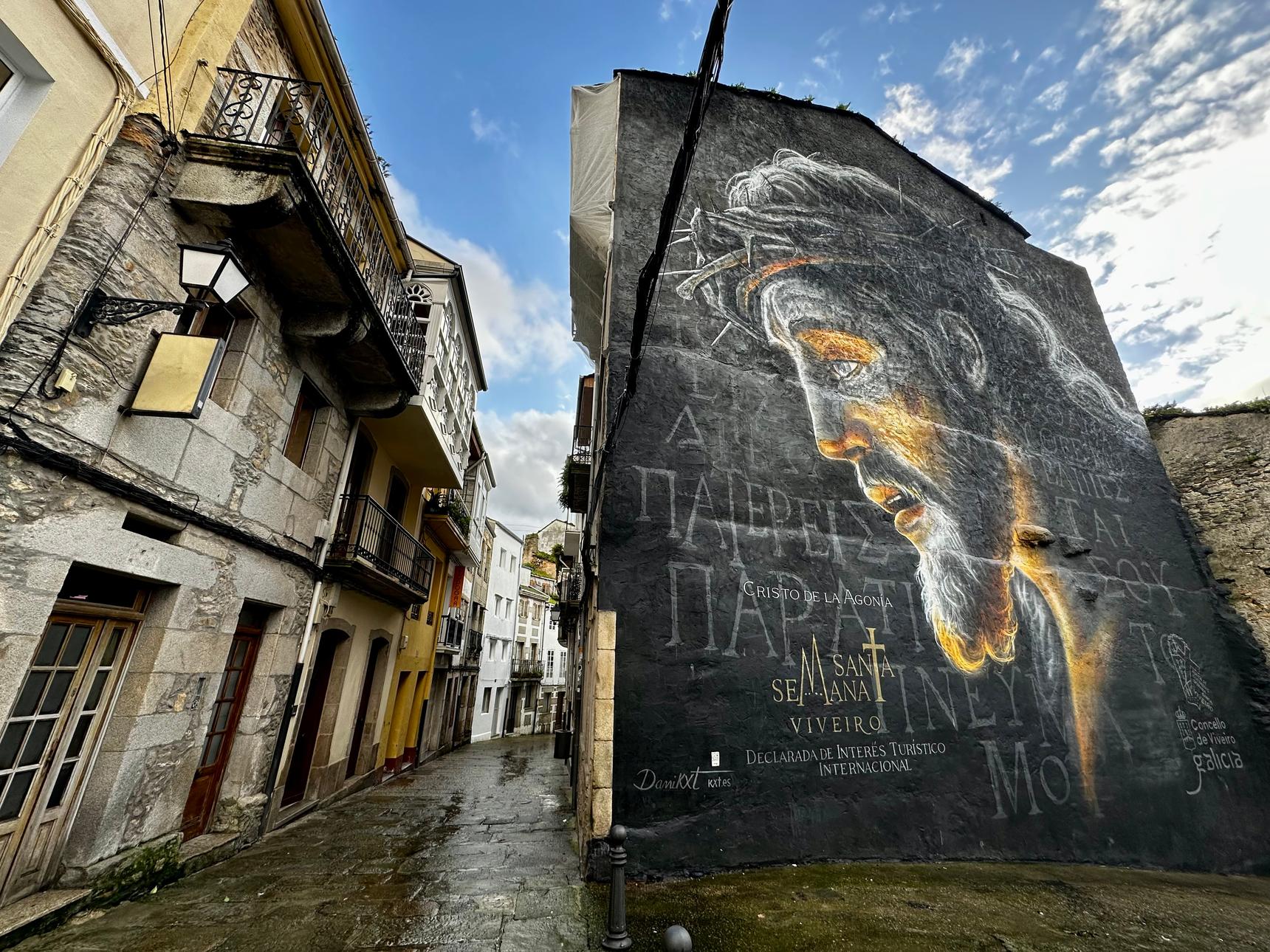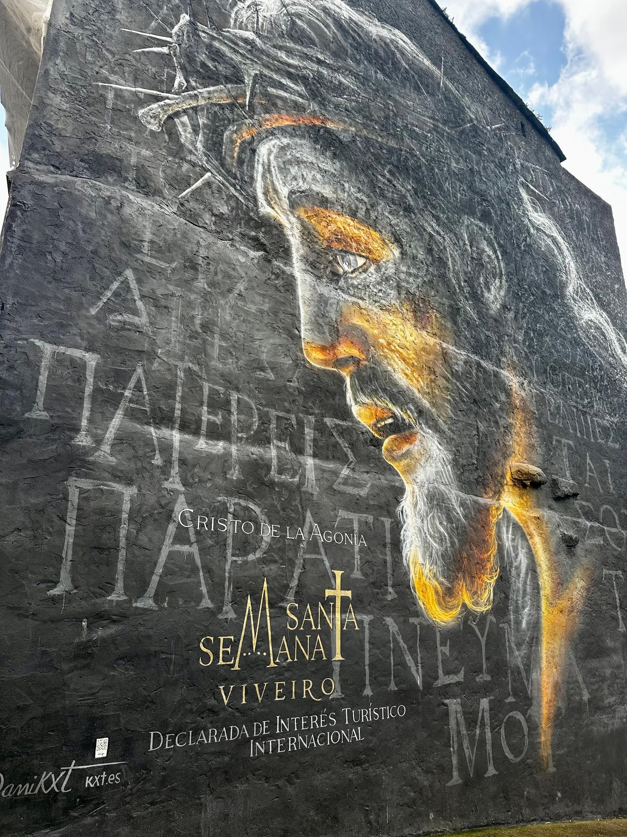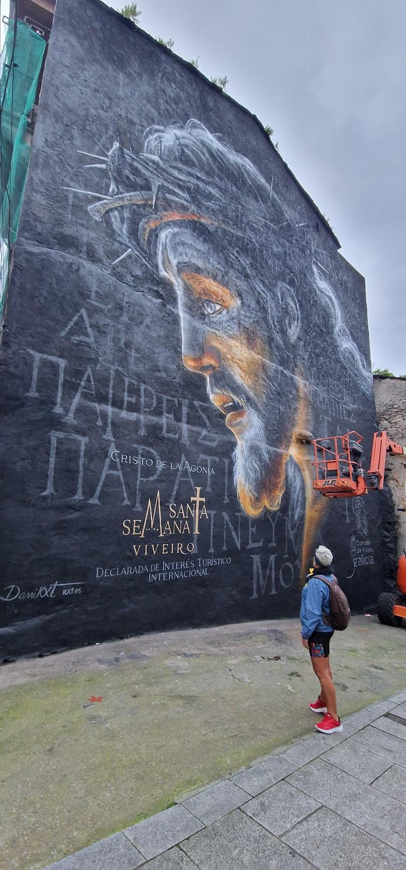 Mural created in the historic center of Viveiro (Lugo), on a rustic wall. Based on the sacred image of Christ of the Agony from the Church of San Francisco. Various techniques: Airbrush, Spray Paint, Brush, Roller, Airless Spray.