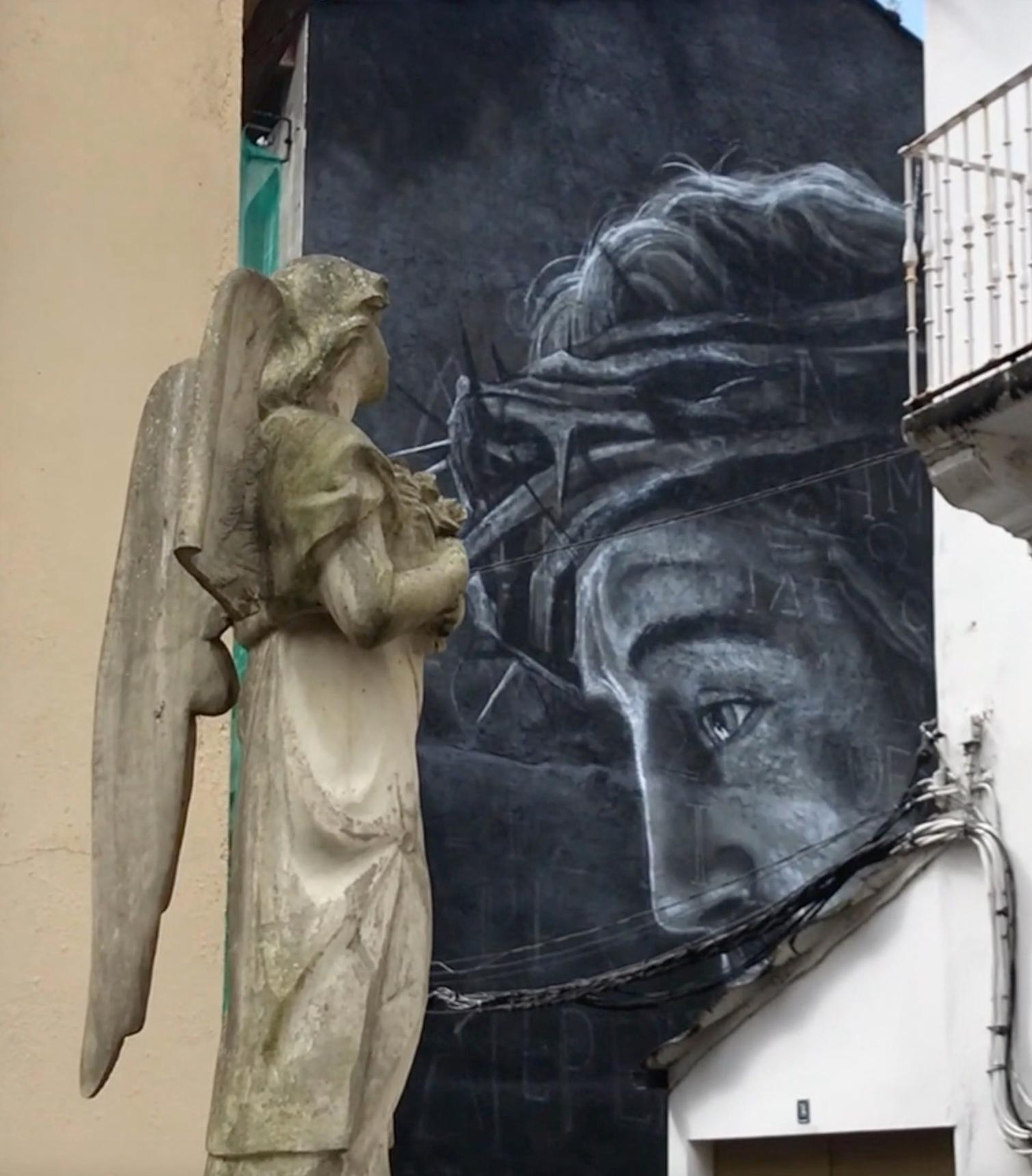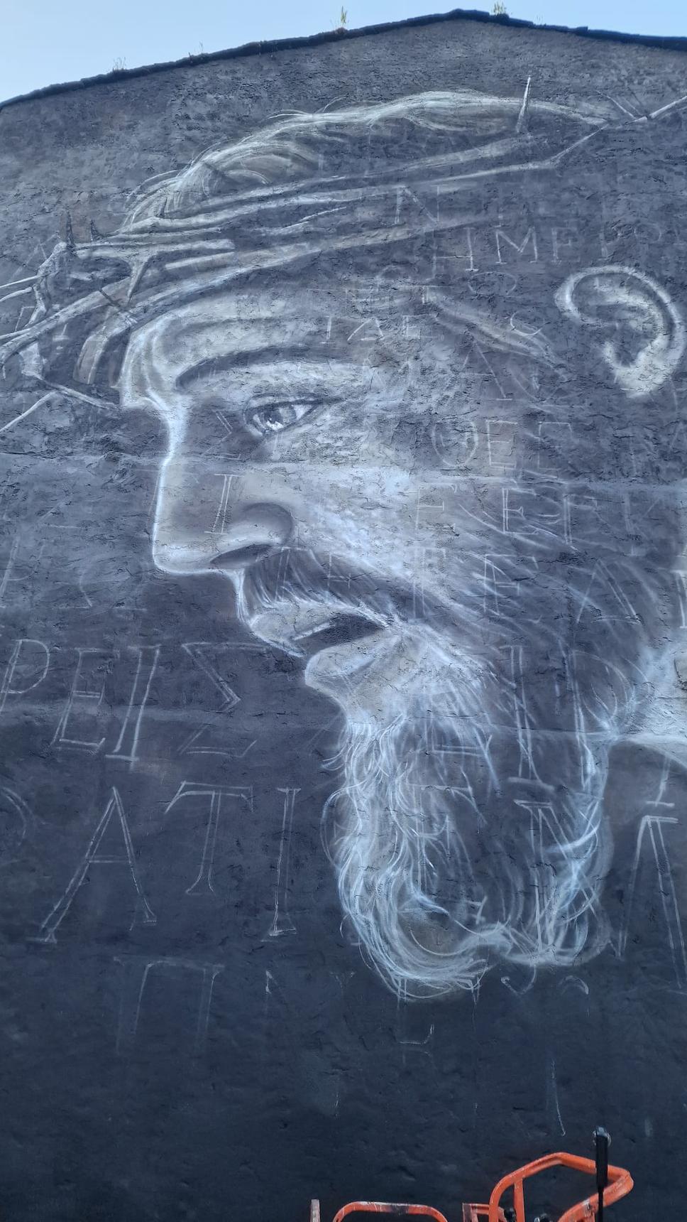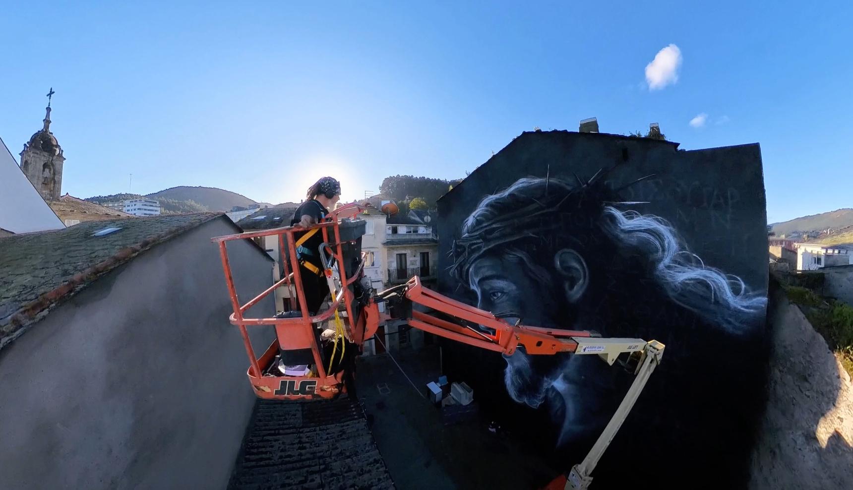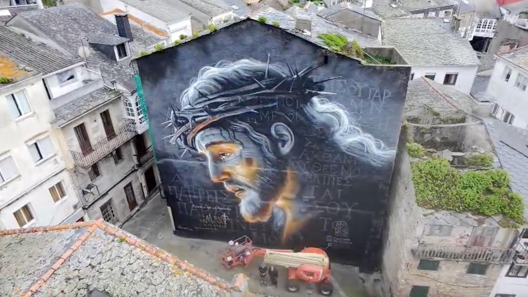 Mural created in the historic center of Viveiro (Lugo), on a rustic wall. Based on the sacred image of Christ of the Agony from the Church of San Francisco. Various techniques: Airbrush, Spray Paint, Brush, Roller, Airless Spray.