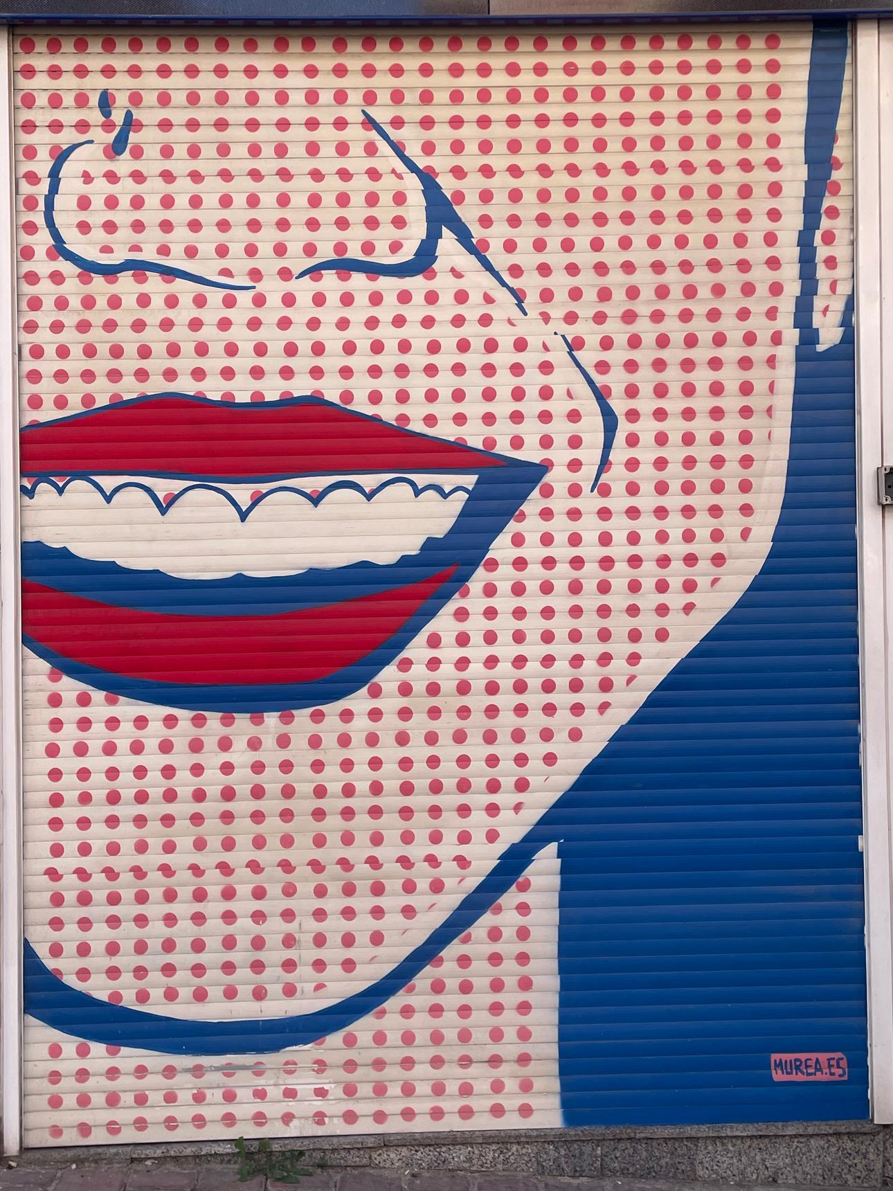 This image shows a mural featuring a Pop Art Lichtensein style face with polka dots.