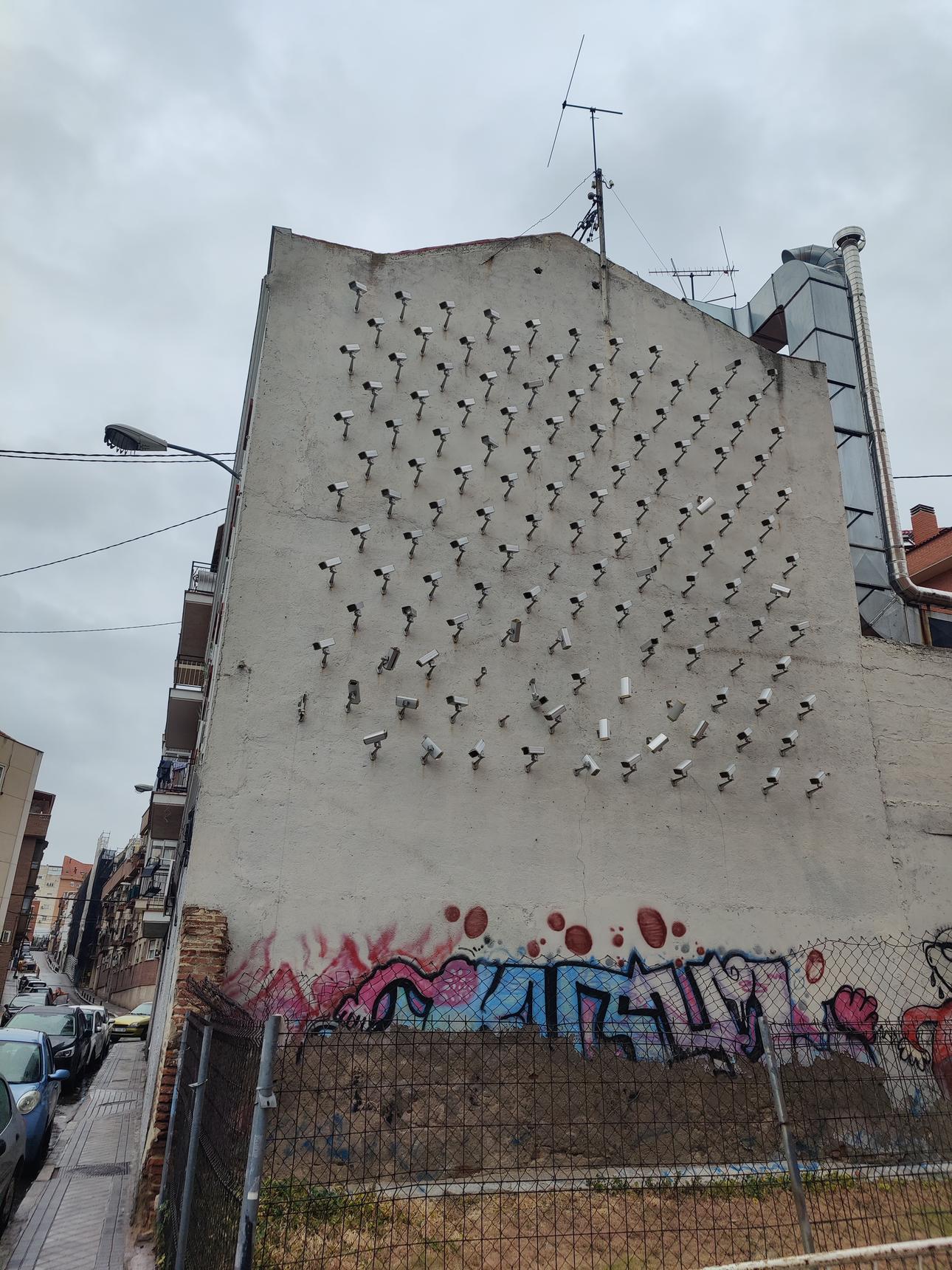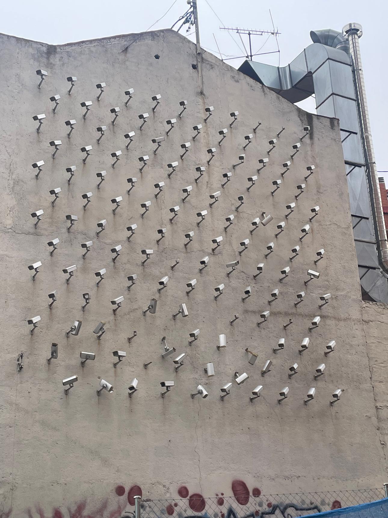 The work consists of 150 security cameras installed on the façade of a building.
