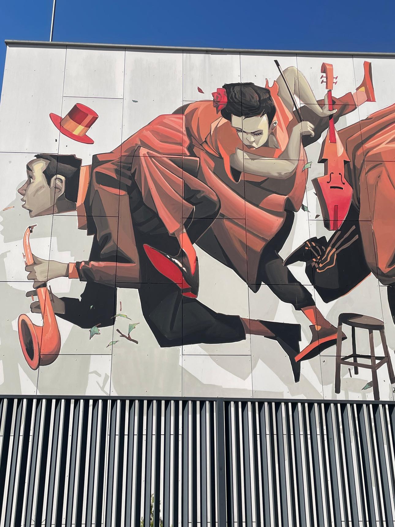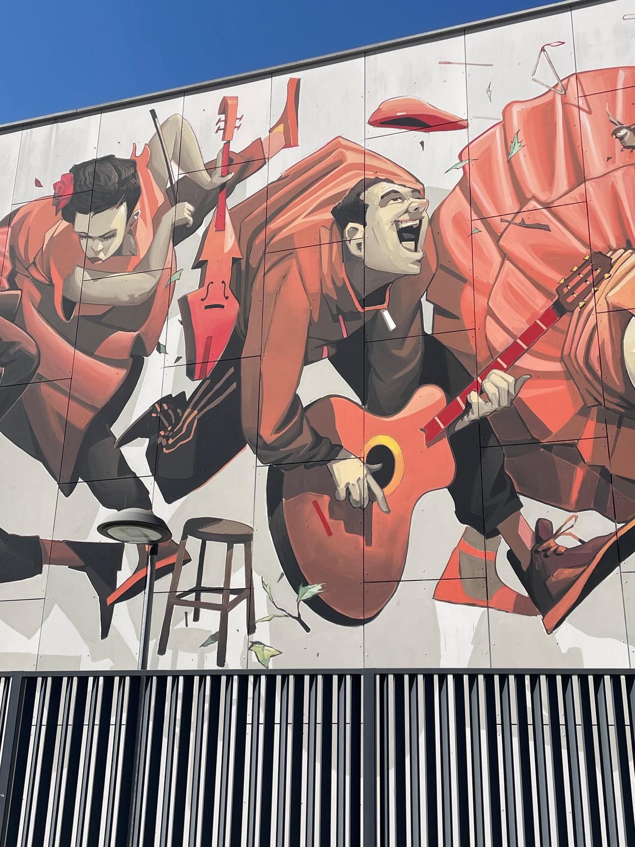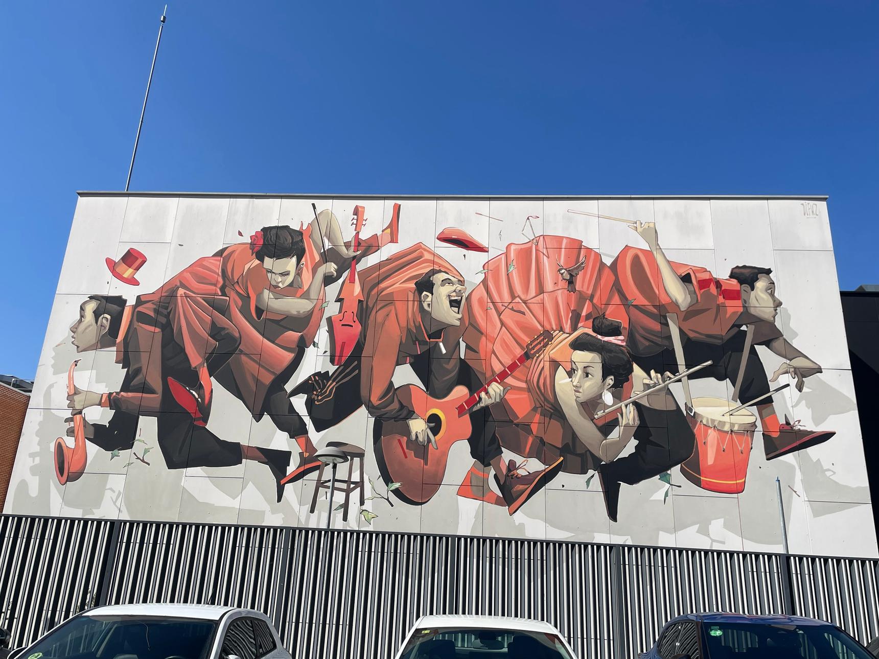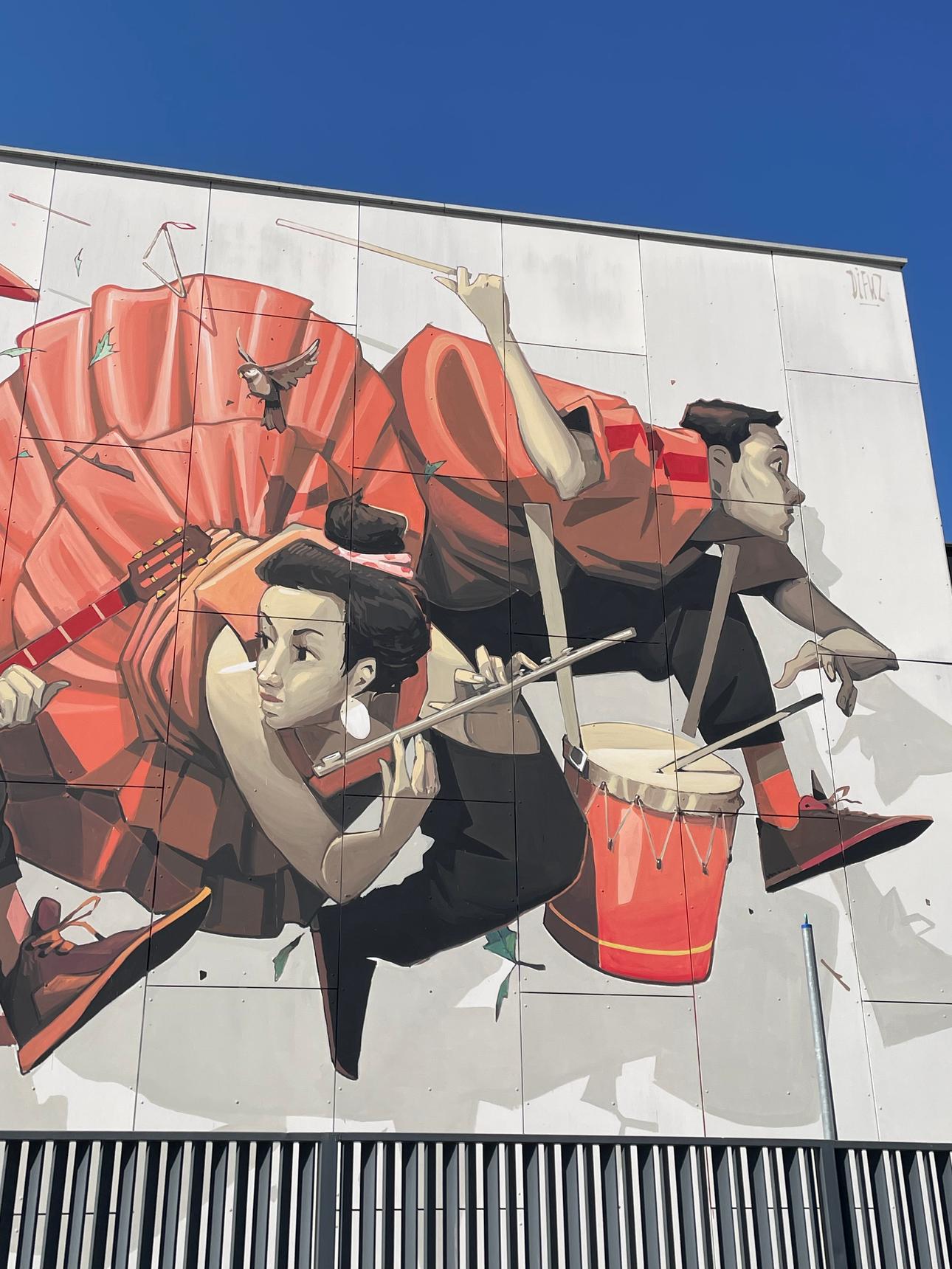 Red path ("Camino rojo"), descrition from the artist: "I started creating compositions that focus on figures in flight and motion. Each mural is deeply connected to its location; here in Moratalaz, I took inspiration from the colors of the music school and the local architecture. These figures fly, dance, and convey emotions, bridging the gap between the individual and the collective. It’s a piece that reflects my personal experience and my dialogue with the neighborhood"