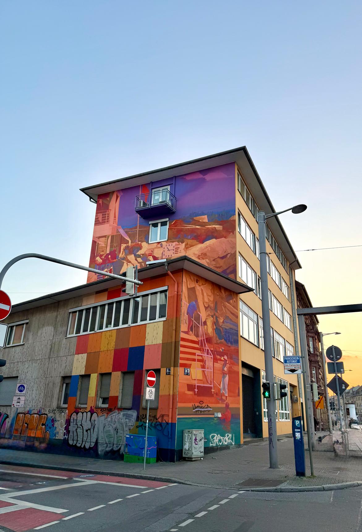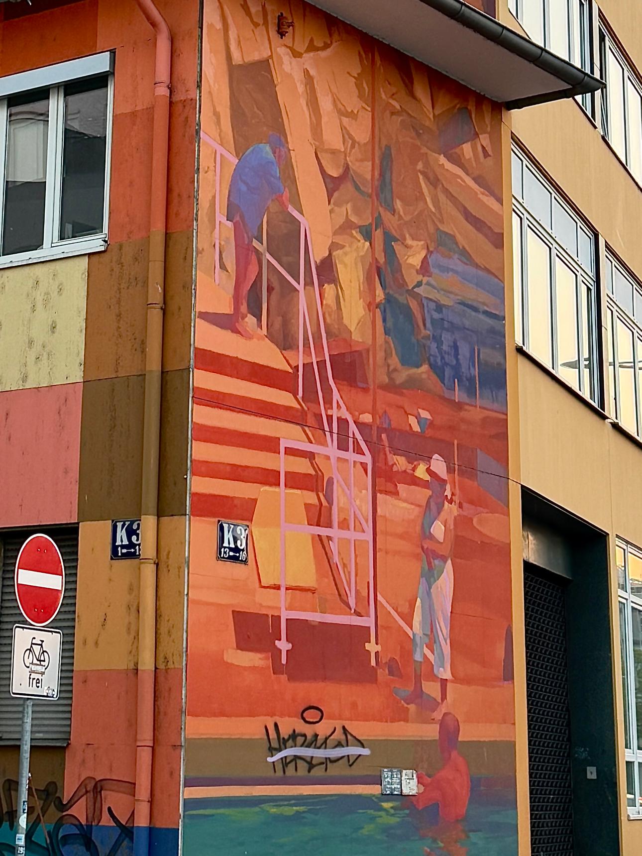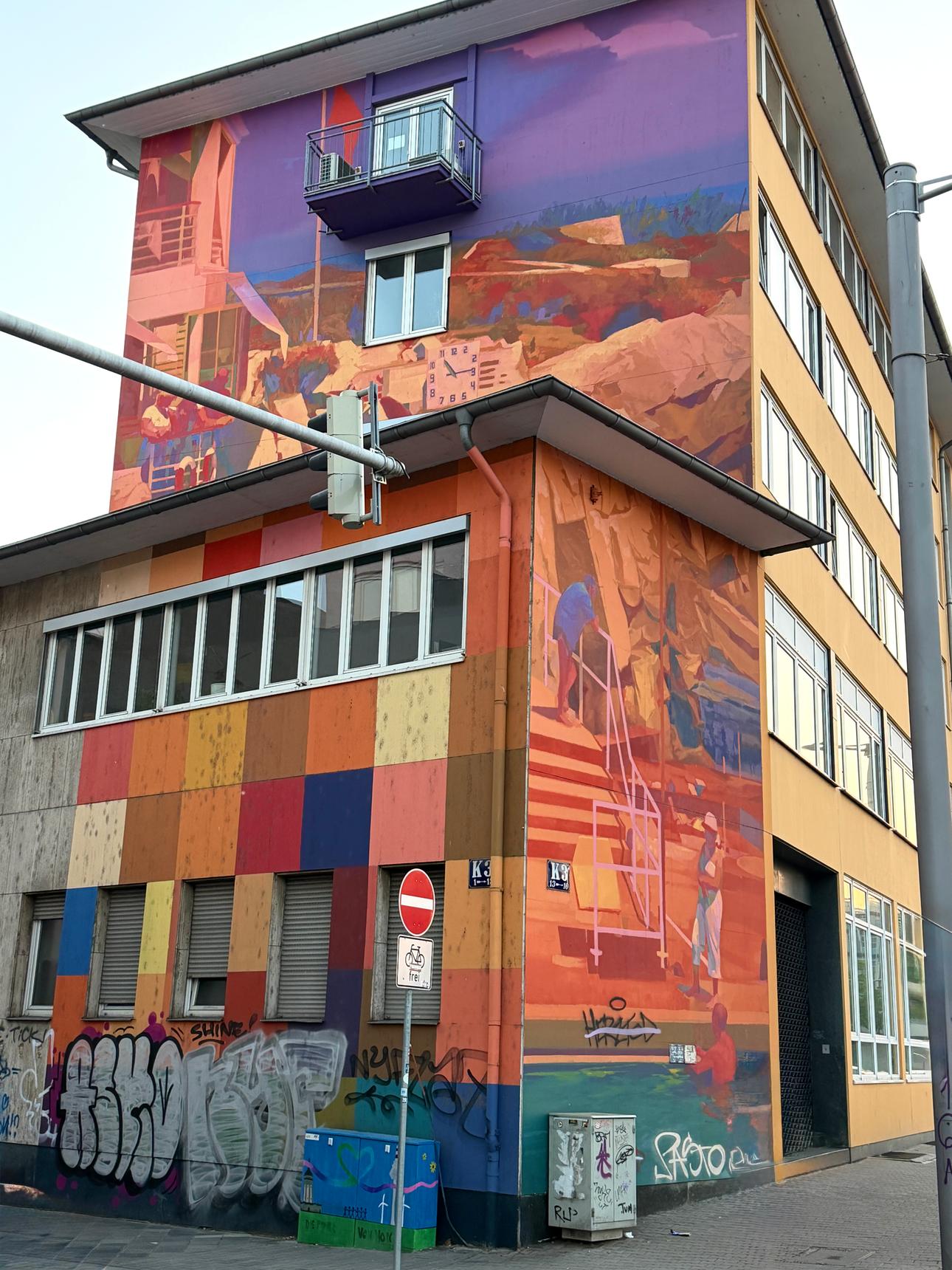 This mural depicts a luxurious resort set against a pristine natural landscape and marks a shift in the artist’s style toward nature-inspired motifs. It combines personal reflections during the lockdown with social commentary. The central message: Humans should live in harmony with nature rather than trying to control it—otherwise, unpredictable consequences may ensue.