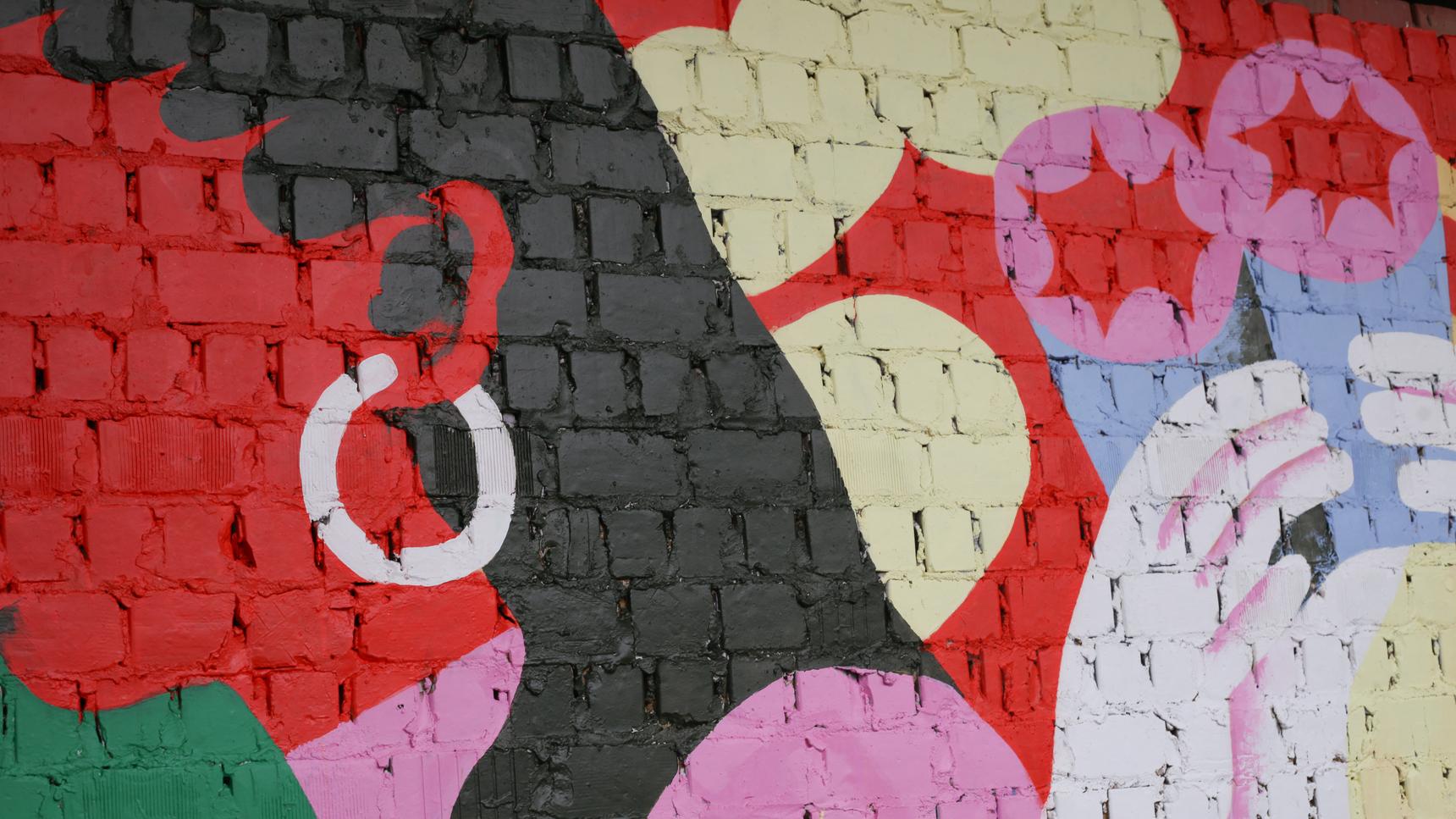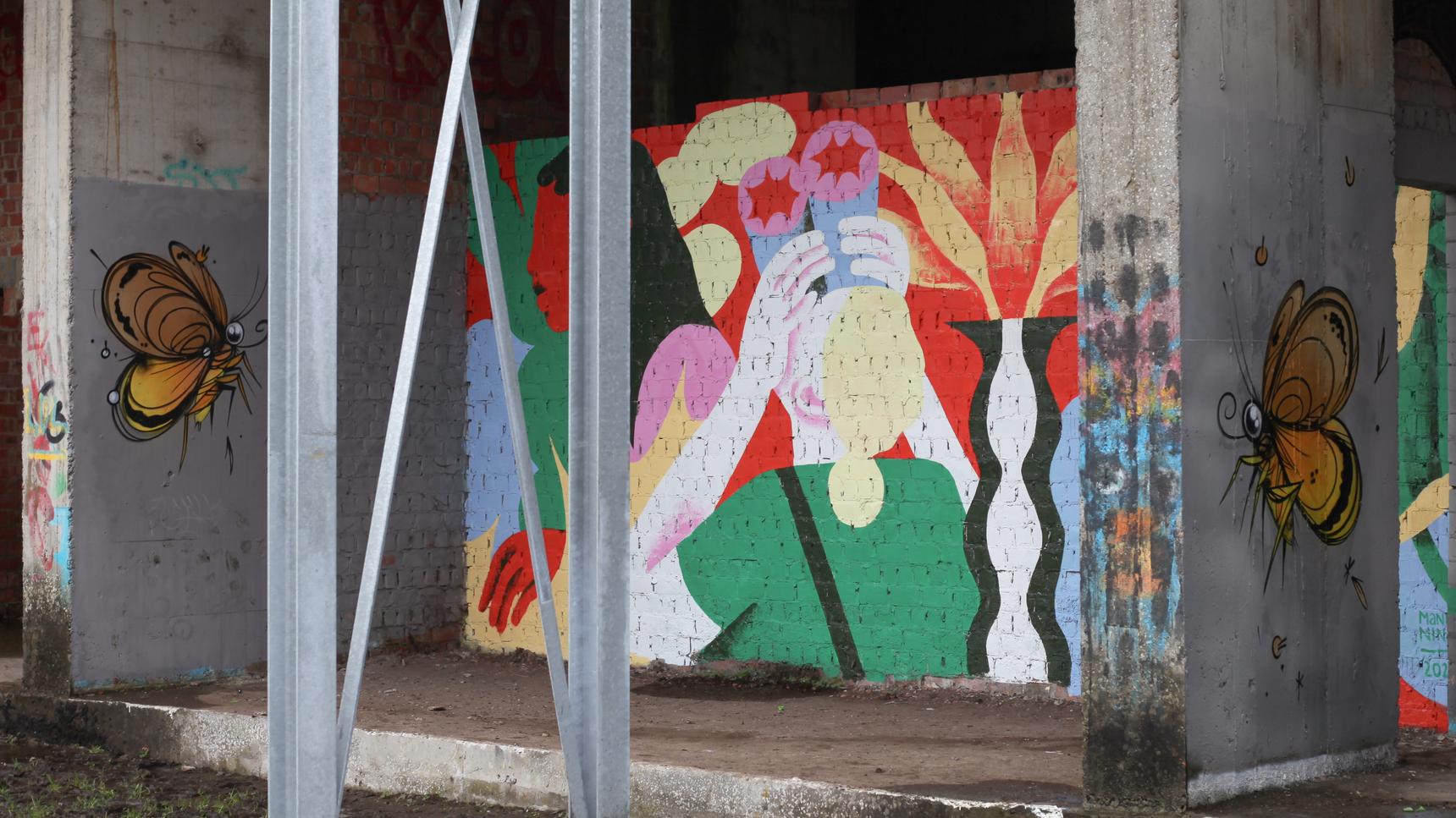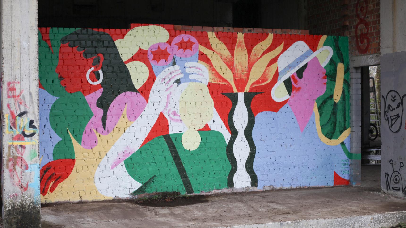 Muurschildering voor het Vrijbroekpark in Mechelen, ter ere van de eerste verjaardag van de hotelruïne, een ooit verlaten terrein dat is omgevormd tot een culturele plek.