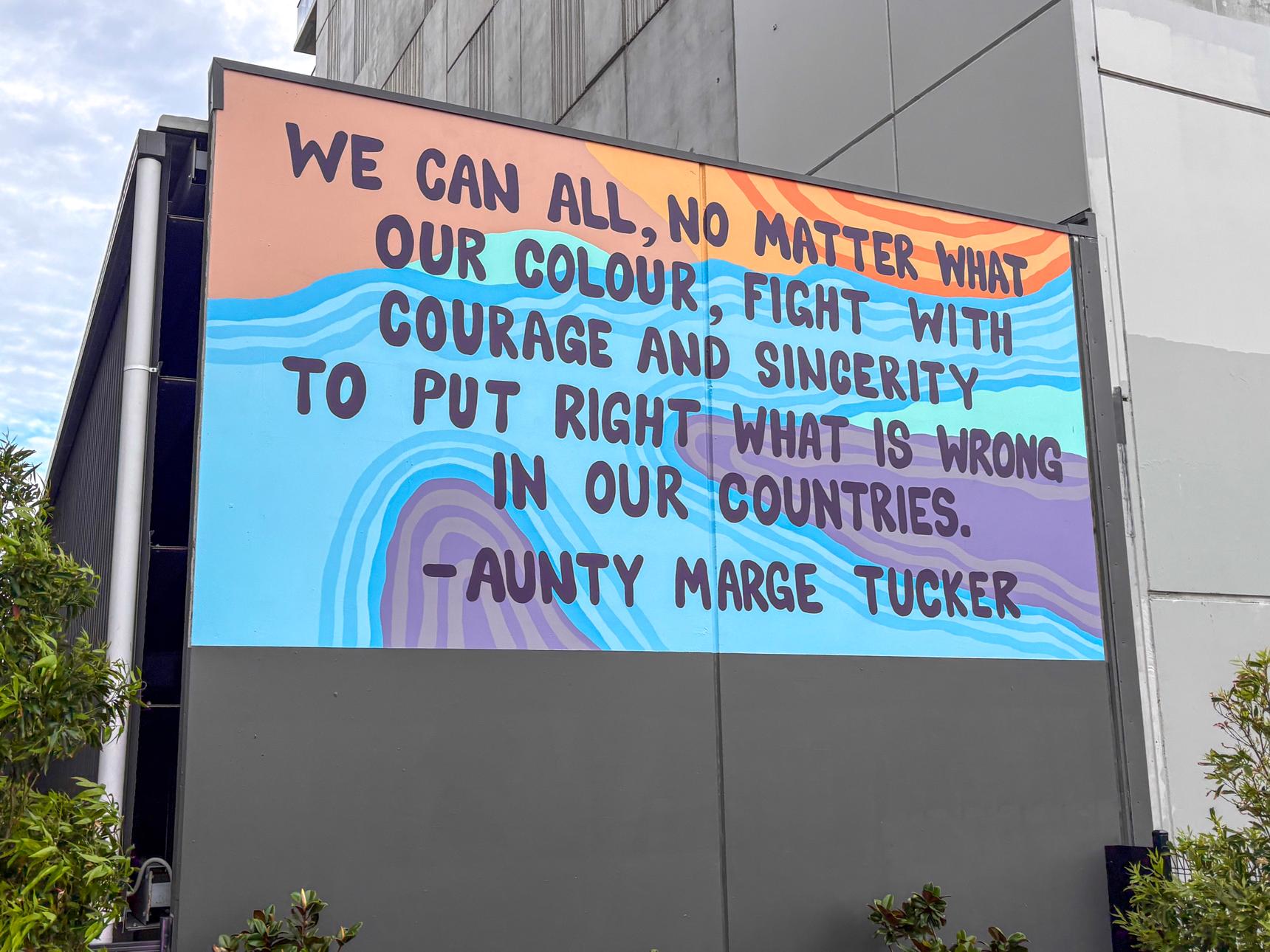 This mural honours the life and legacy of Aunty Margaret (Lilardia) Tucker MBE (Aunty Marge), one of Australia’s earliest female Aboriginal activists.