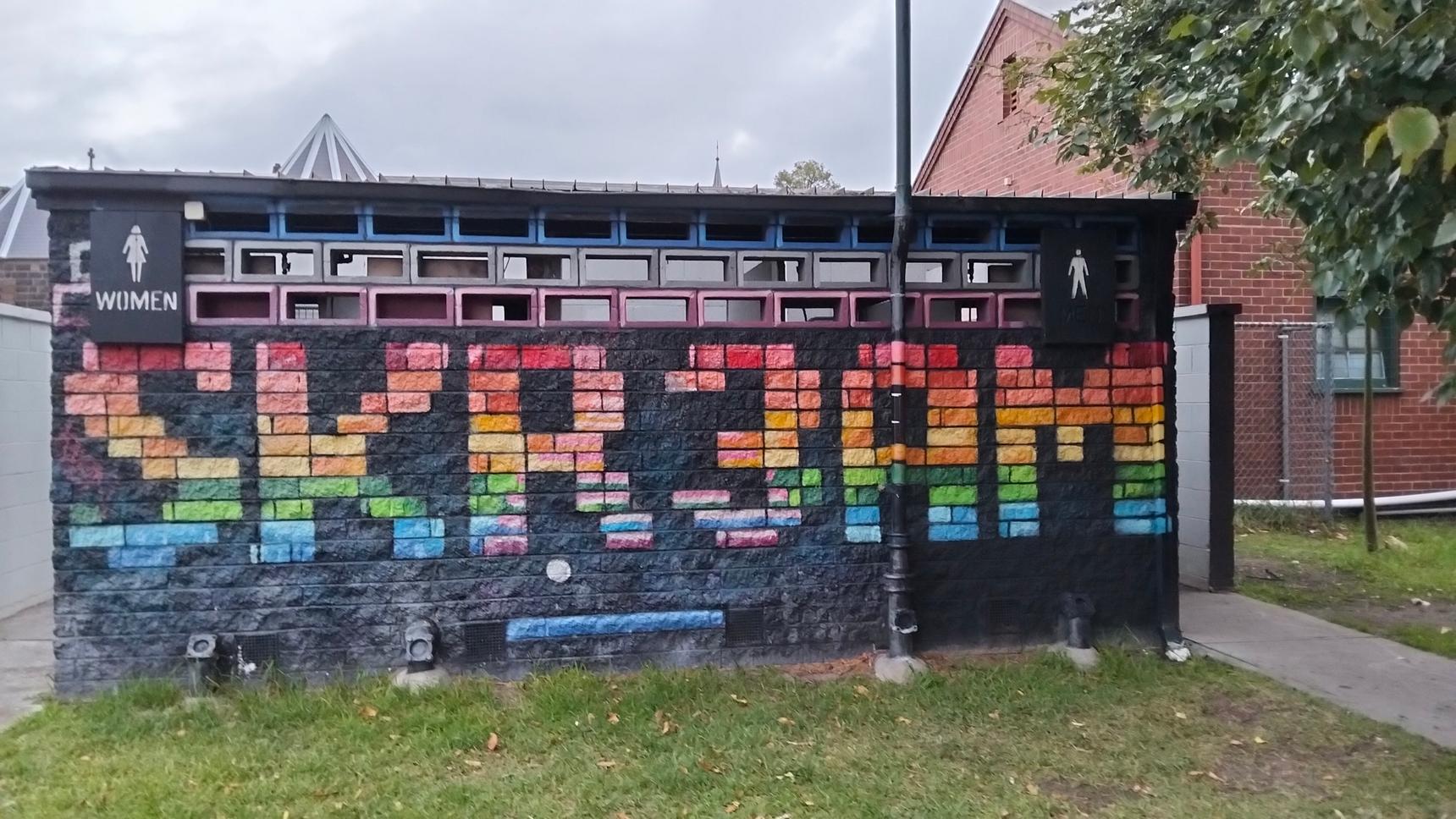 multicoloured (LGBTQI+) writing of the artist's 'nom de paint' on toilet block