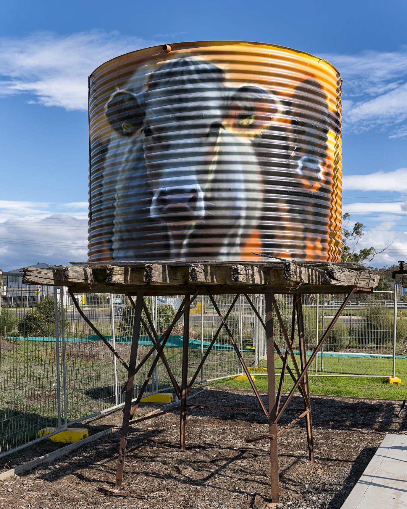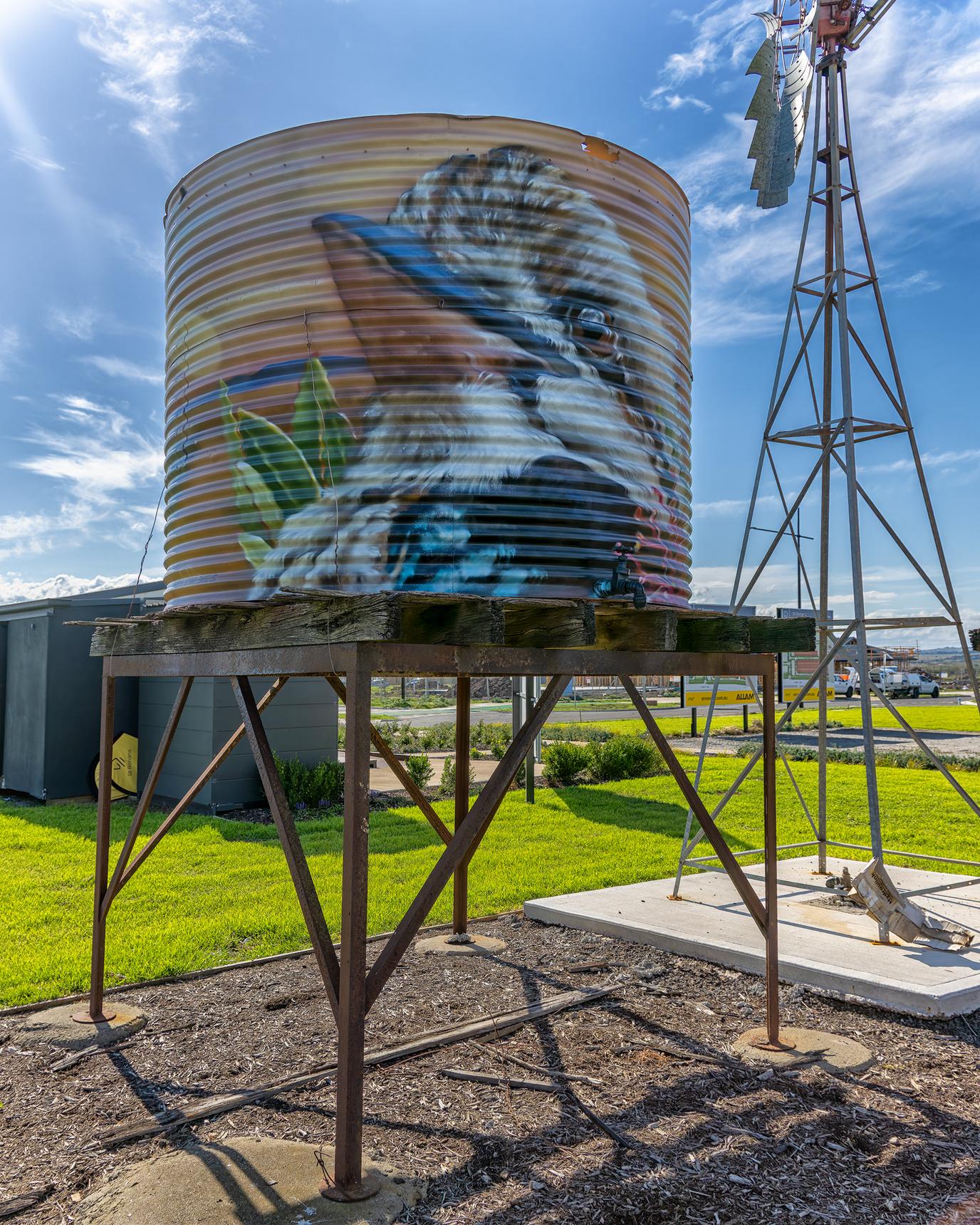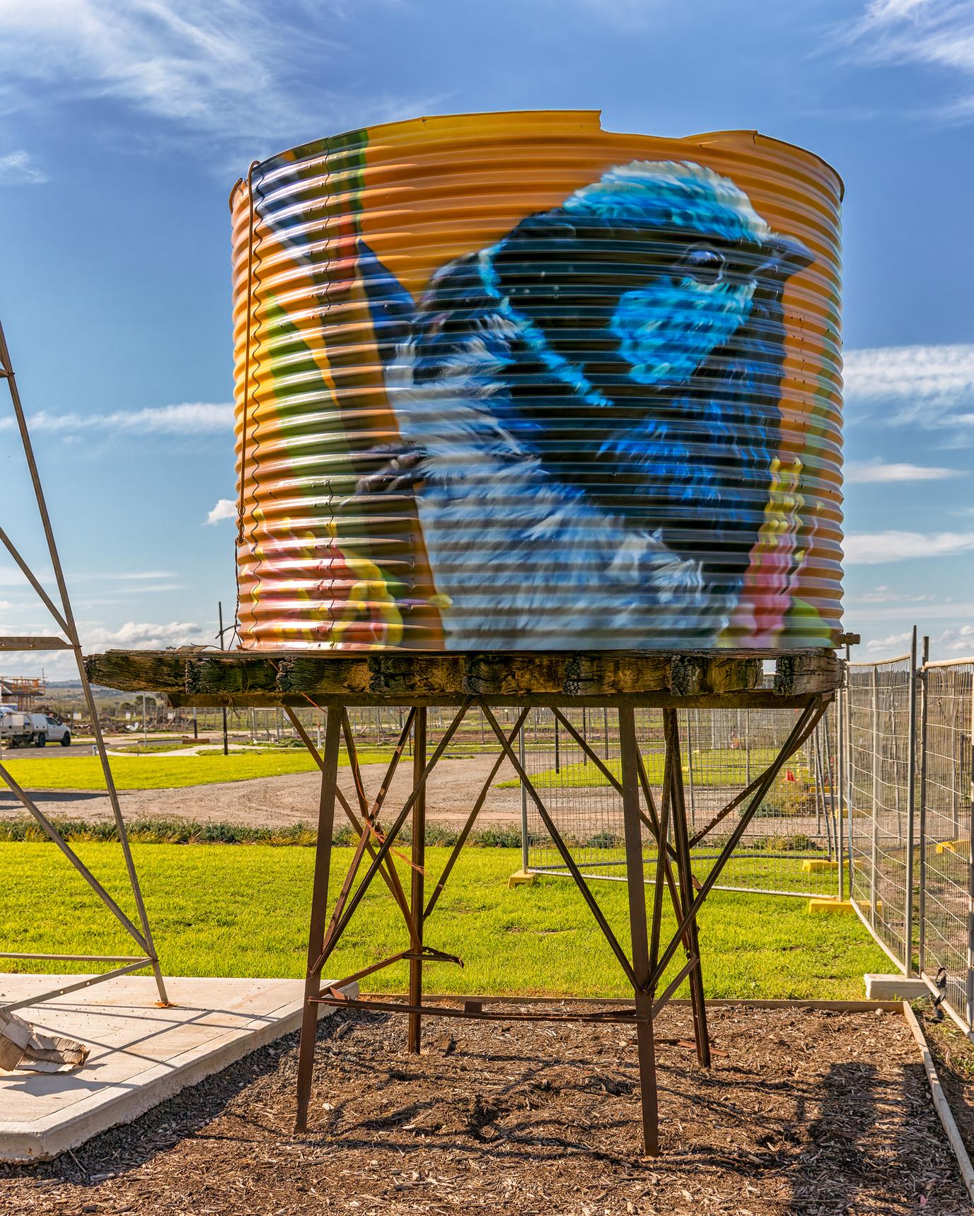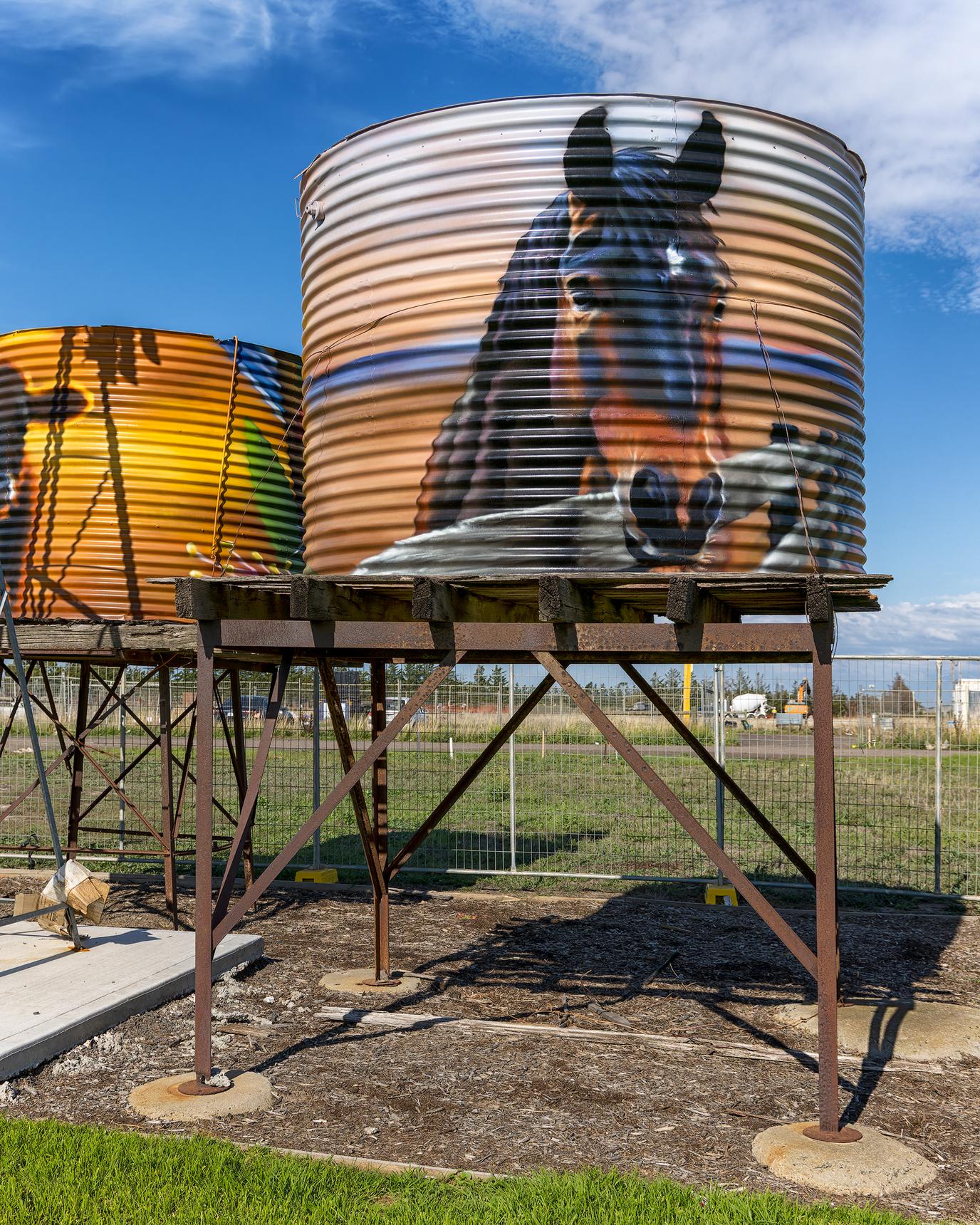 These two old water tanks on the Sunbury Road feature some gorgeous cows, a horse, a Superb Fairywren and a Laughing Kookaburra.
