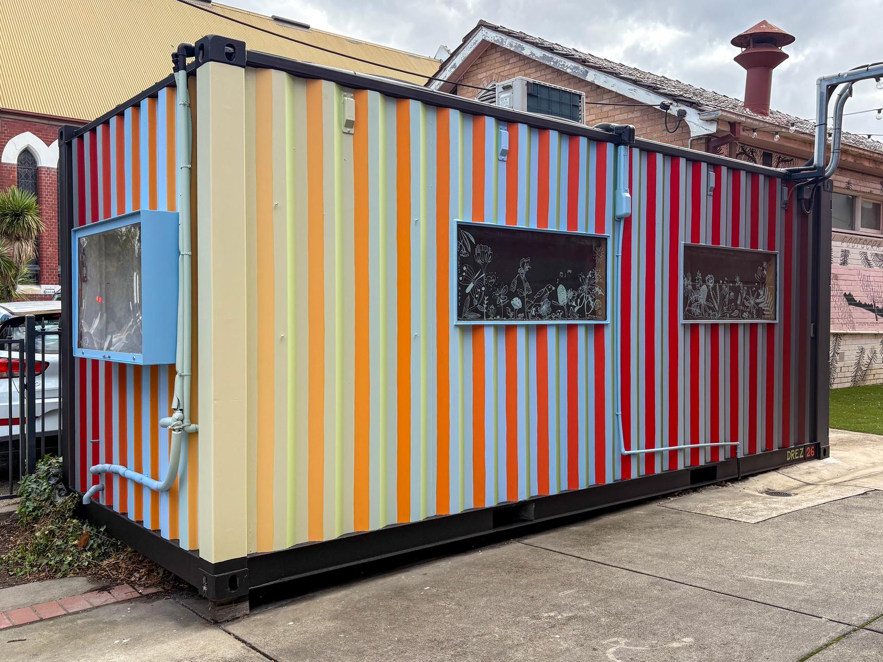 This artwork can be found at the Footscray Community Arts Box next to the Footscray Library. There are smaller artworks on the windows by Nahbananas.