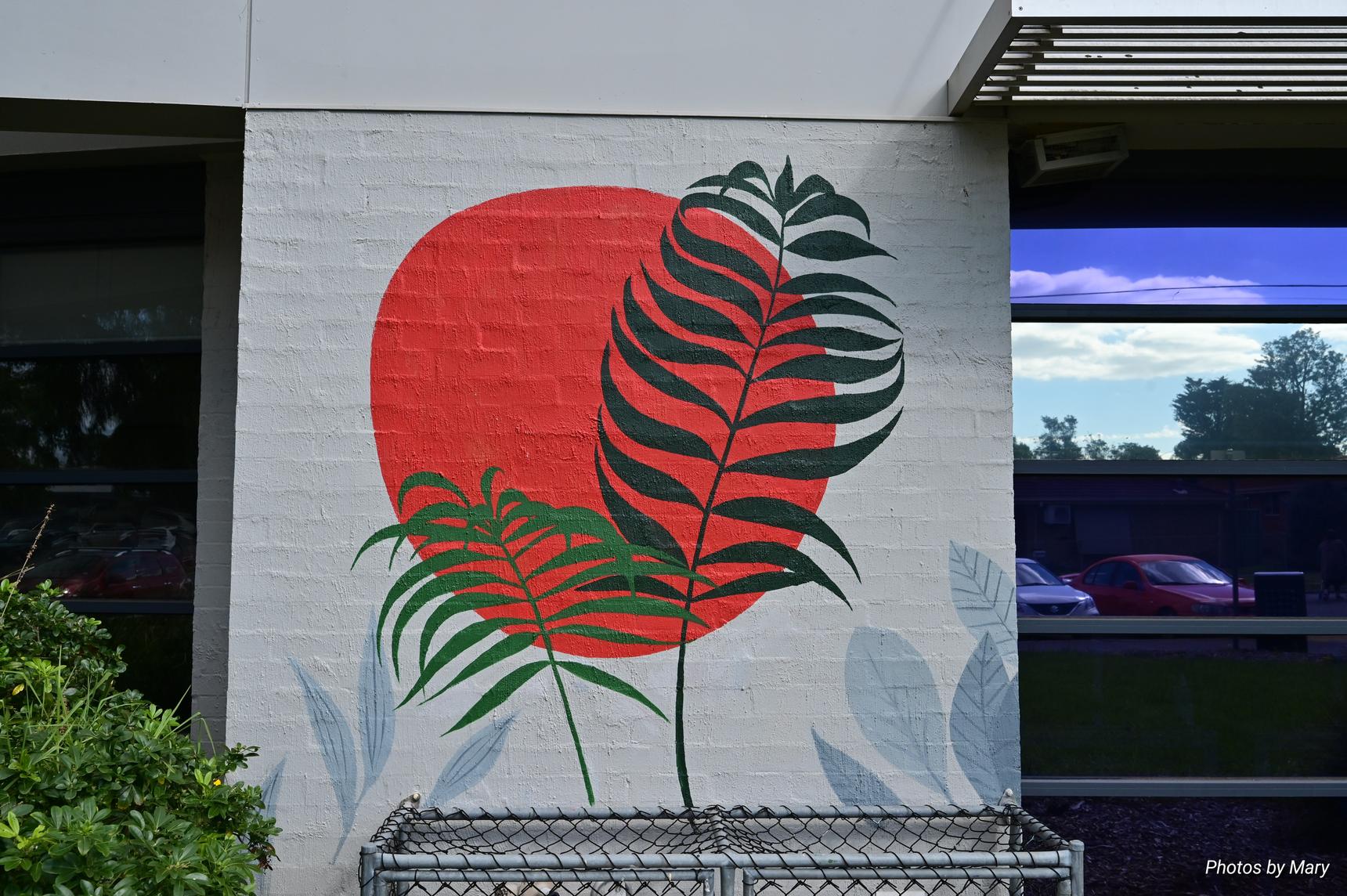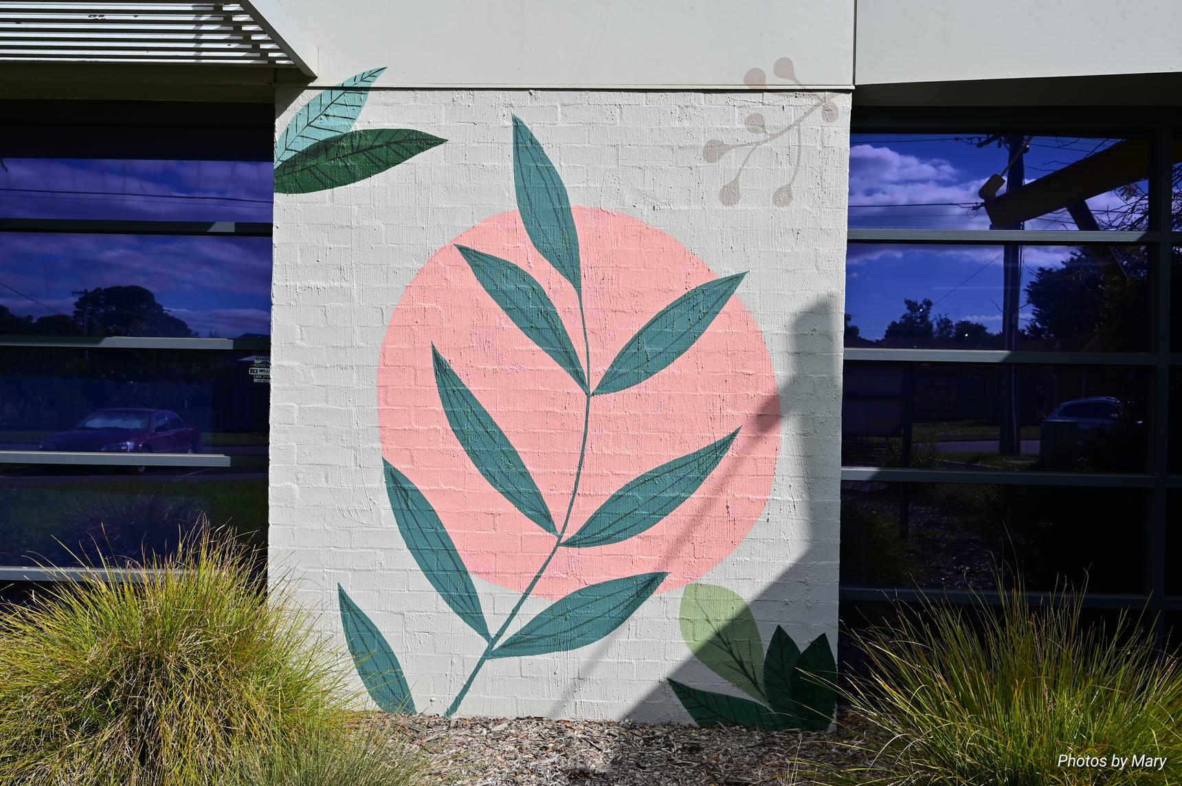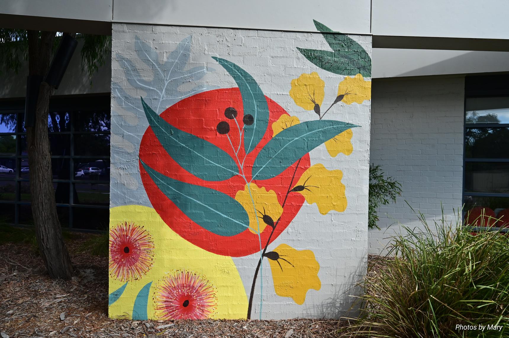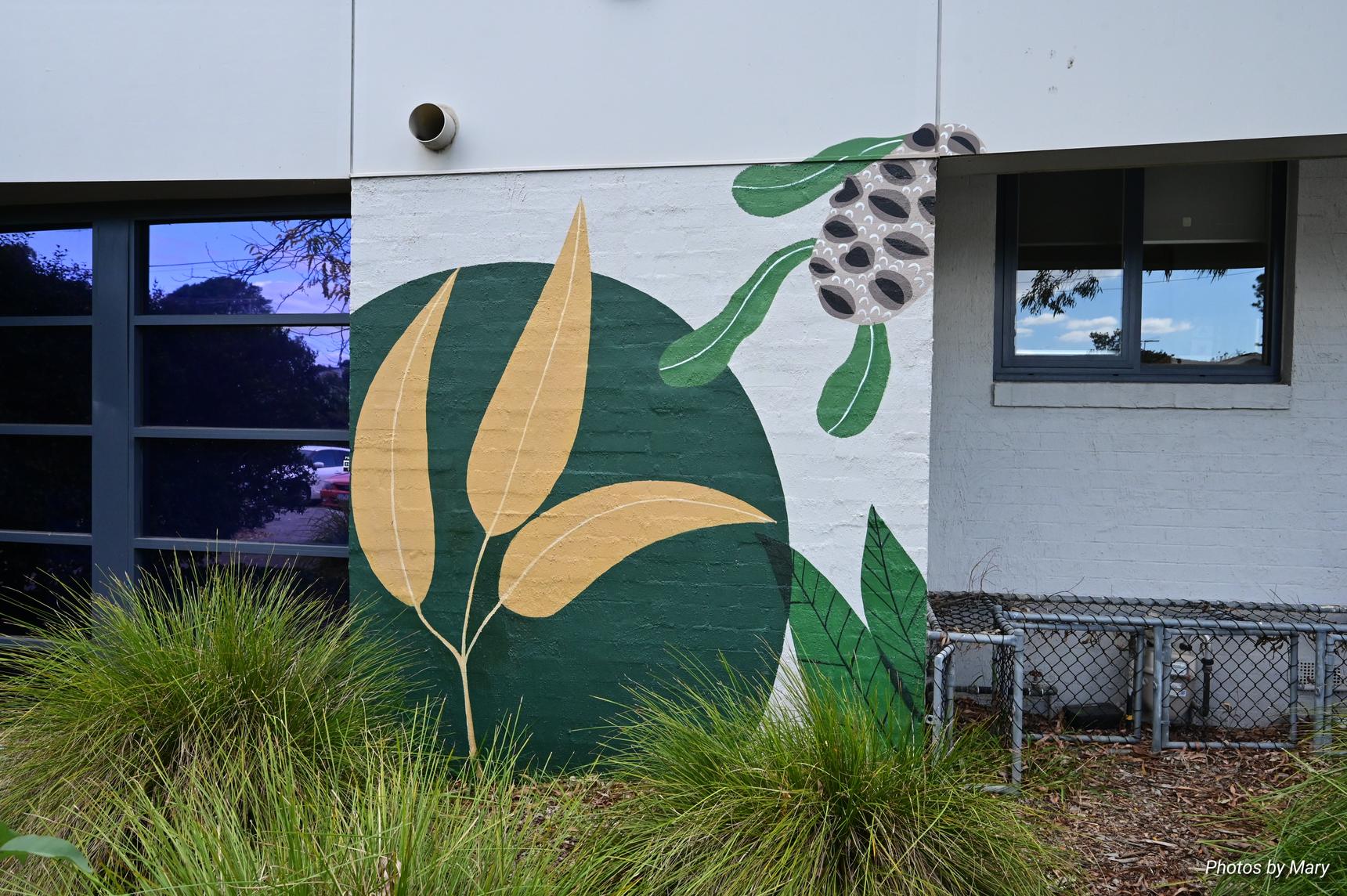 Various murals placed around the building featuring plants and abstract art