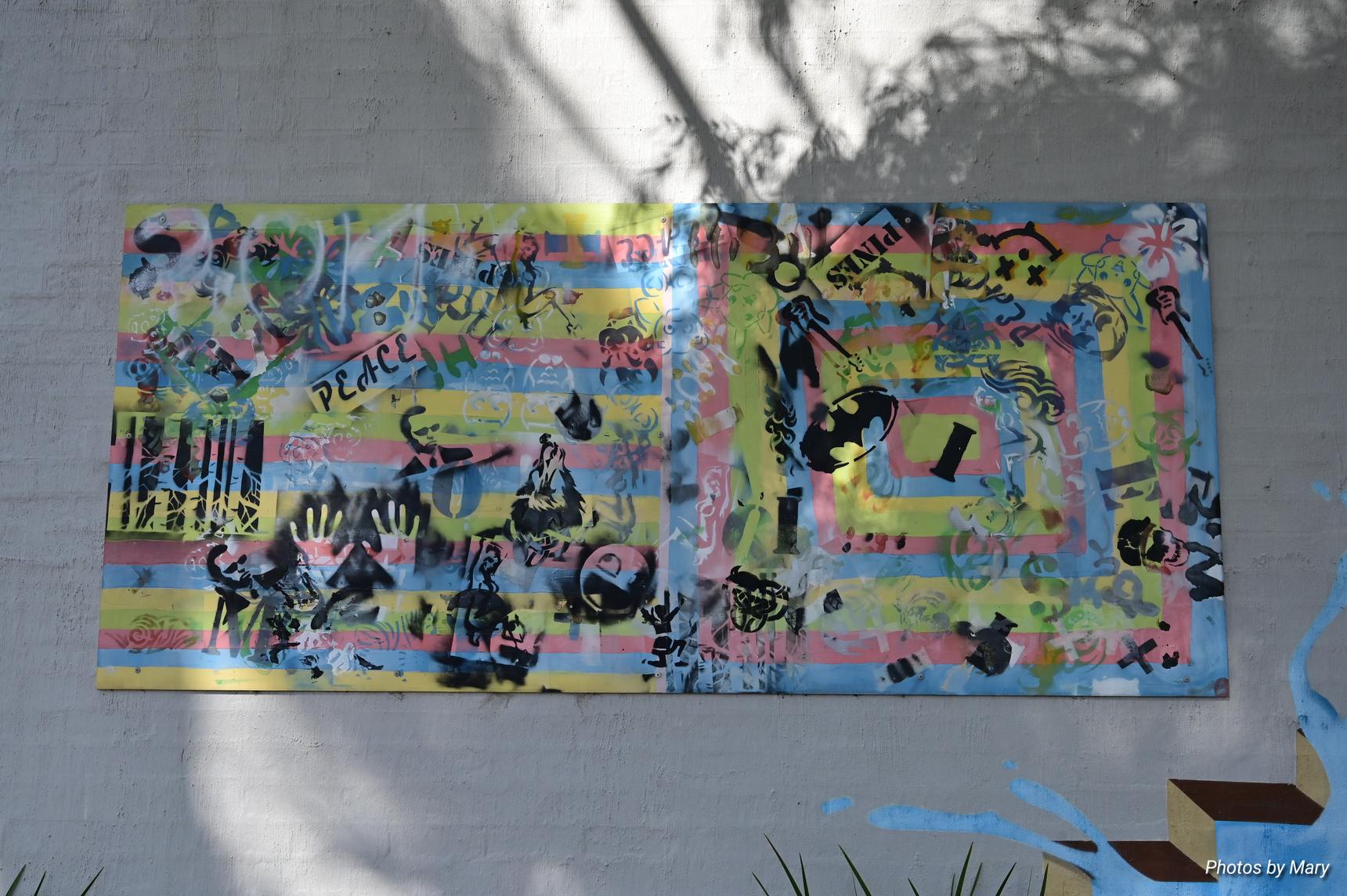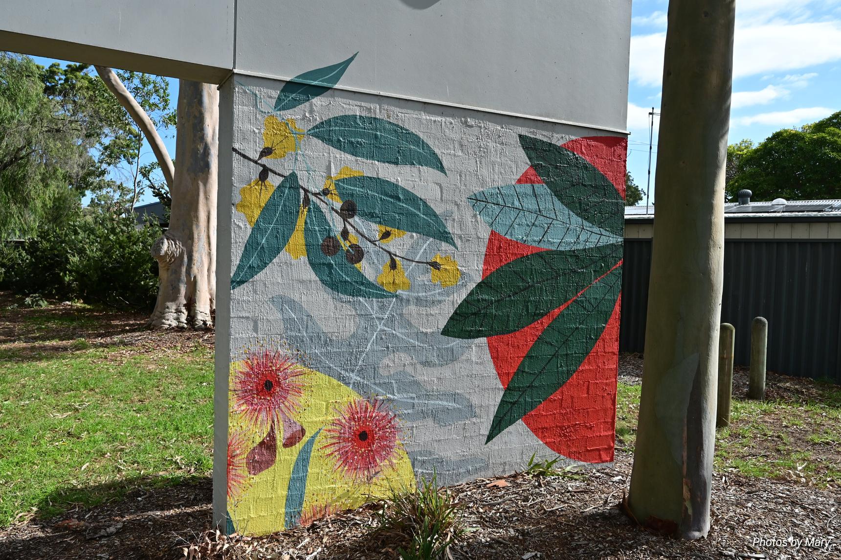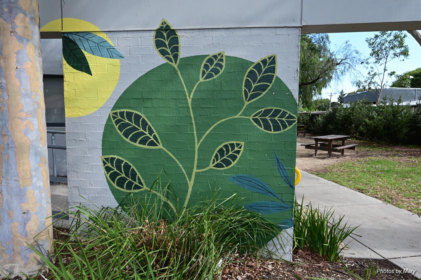 Various murals placed around the building featuring plants and abstract art