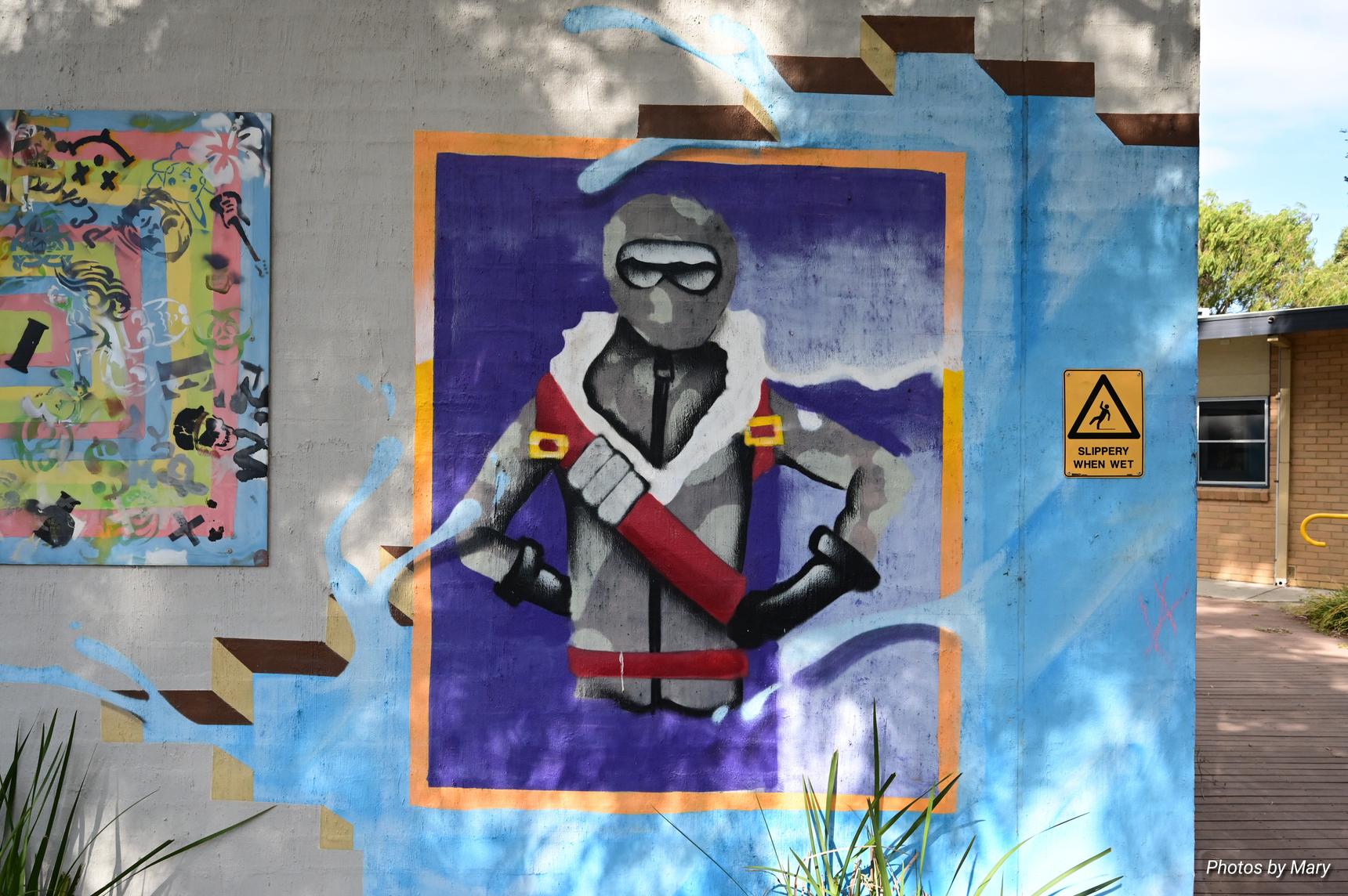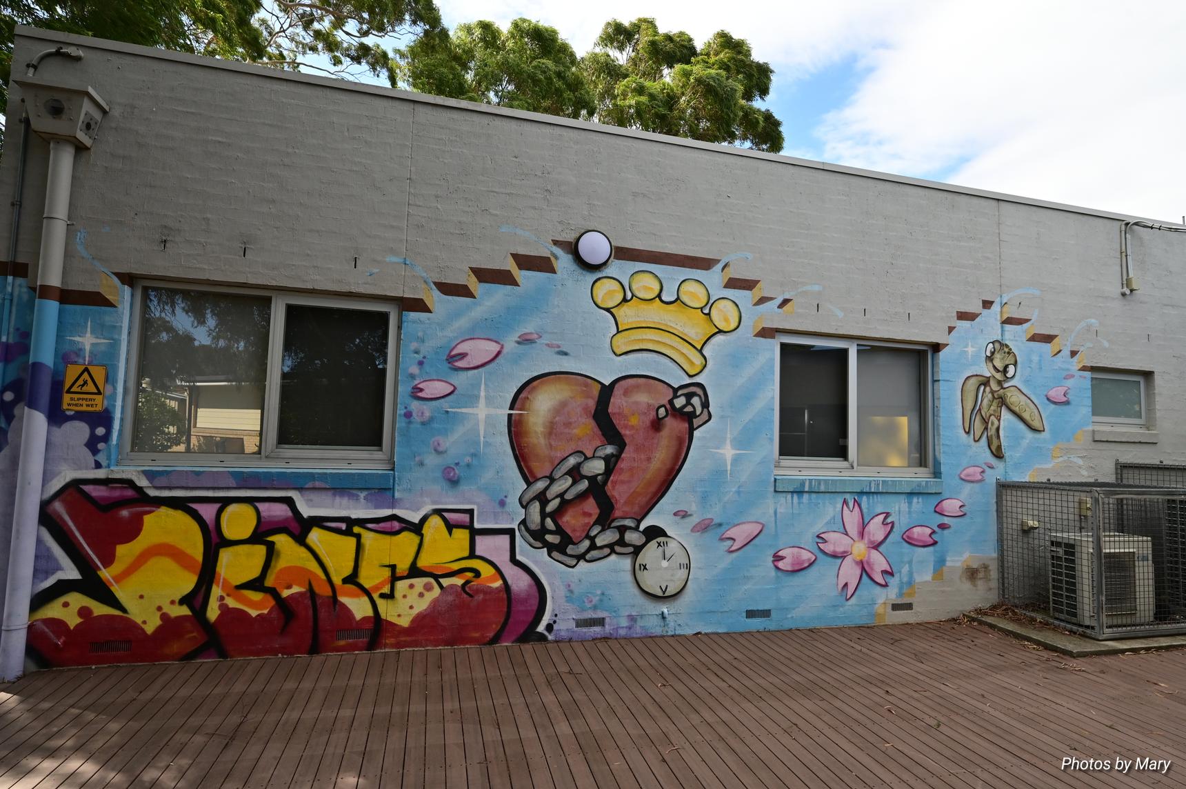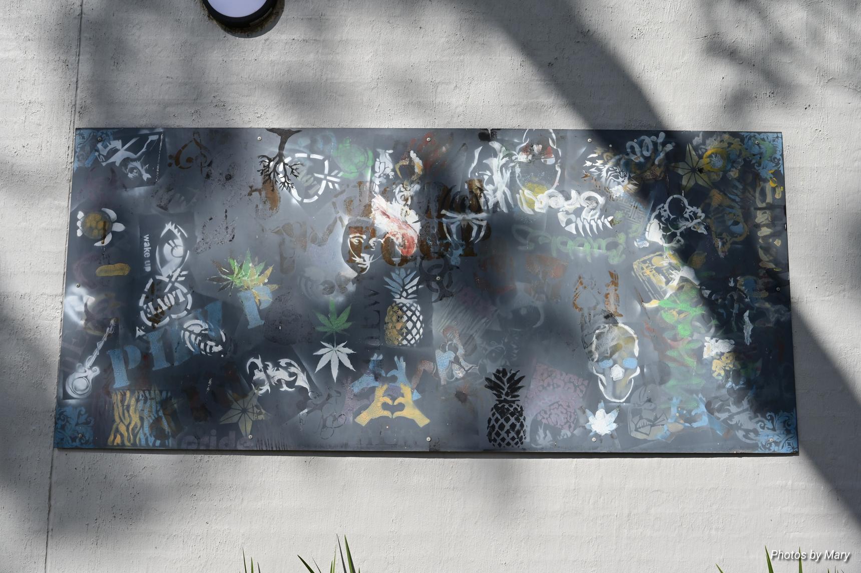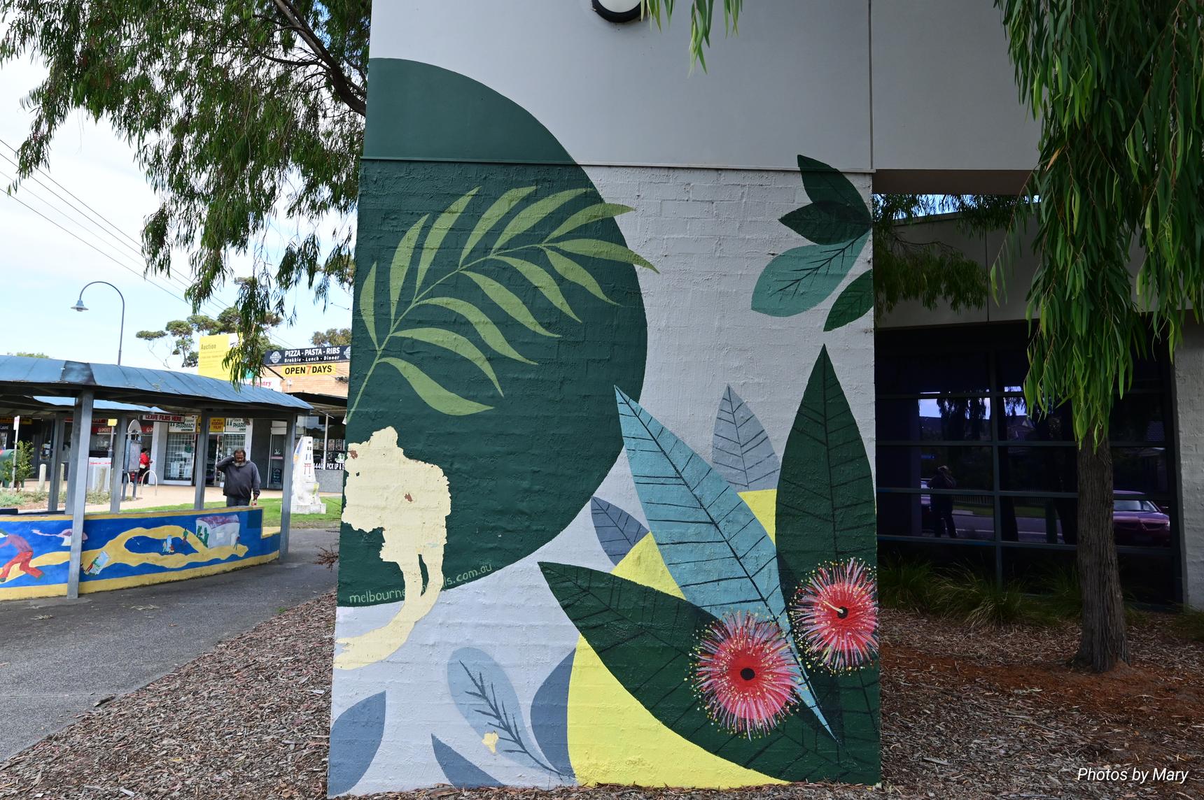 Various murals placed around the building featuring plants and abstract art