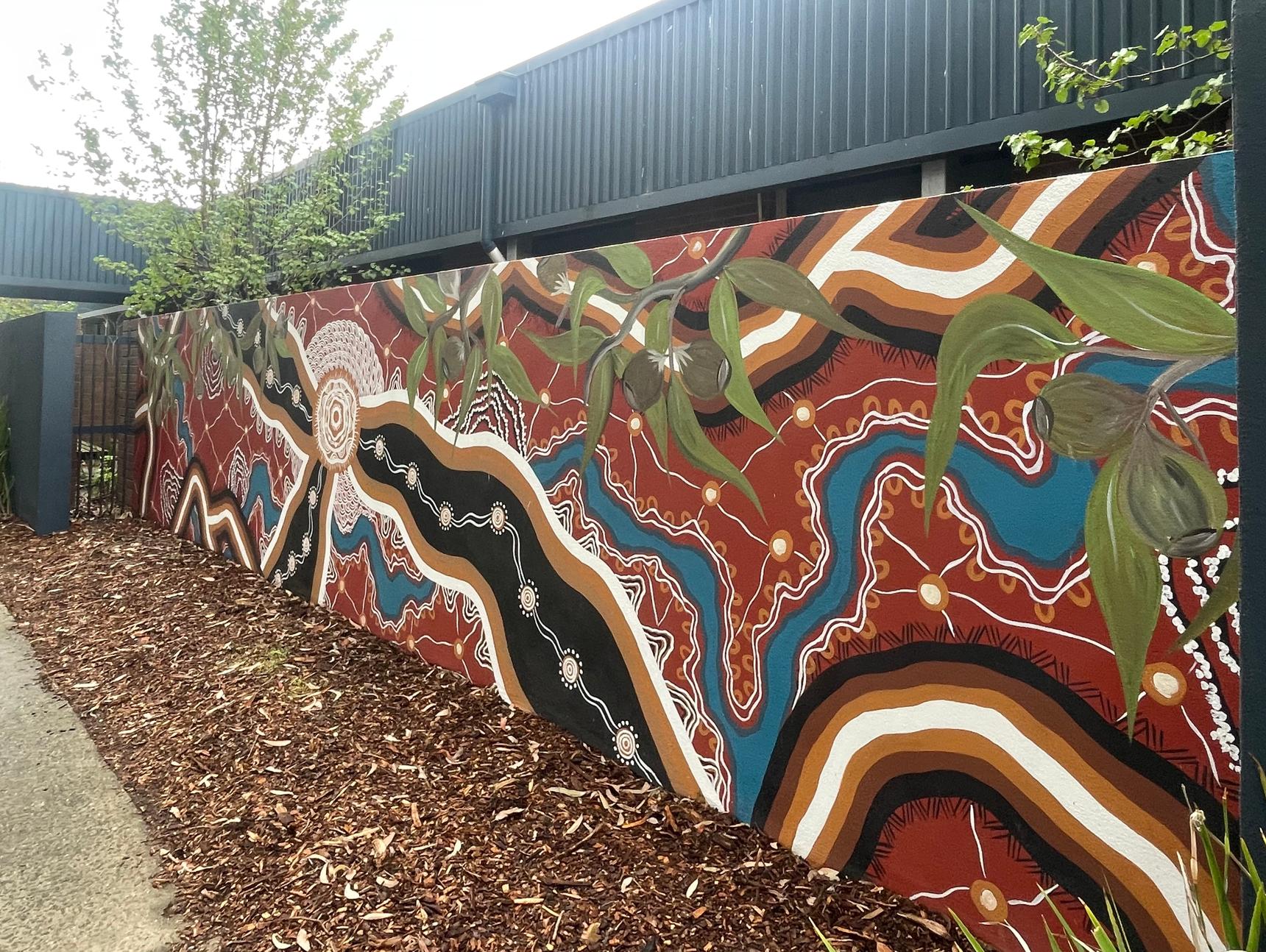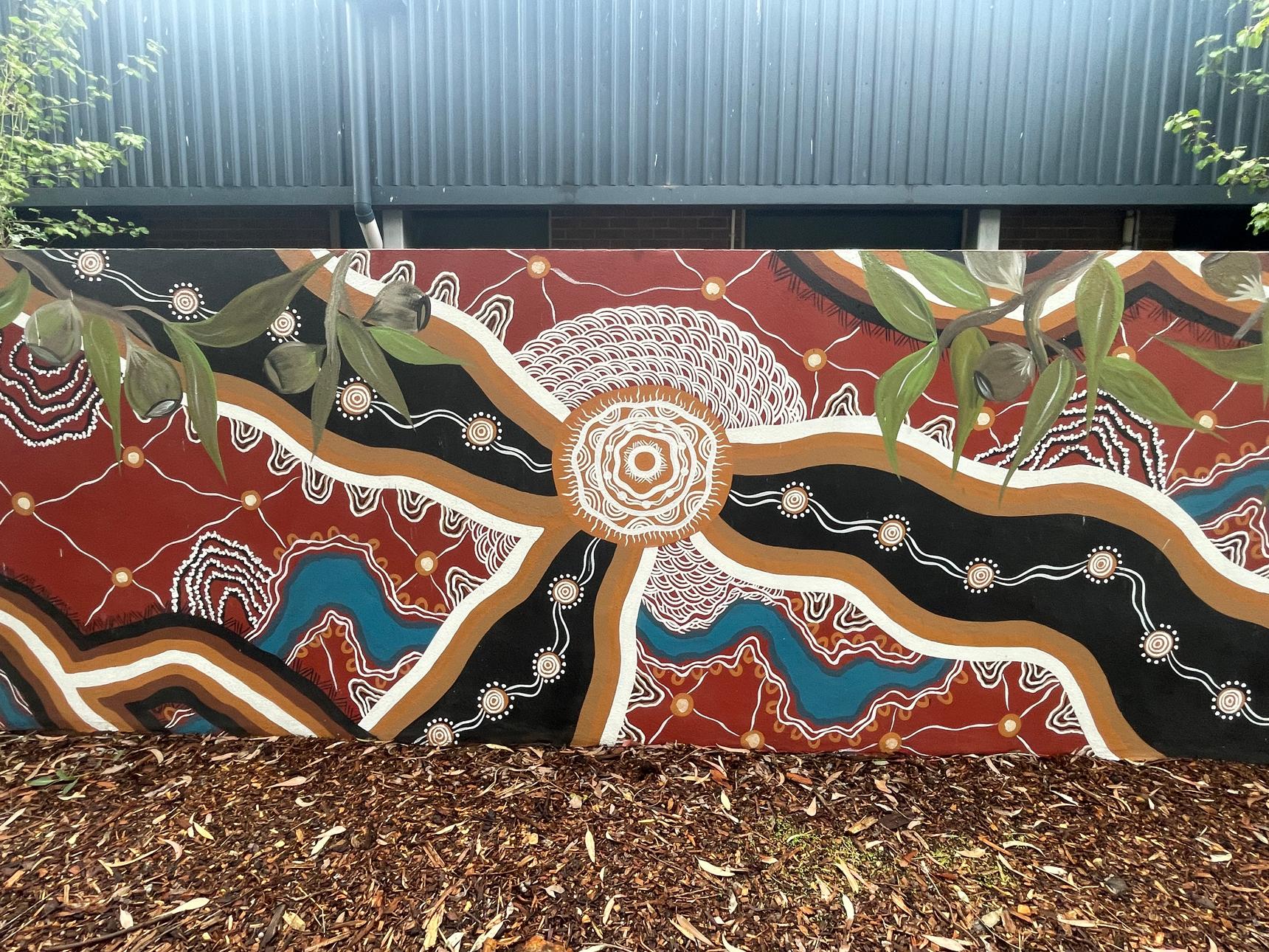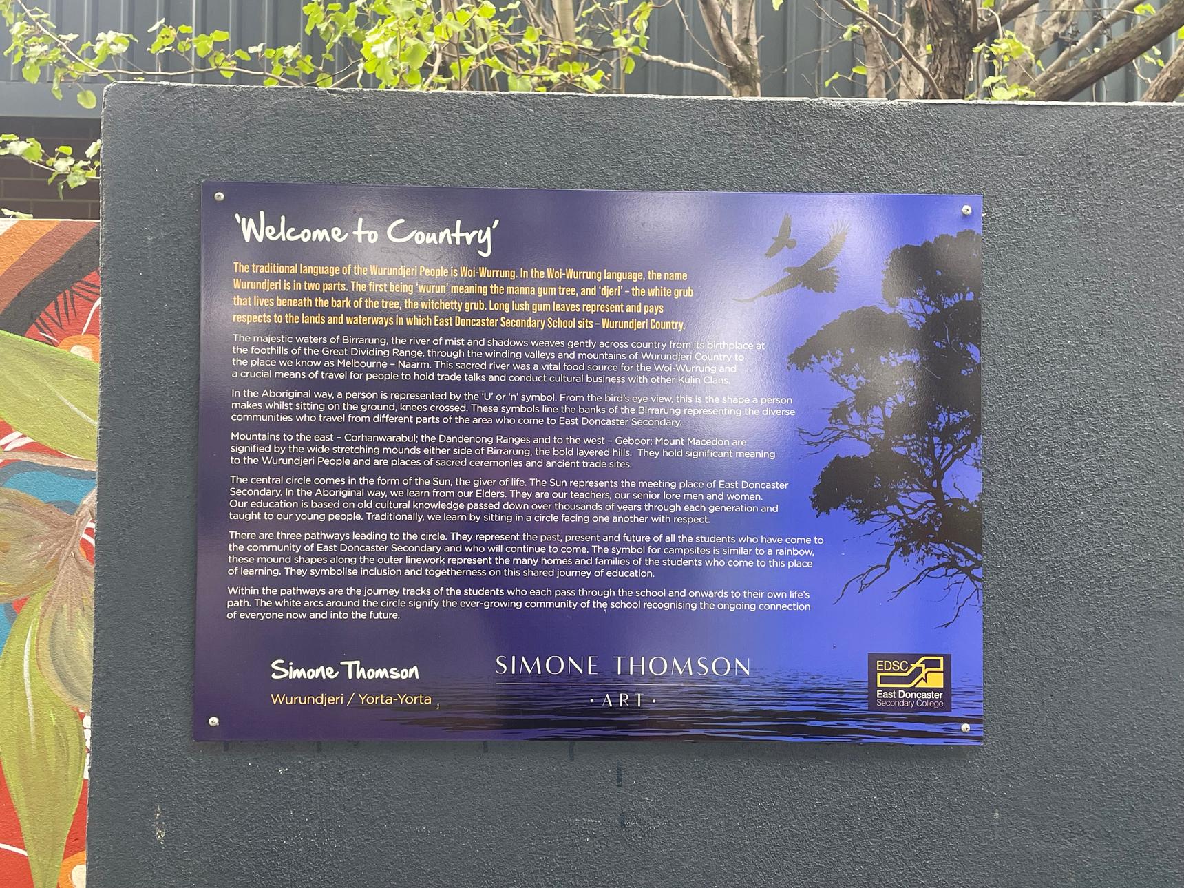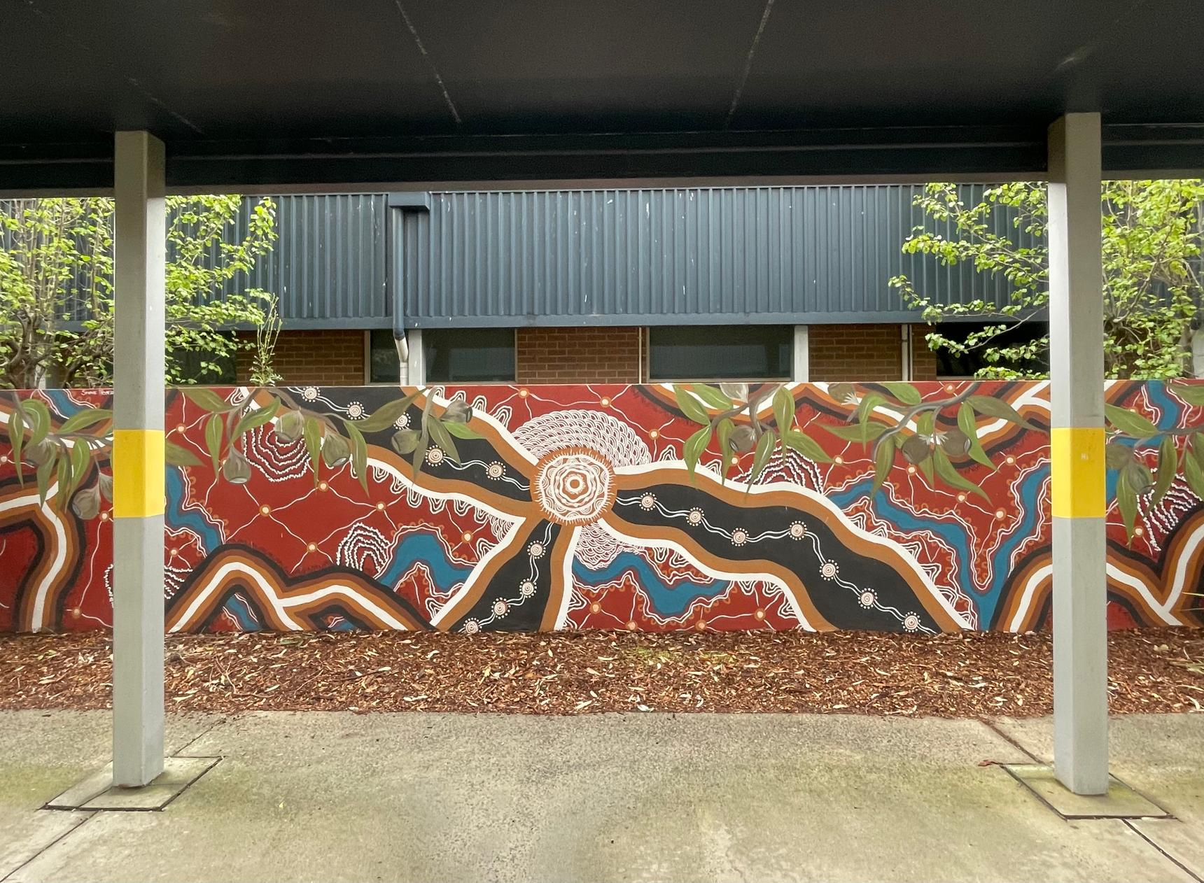 ‘Welcome to Country’ mural by Simone Thomson at East Doncaster Secondary College. The artwork is visible from the main road