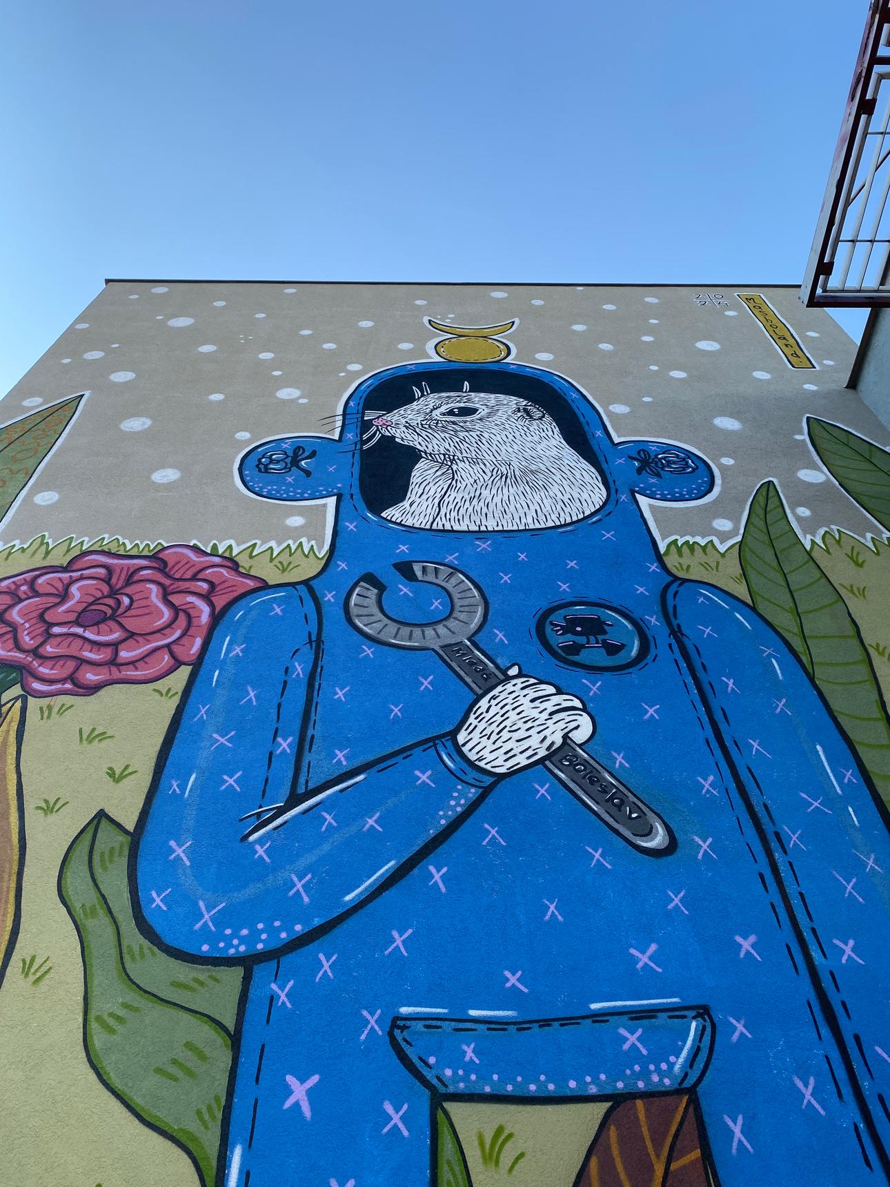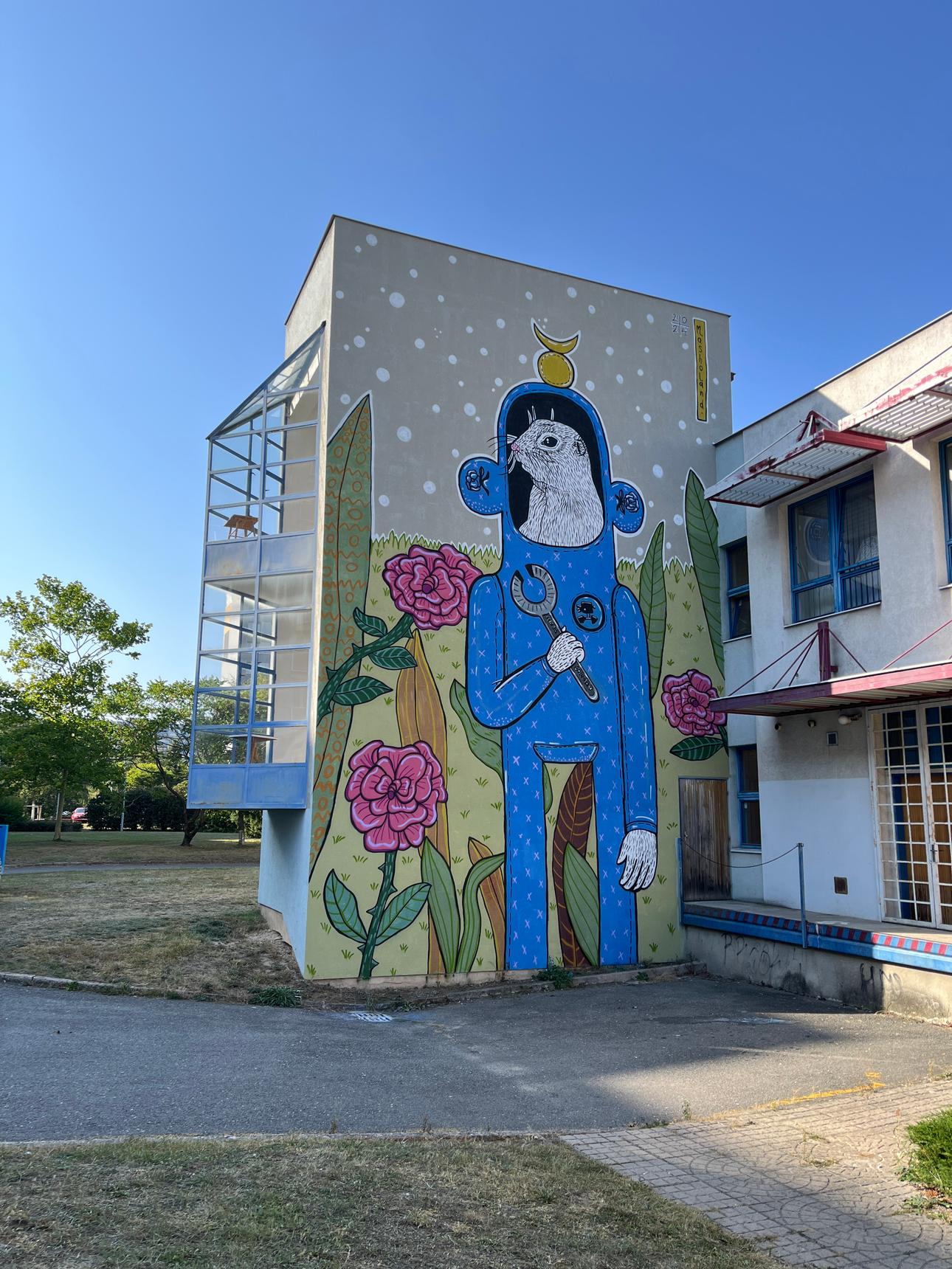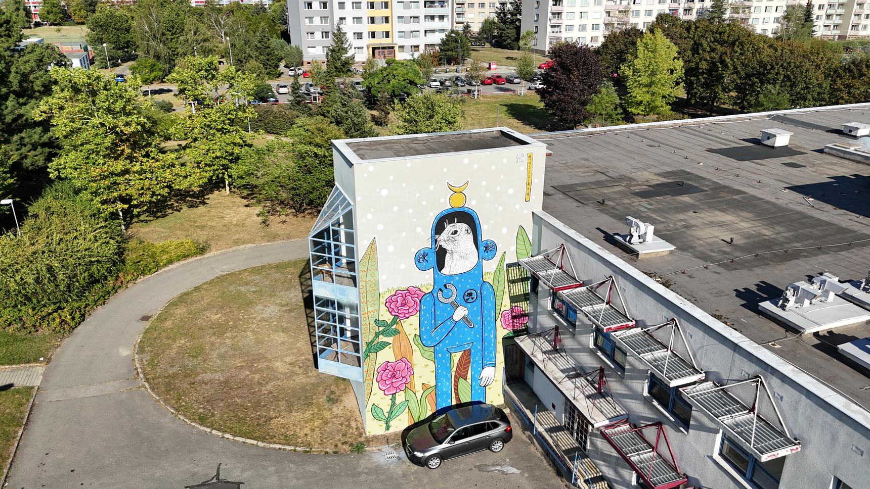 The second mural by Masho Marg (AKA Masholand) from the Město=Galerie Urban Art Festival in Mlada Boleslav, Czech Republic. Even though this type of animal is quite common in the Bohemia region, this foxy ground squirrel is no ordinary creature - it has alchemist knowledge and works at Škoda factory 🏭