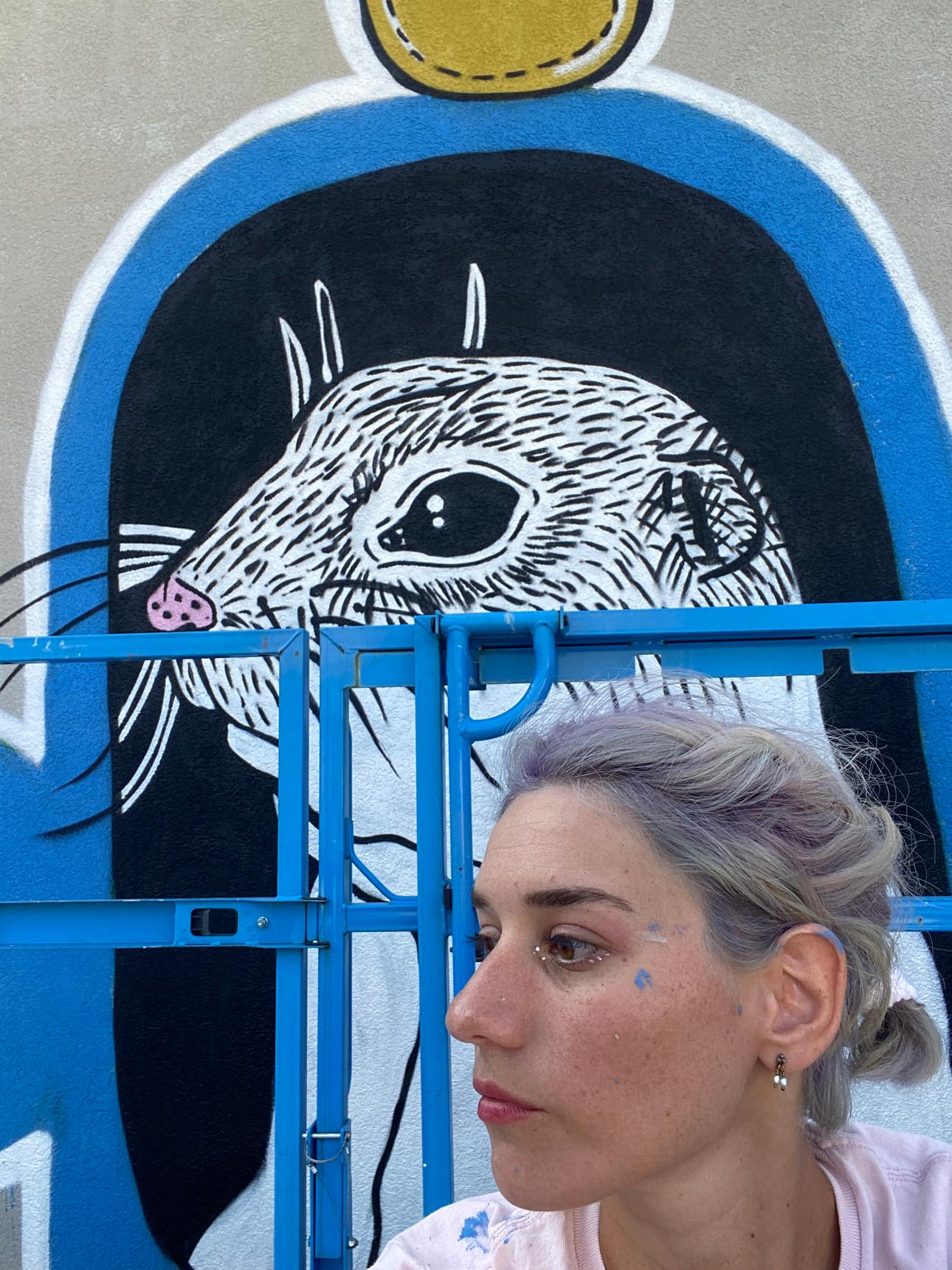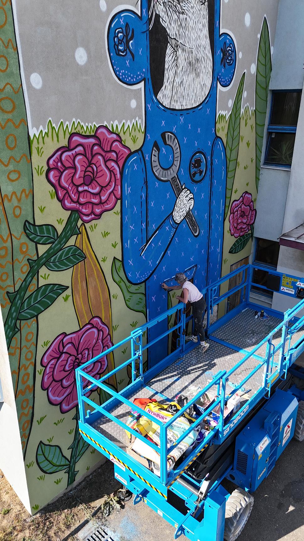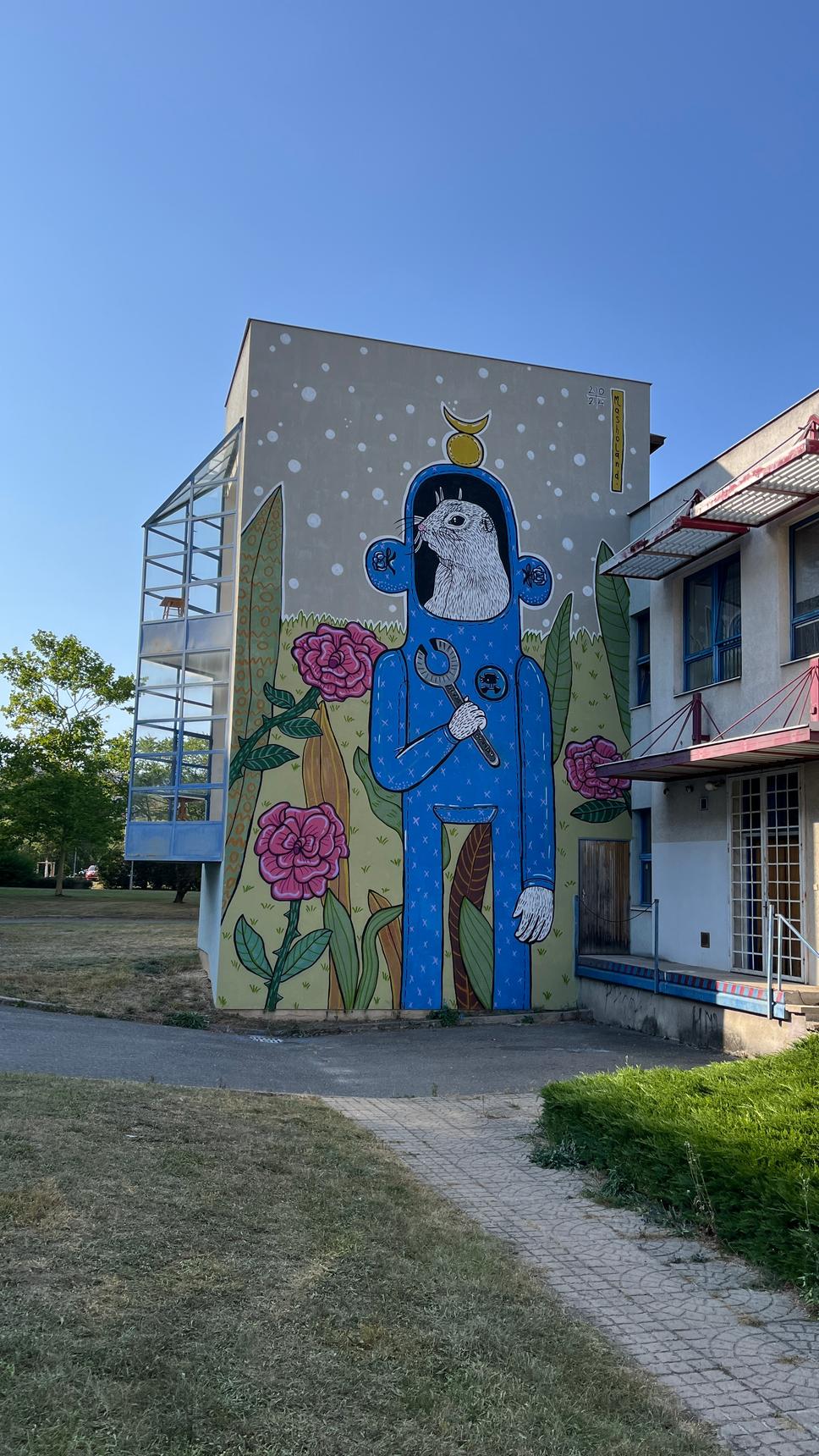 The second mural by Masho Marg (AKA Masholand) from the Město=Galerie Urban Art Festival in Mlada Boleslav, Czech Republic. Even though this type of animal is quite common in the Bohemia region, this foxy ground squirrel is no ordinary creature - it has alchemist knowledge and works at Škoda factory 🏭