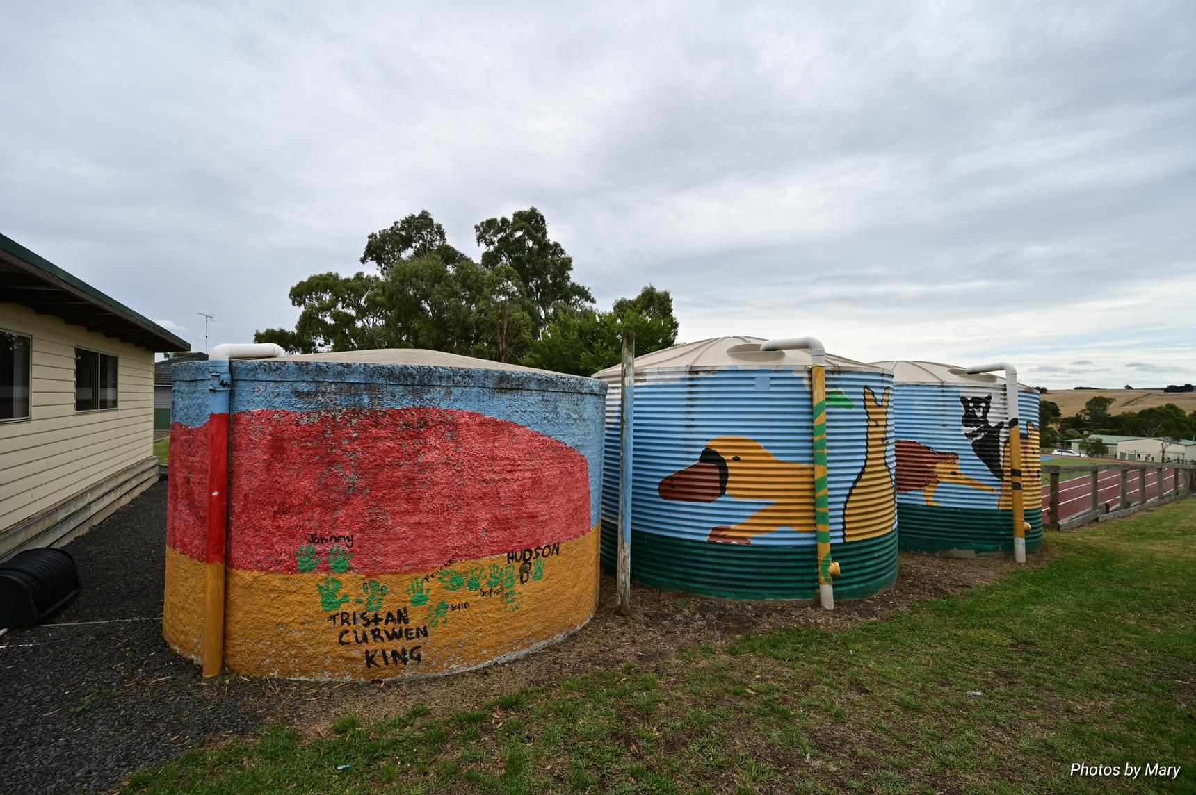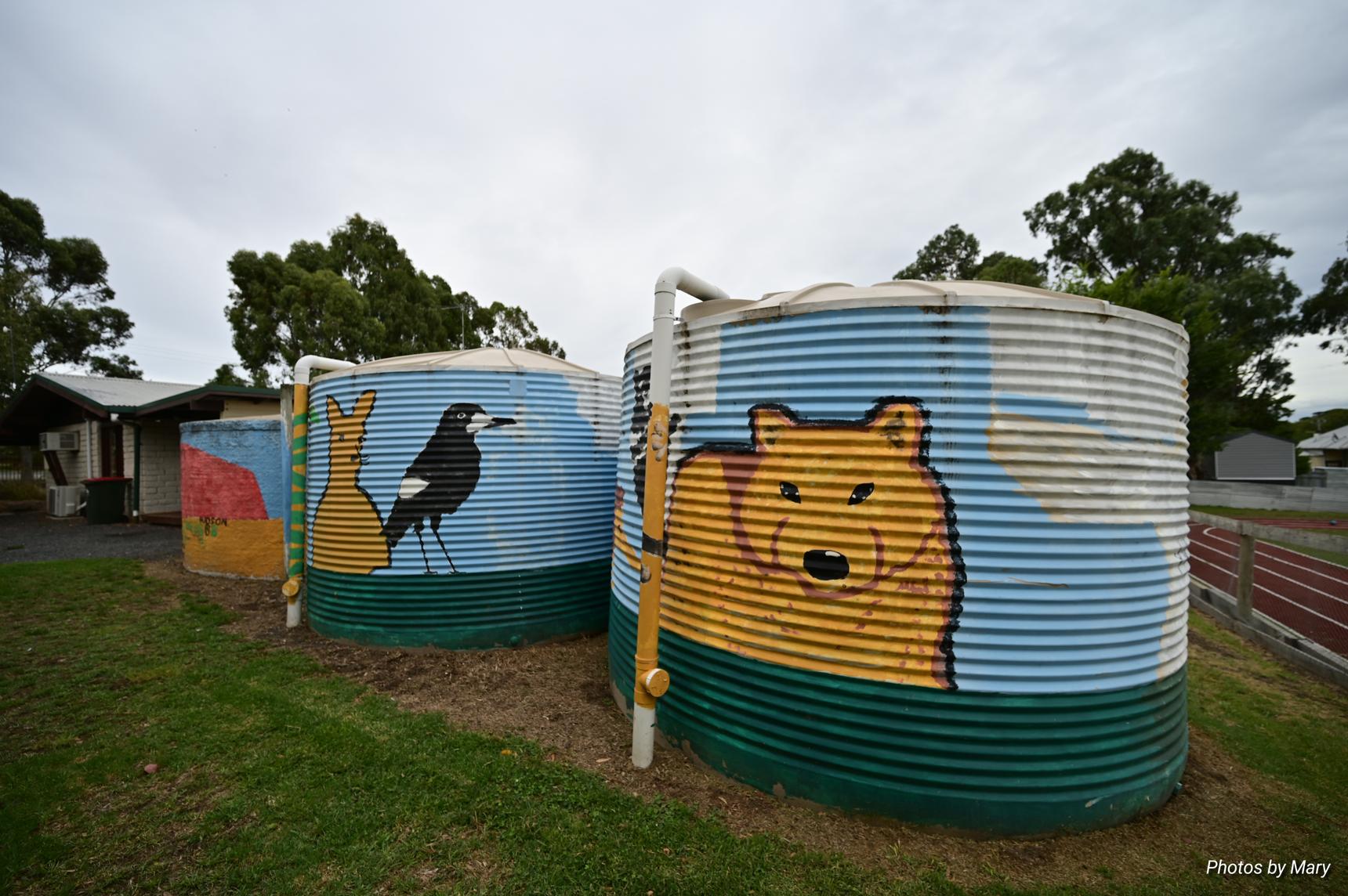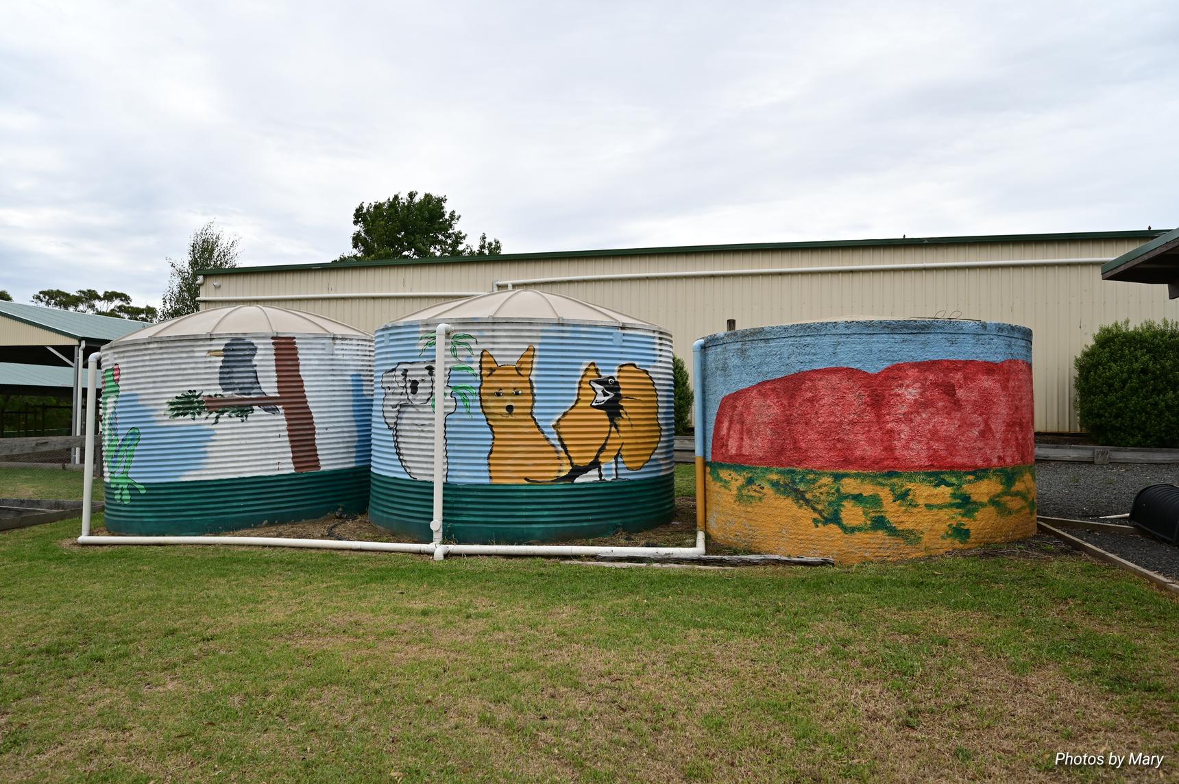 Various designs of flora and fauna painted on water tanks st Myrniong Primary School, 13 Puddy Ln, Myrniong, Victoria