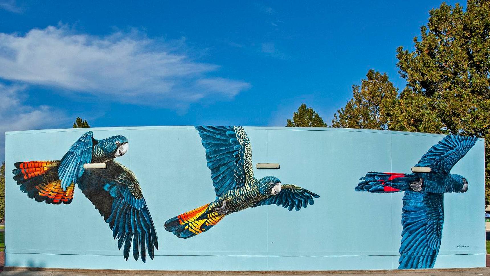 Featuring a female, juvenile and male Red-tailed Black-Cockatoo Cockatoo and their unique loping flight pattern. With an estimated population of about 1500 birds, the South-eastern Red-tailed Black-Cockatoo is in danger of extinction.