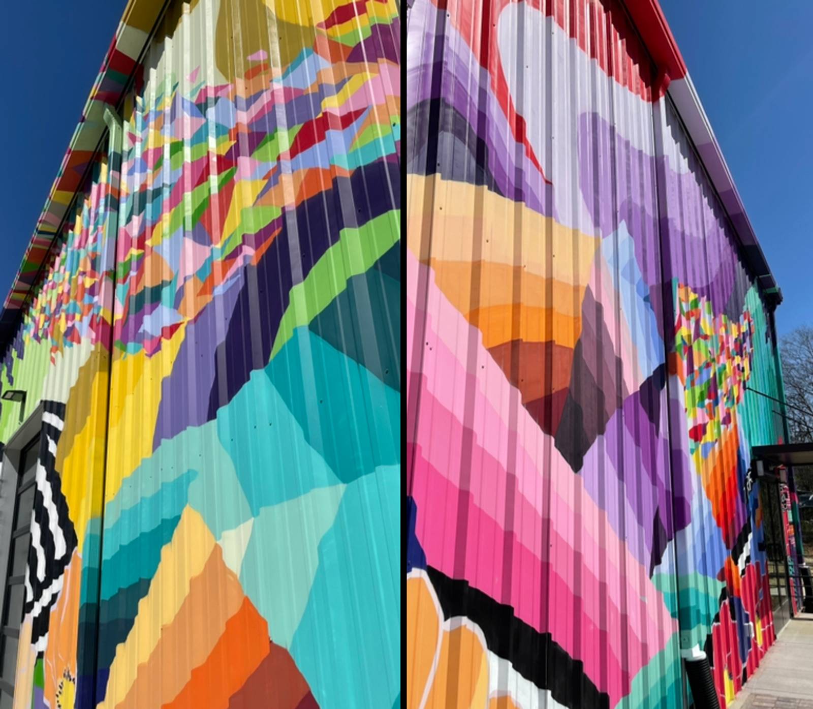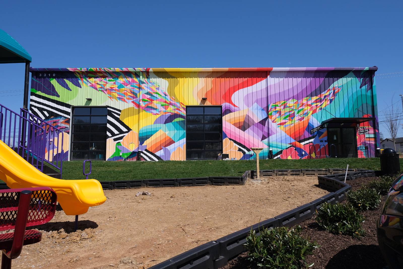 They wanted me to create a wild abstract piece that represented the colorful world we live in, migration (the fractals mosaic pattern flowing through the building) and movement, with tons of bright, bold colors, shapes, textile patterns. The building is going to be an incredible community space, surrounded by a soccer field, playground, gardens, more murals and set just south of Nashville in the neighborhood of Antioch, where I spent some of my teenage years.