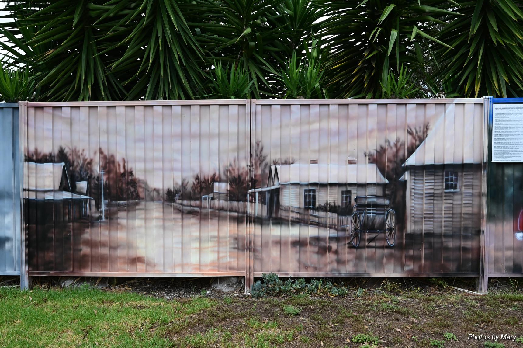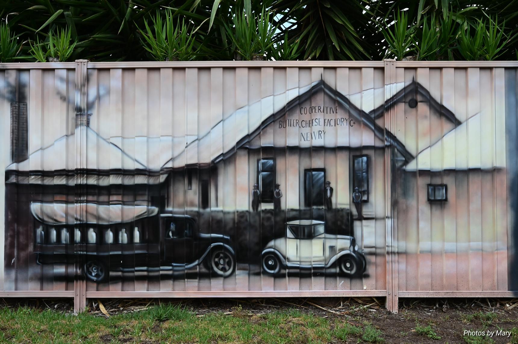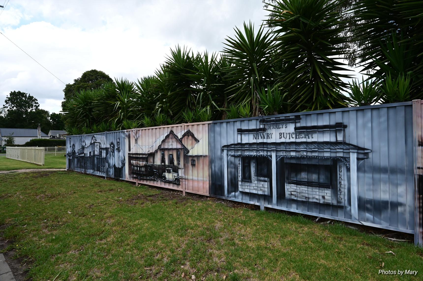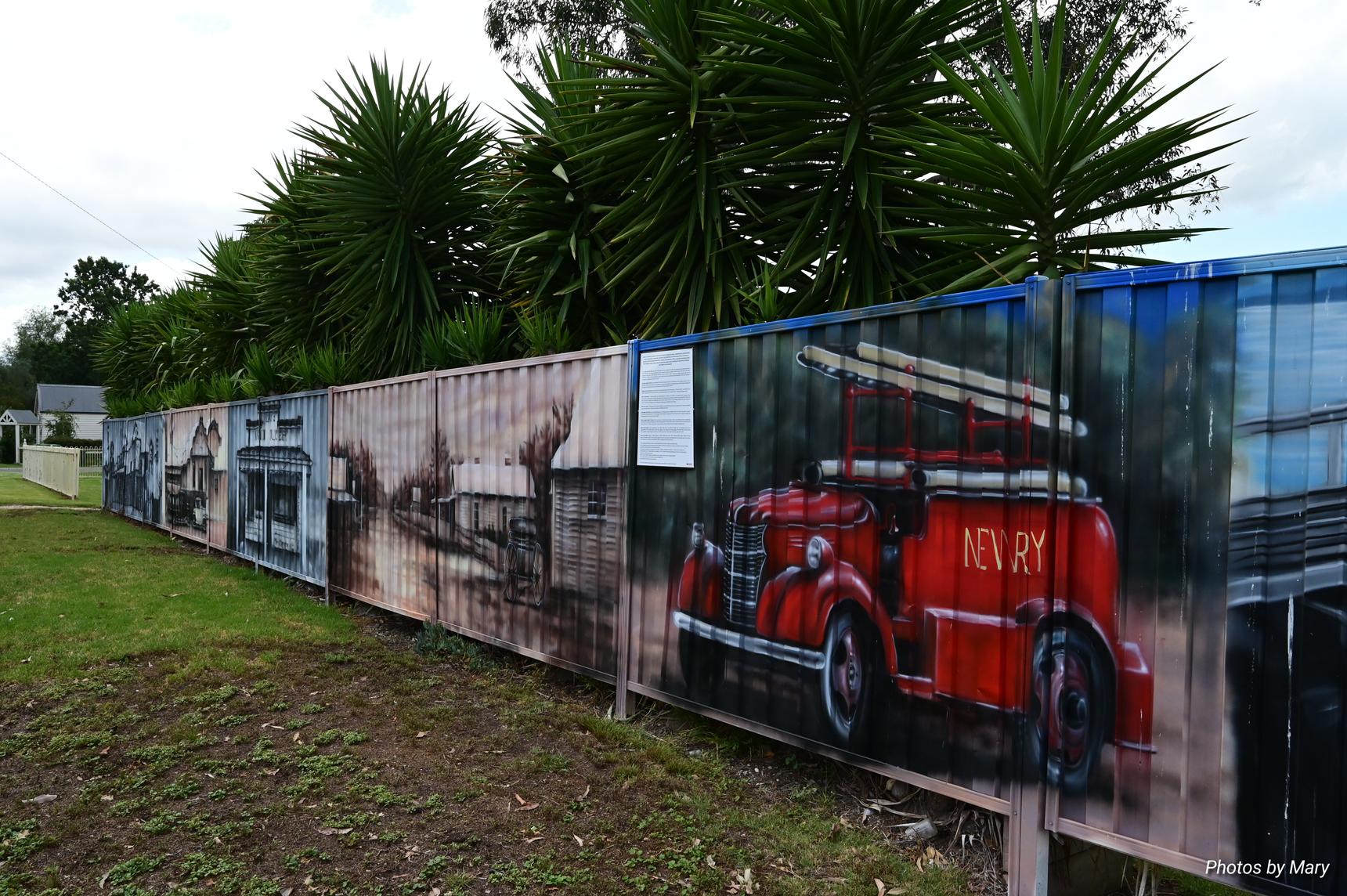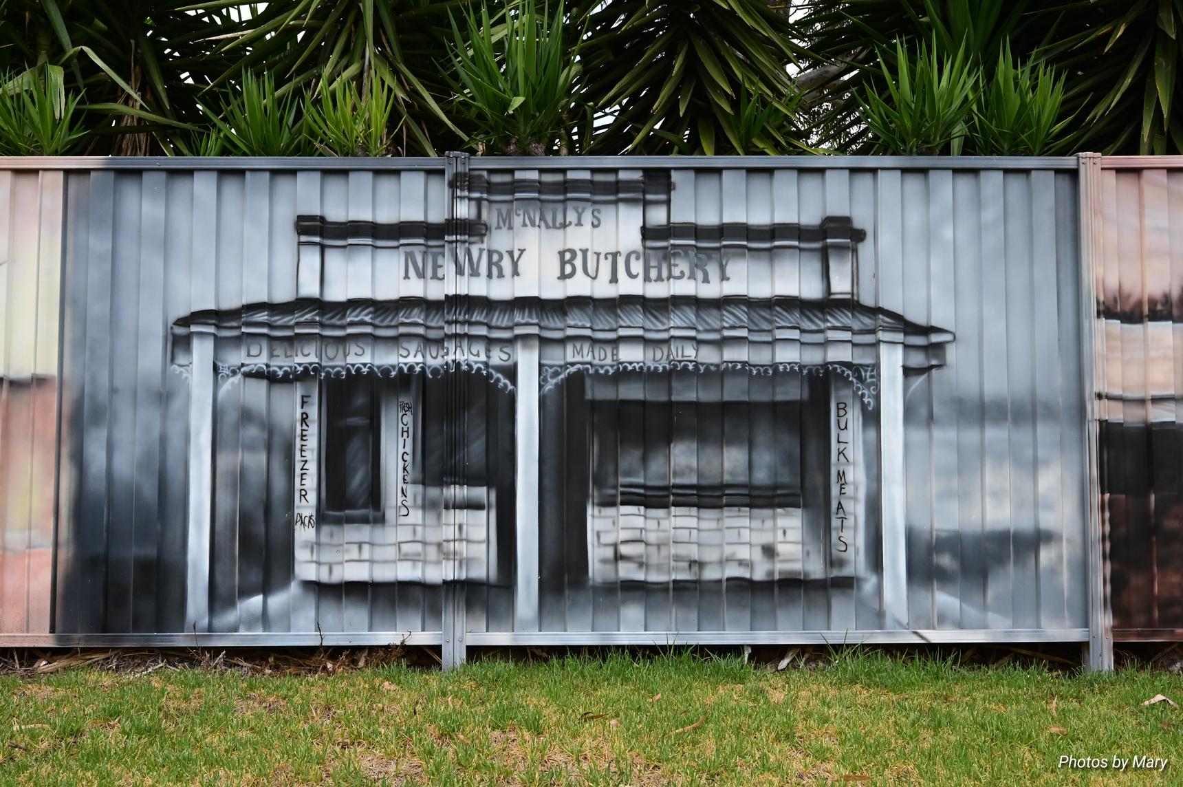Murals featuring the various buildings and services in Newry. Located on fence opposite the Newry Hotel.