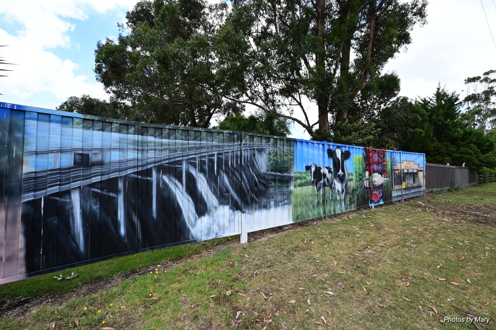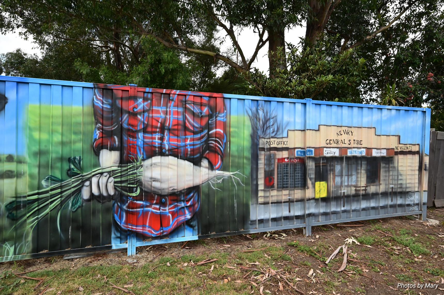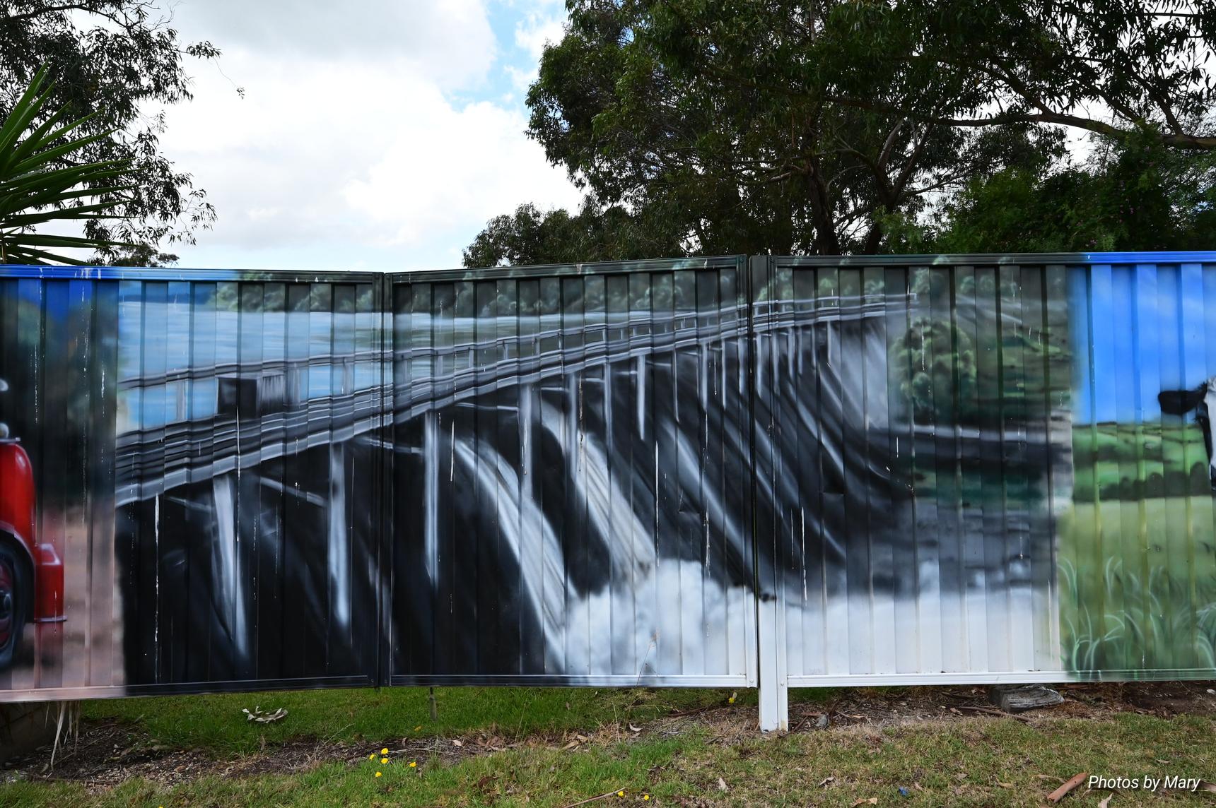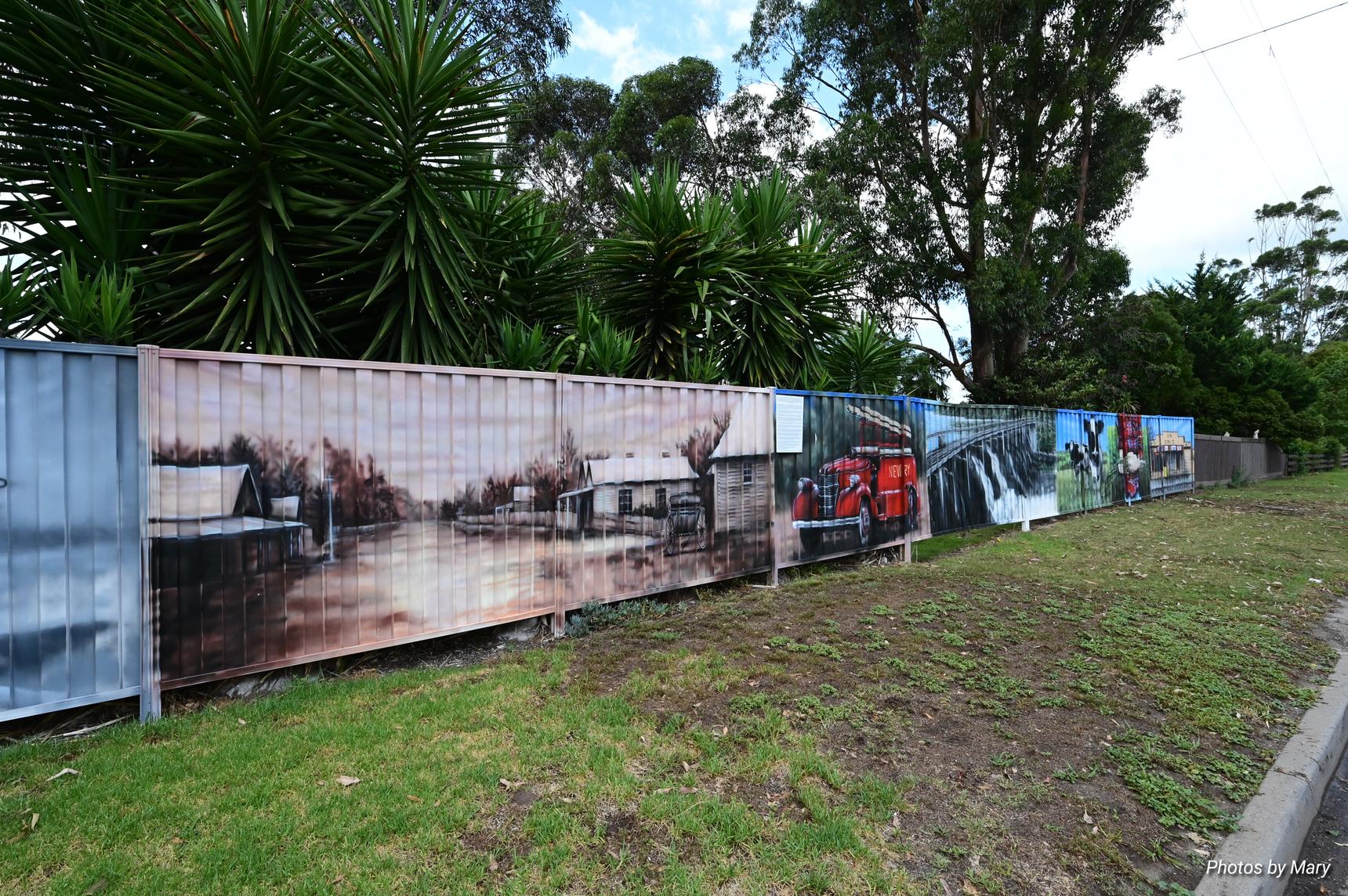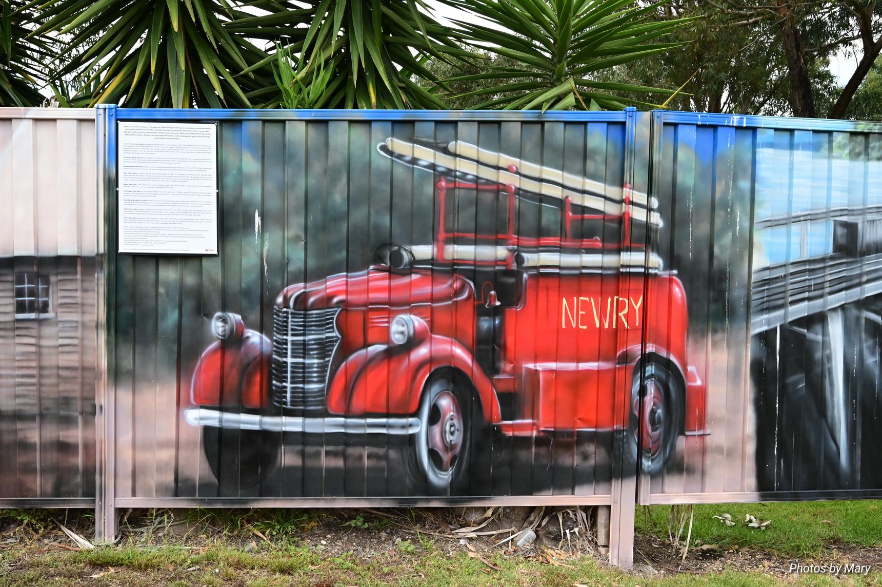 Murals featuring the various buildings and services in Newry. Located on fence opposite the Newry Hotel.