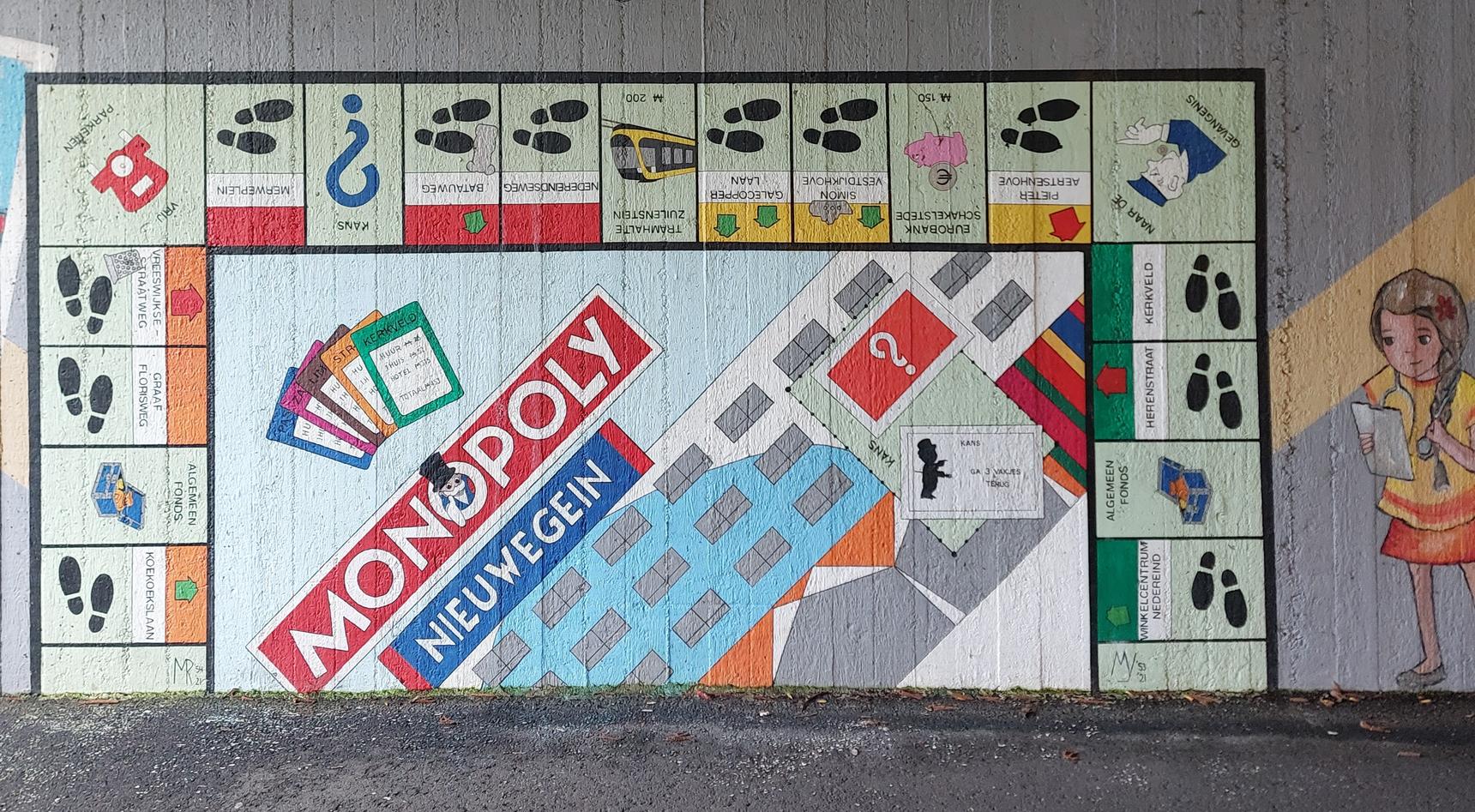 Op de polaroid de Nieuwegeinse editie van het spel Monopoly. Opvallend is dat de afbeeldingen en tekst op zijn kop staan. De verklaring hiervoor is als volgt: oorspronkelijk is ook op de grond geschilderd en liep het bord door op de muur. Toen de schilderingen klaar waren zaten er op het voetpad verfspetters. Deze zijn met een hogedrukspuit verwijderd, maar helaas per abuis ook de schildering op de grond. Heel jammer, zeker ook voor de 2 buurtbewoonsters die heel lang aan deze schildering hebben gewerkt.