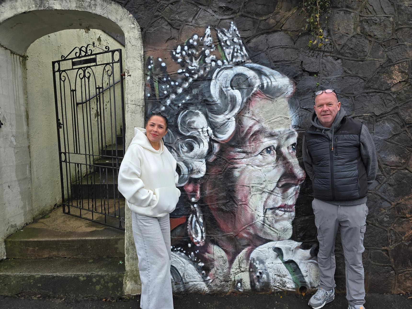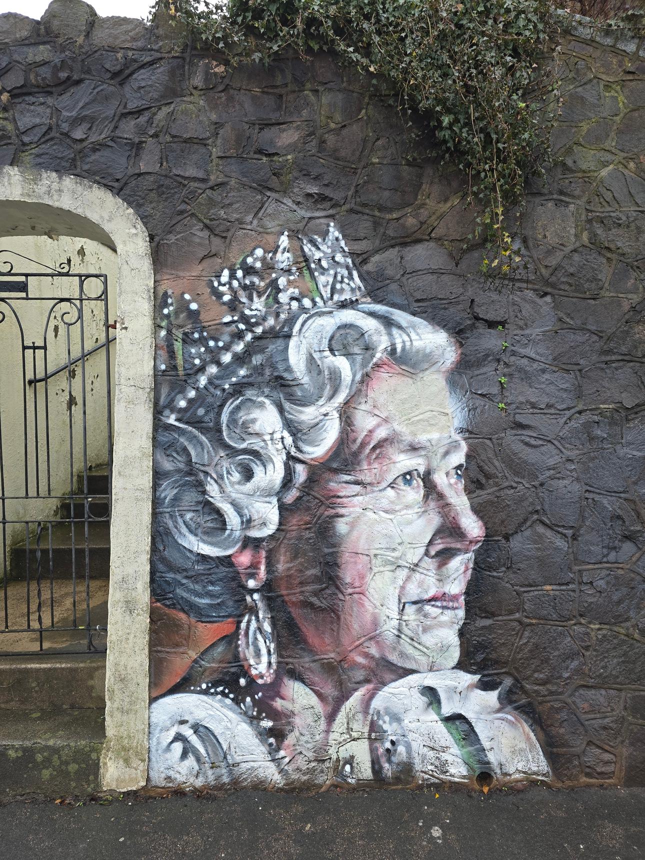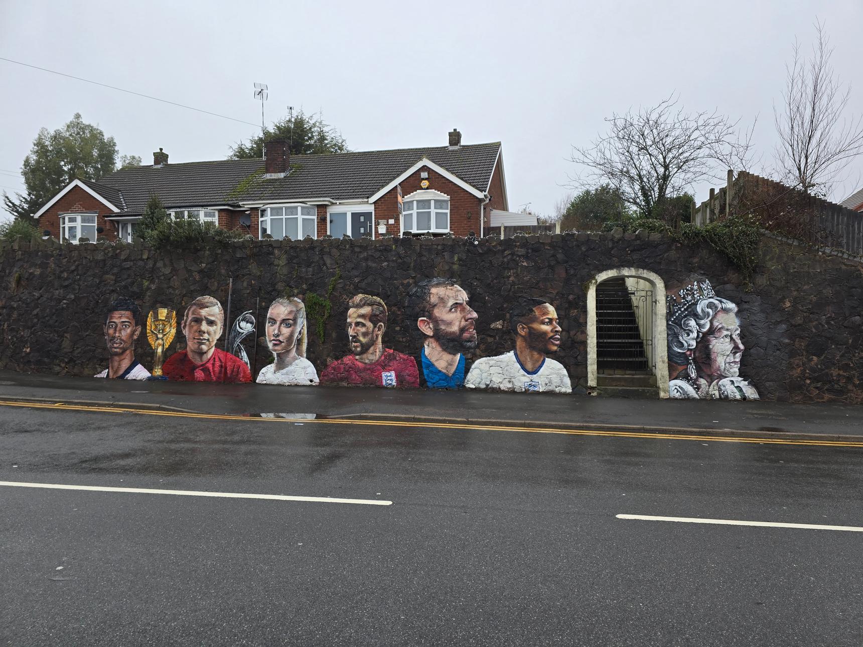 This image of the Queen was created in honour of the passing of Queen Elizabeth II. It was commissioned by the owner of the property, and it is placed next to the wall of footballing heroes (painted by N4T4), that is periodically added to whenever a significant footballing moment happens.