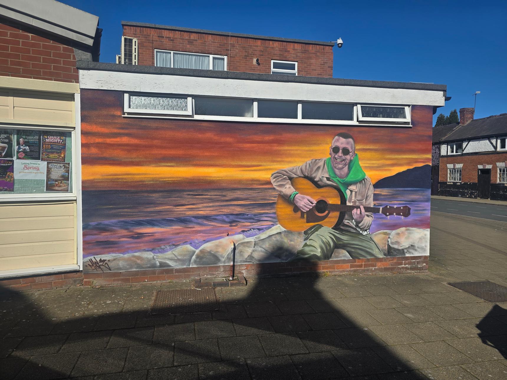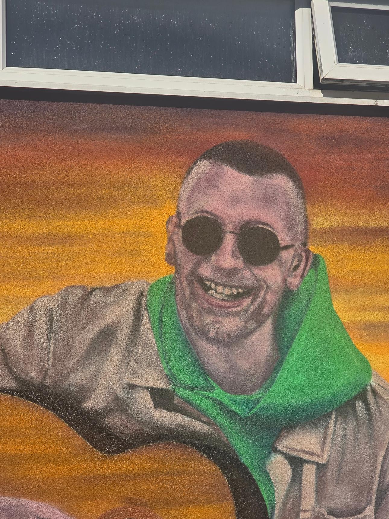 This mural was created in memory of Eliot Boland, who died in February 2026 at the age of 39. The mural is a recreation of a photograph taken in Barmouth.