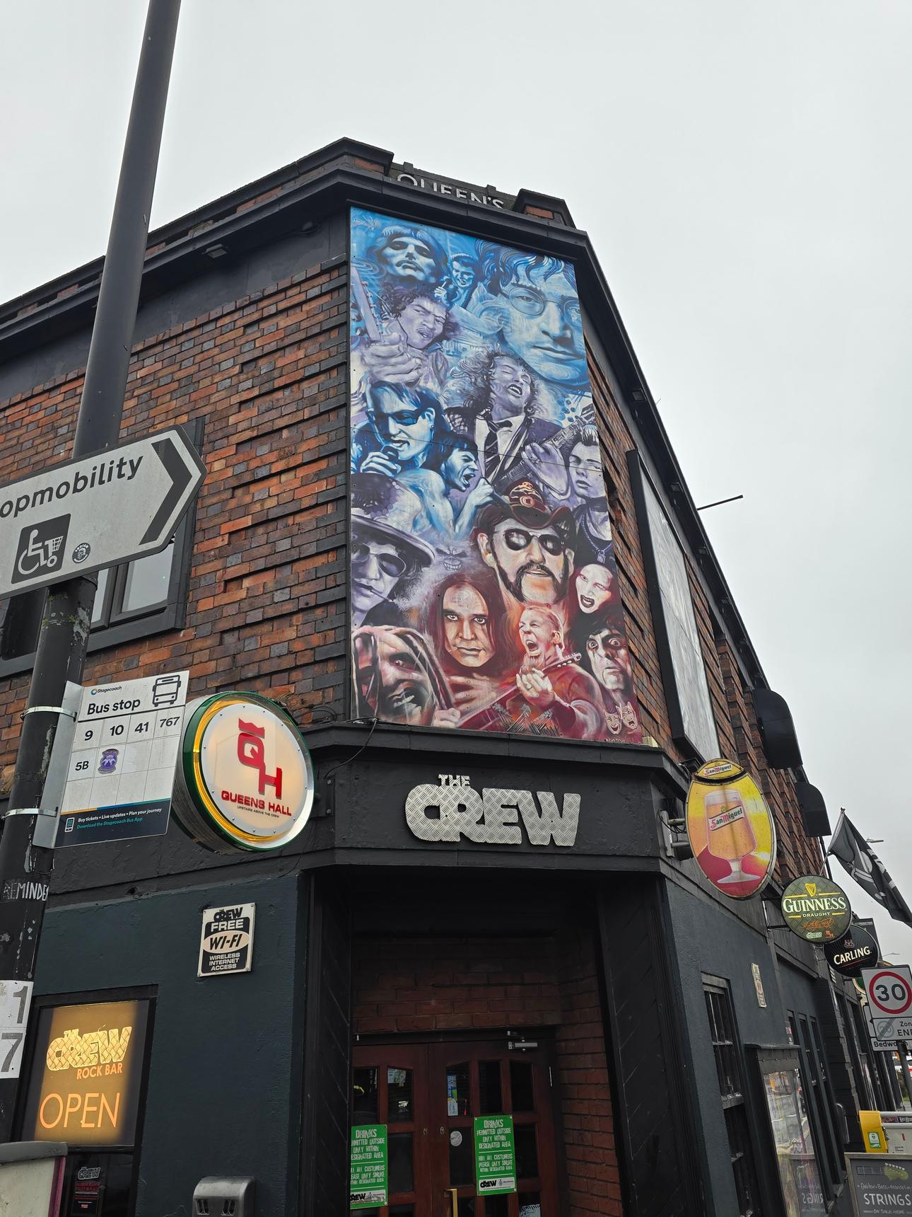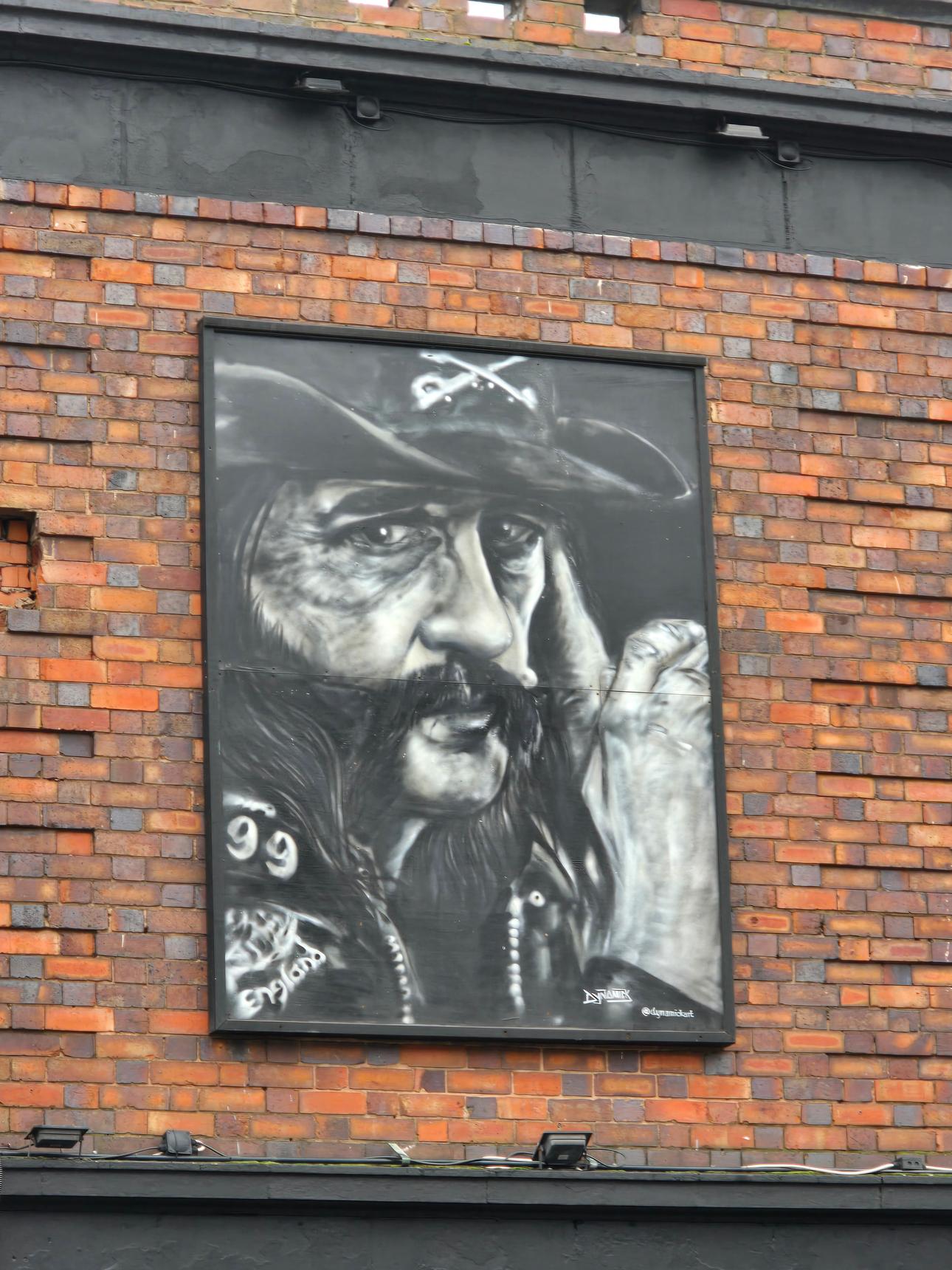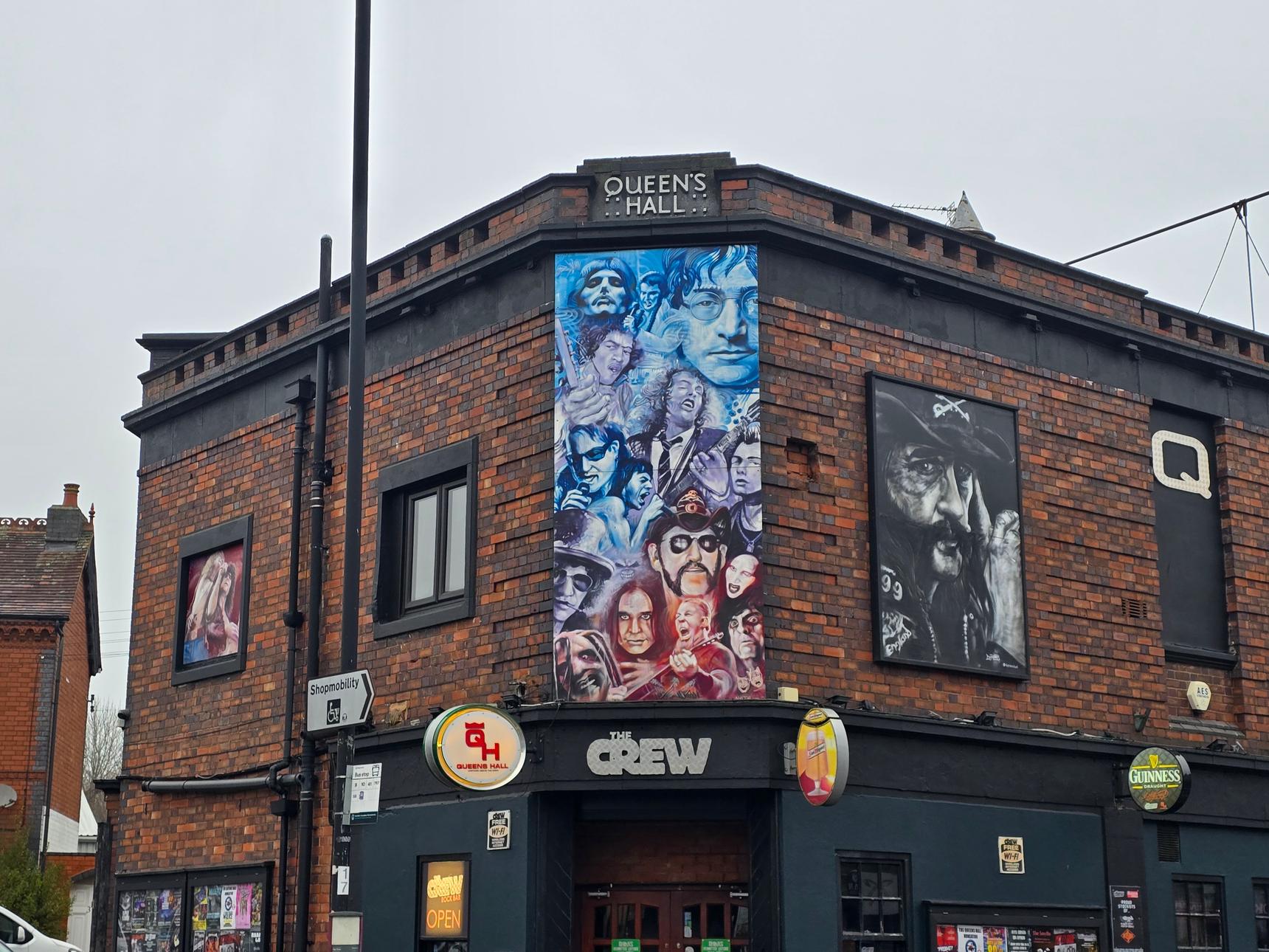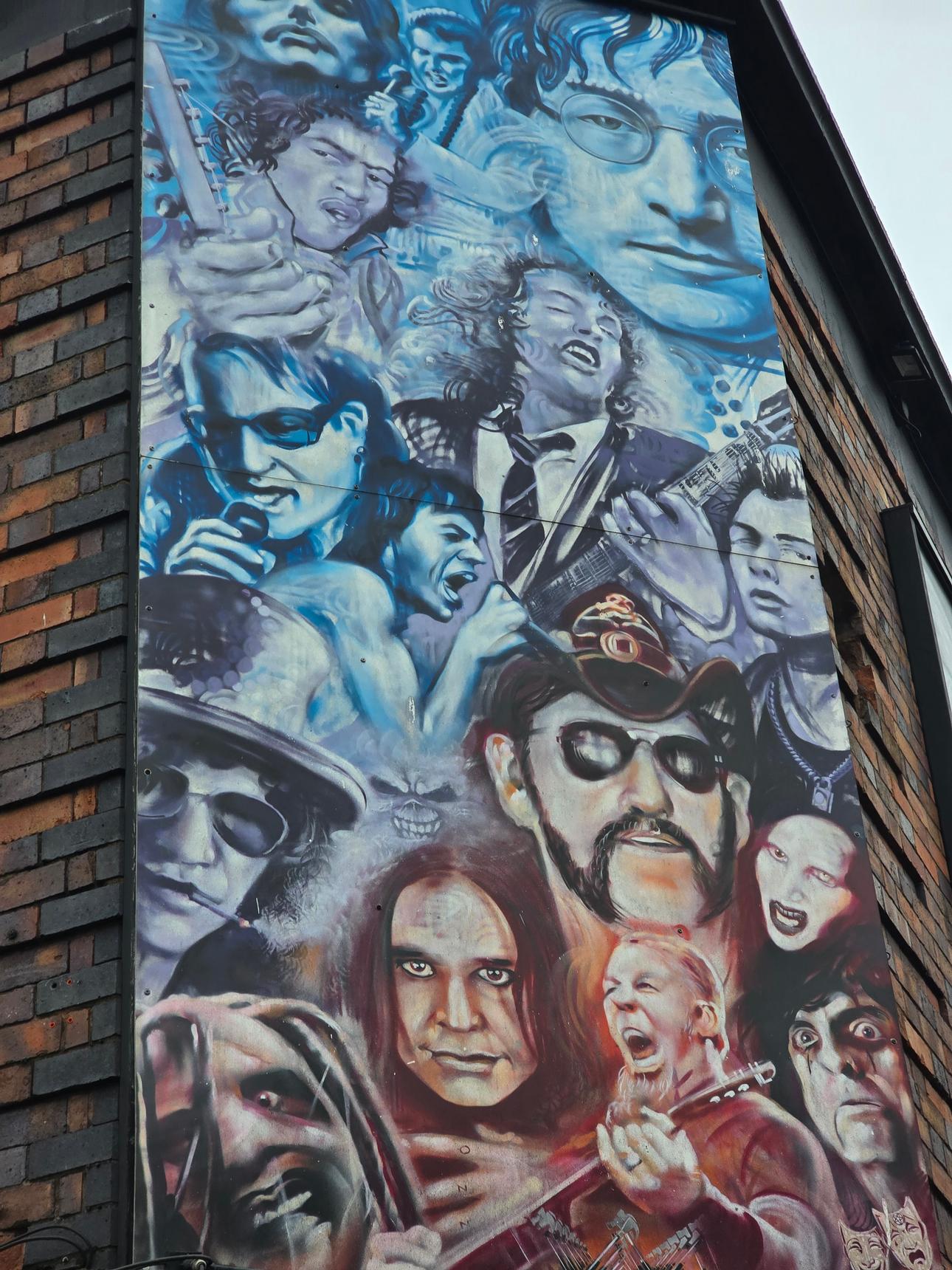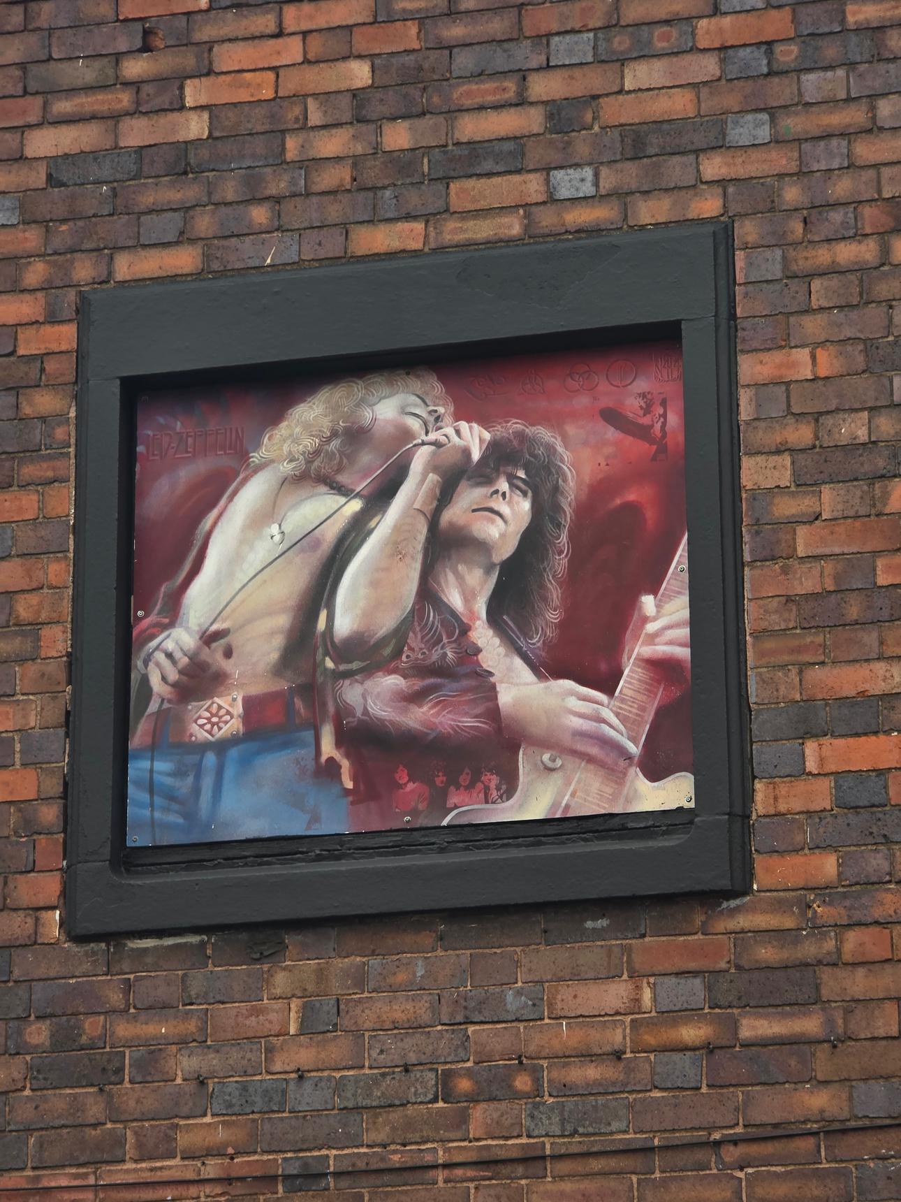 Three murals above a Rock Bar in Nuneaton. The two murals in colour are by N4T4: the one on the left depicting Robert Plant and Jimmy Page of Led Zeppelin, and the one in the centre depicts numerous artists of different music genres, including Elvis, Freddie Mercury, Bono, Ozzy Osborne and Mick Jagger. The black and white mural on the right is by Dynamickart, and depicts Lemmy of Motörhead.