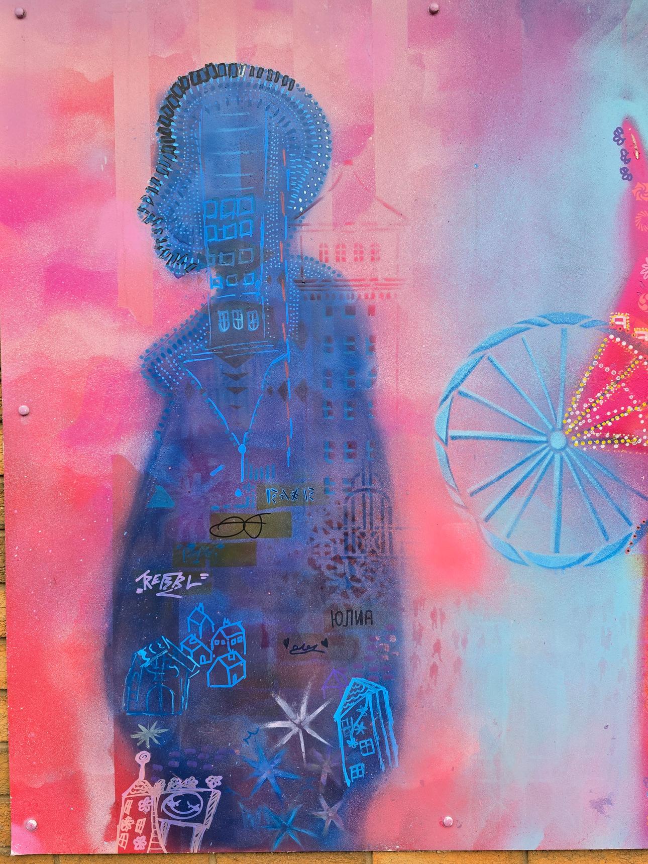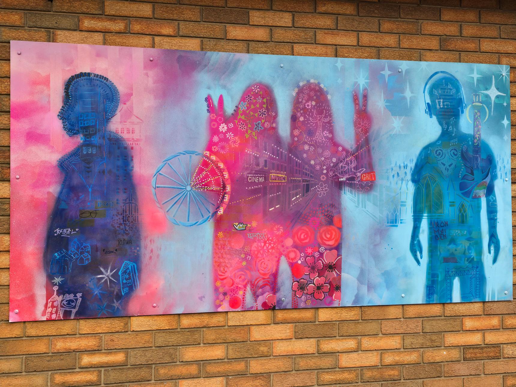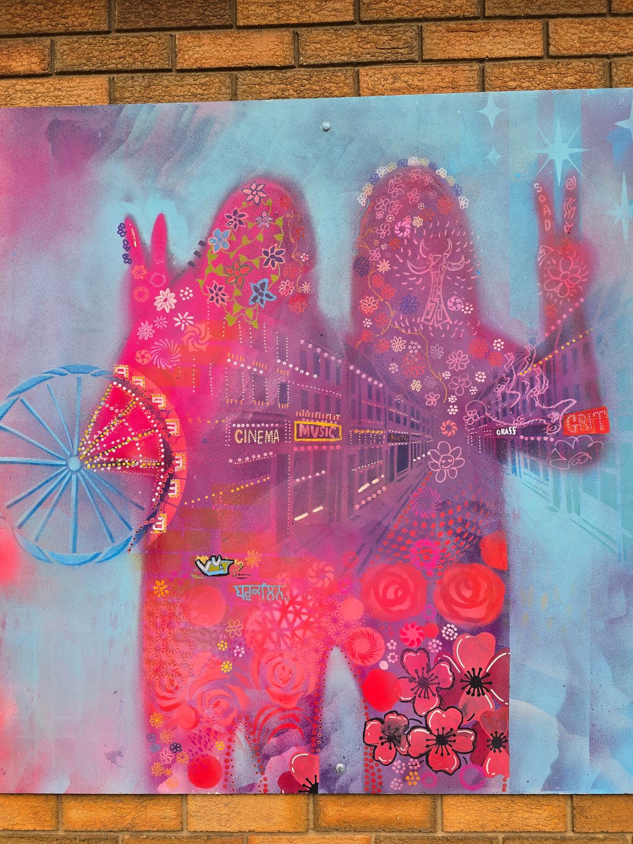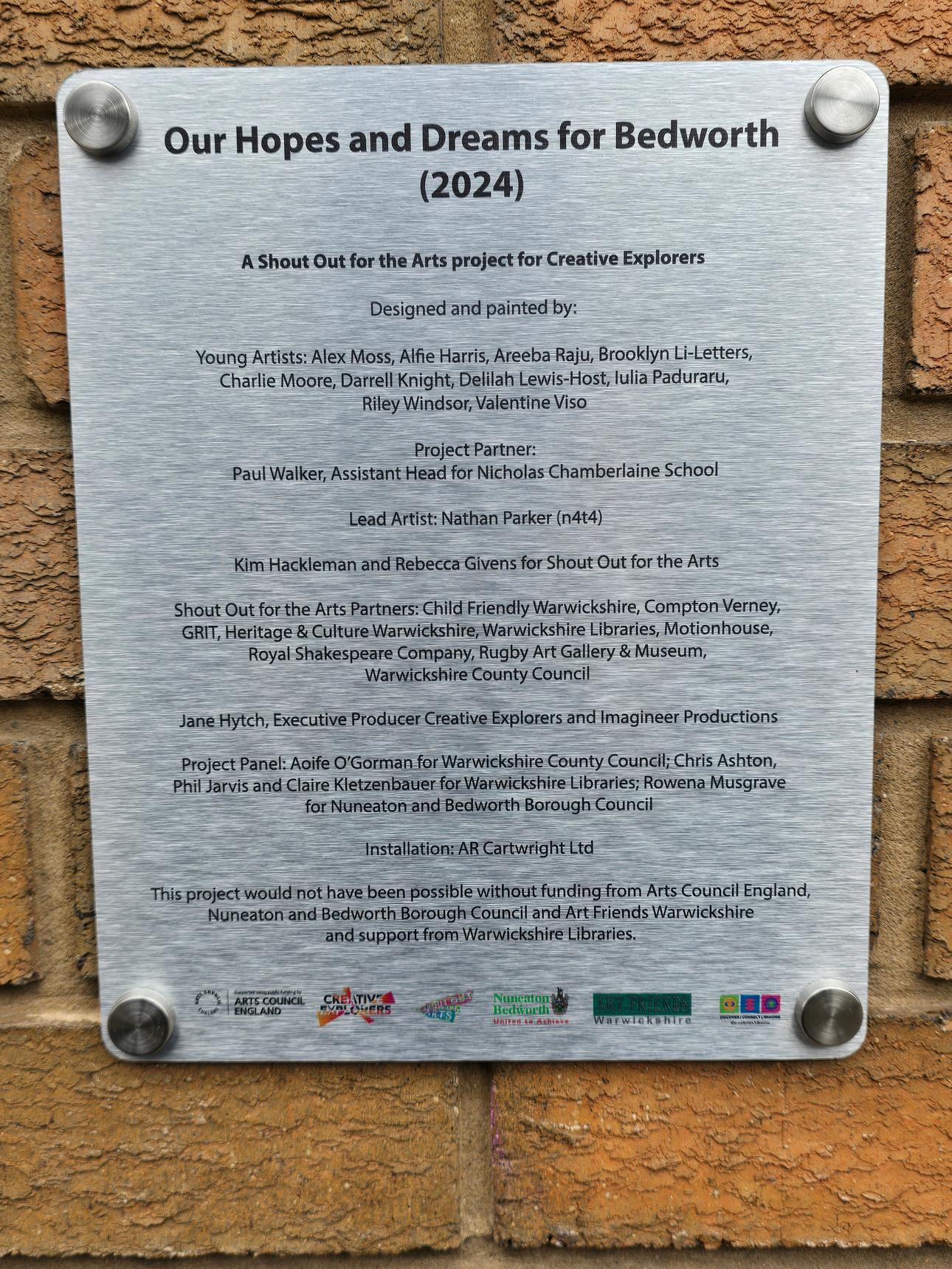This piece was created by students of the Nicholas Camberlaine School, under the guidance of N4T4. The artists are Alex Moss, Alfie Harris, Areeba Raju, Brooklyn Li-Letters, Charlie Moore, Darrell Knight, Delilah Lewis-Host, Iulia Paduraru, Riley Windsor, Valentine Viso.