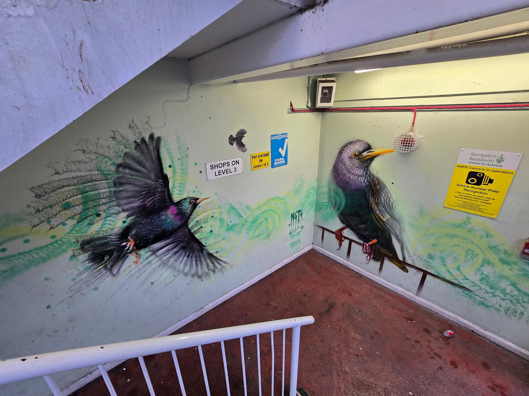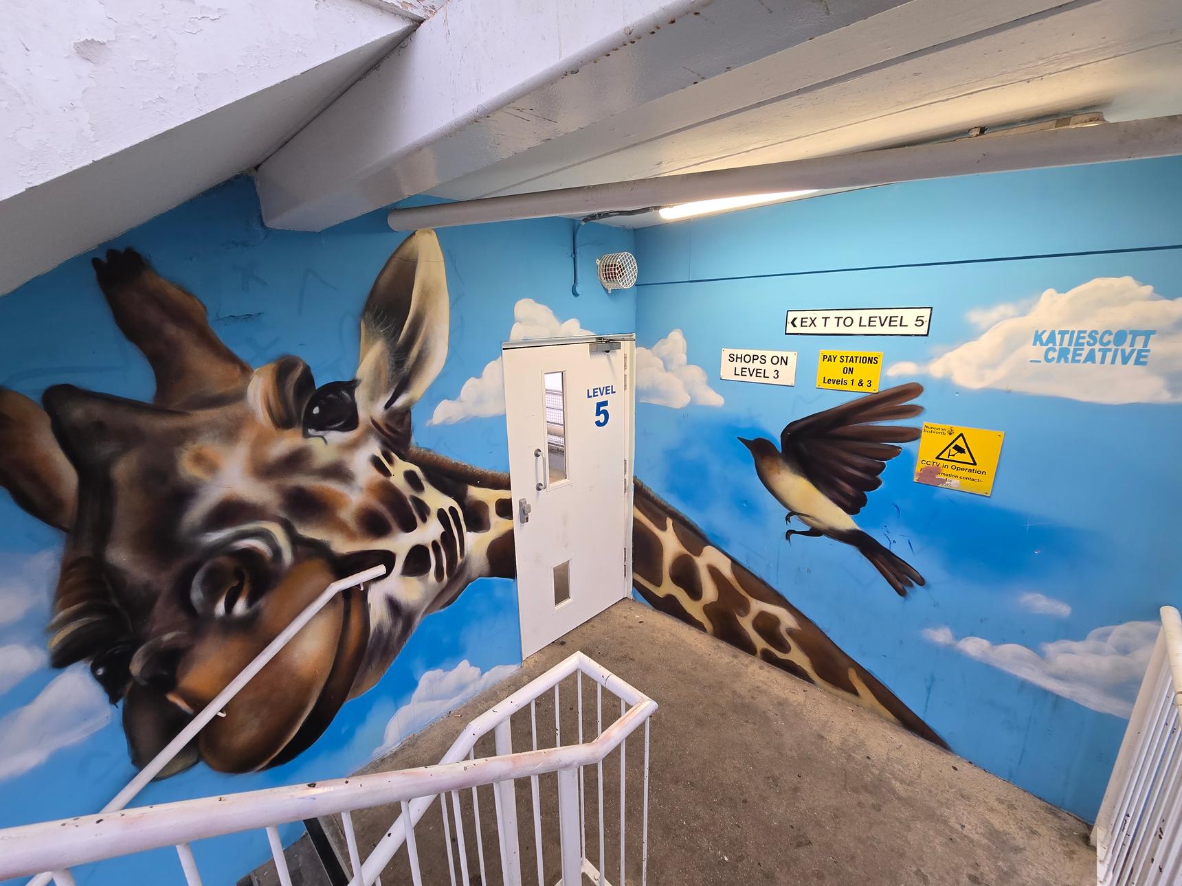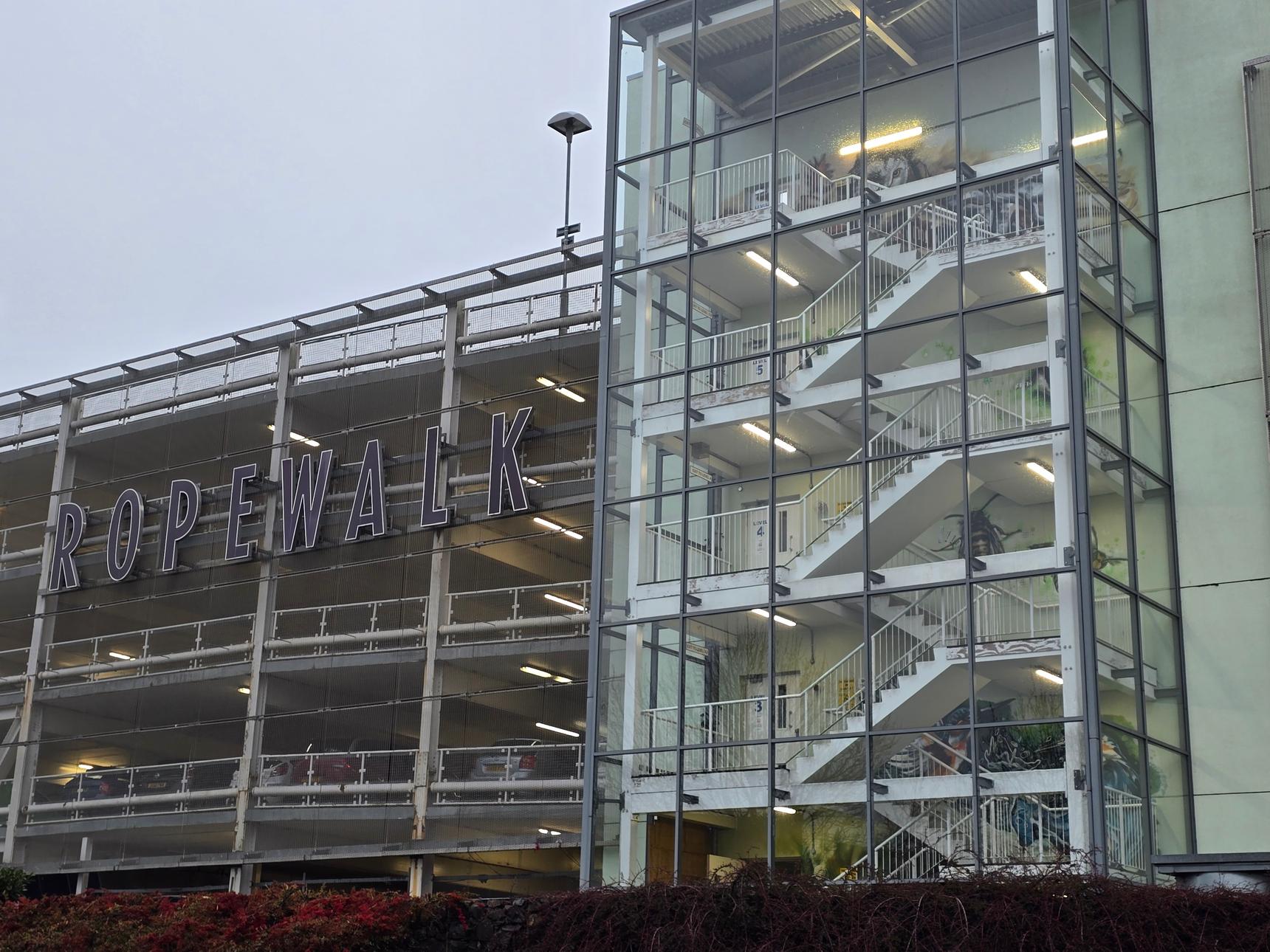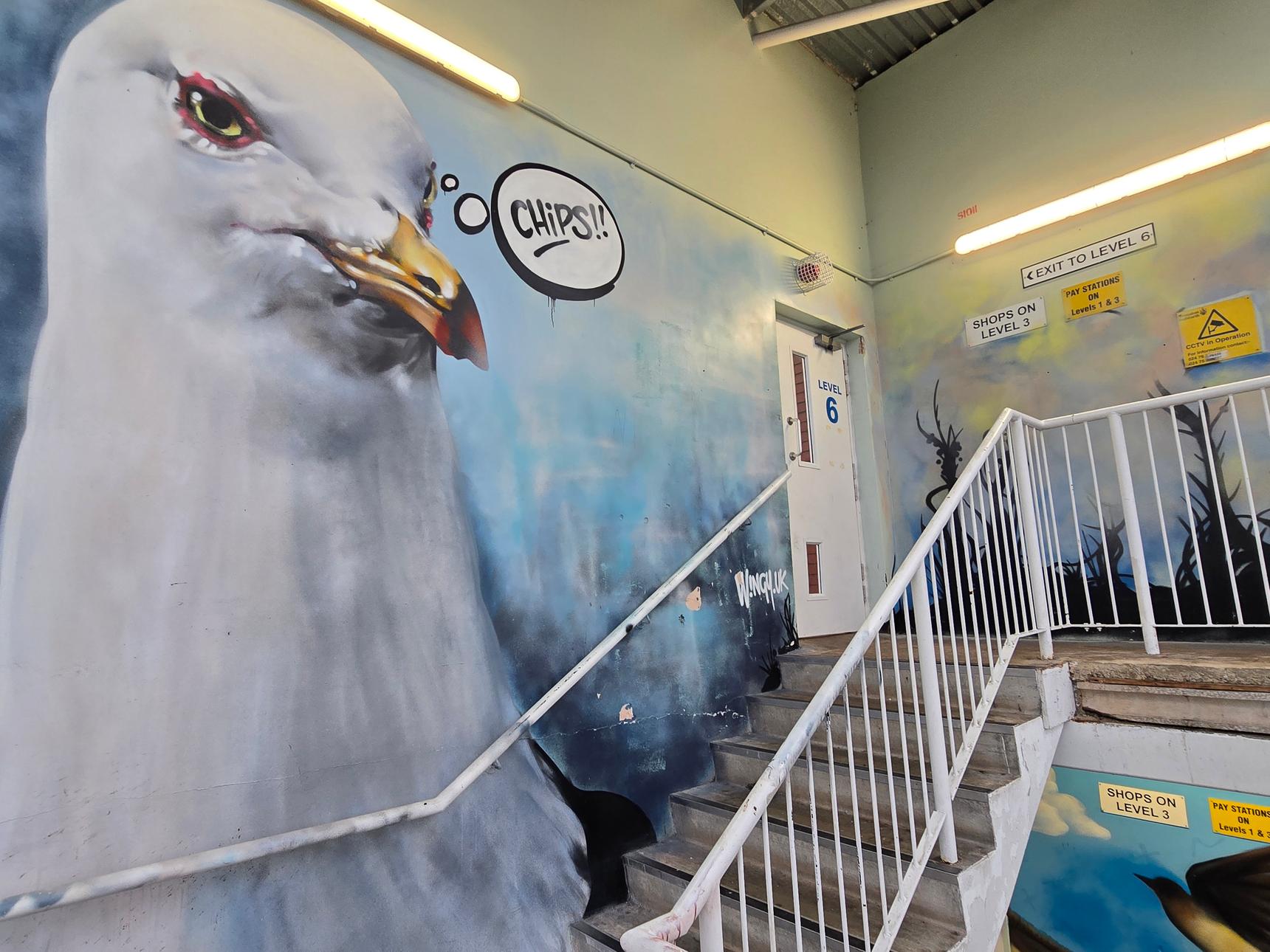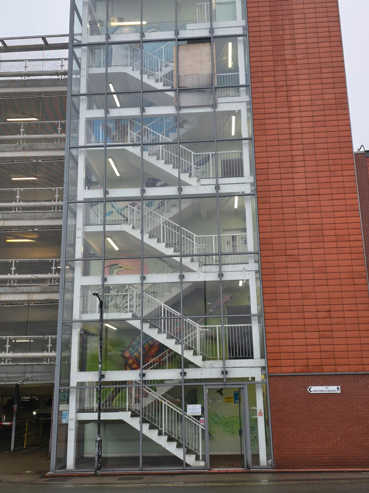 There are several stairwells in the car park, but only two of them have the murals. These are the ones on the south side of the building, and on the east side.