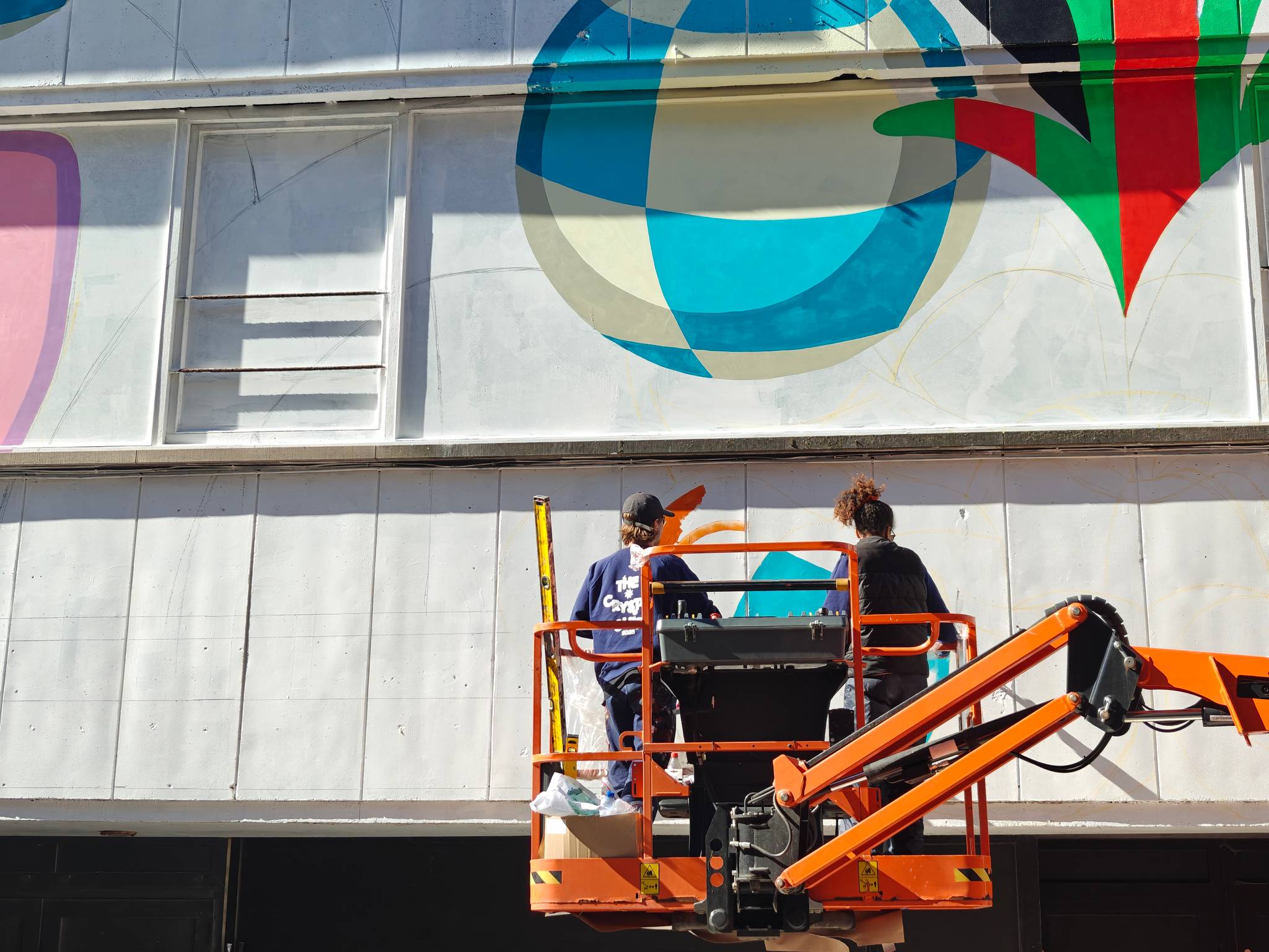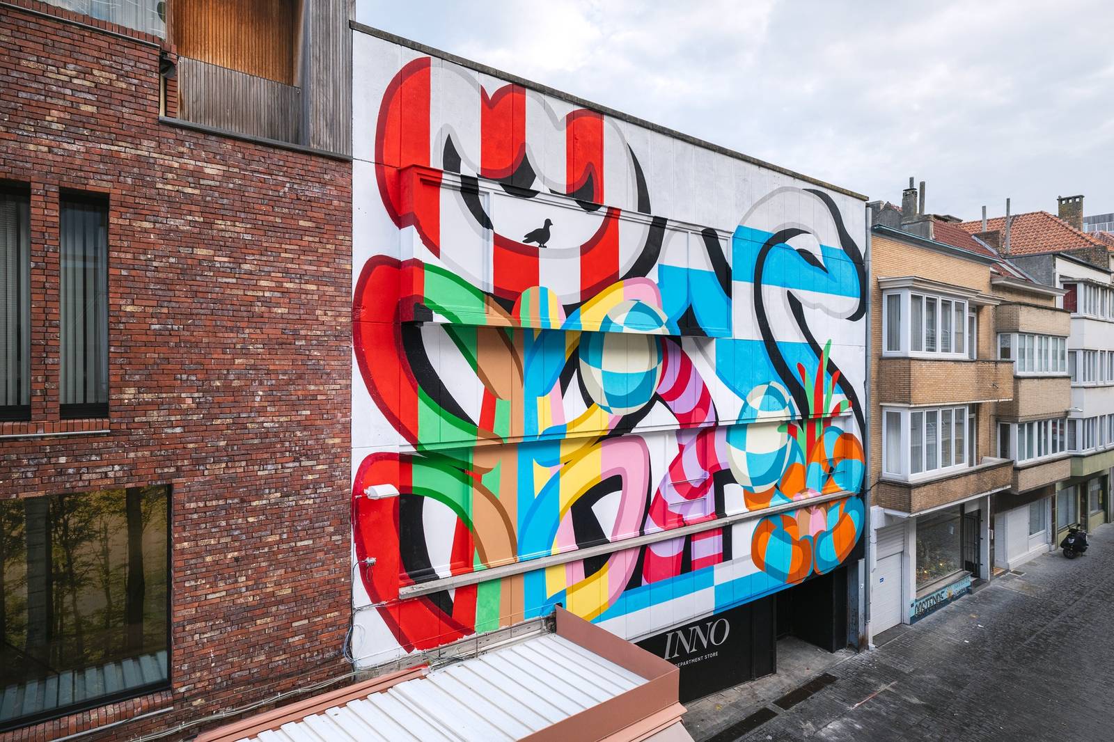 You may have already spotted Lindert's work at music festival Pukkelpop, where he transformed containers into colorful eye-catchers. Or on a hype court in Sint-Niklaas, a basketball court that is bursting with color thanks to him. If you were to describe Lindert Steegen's work in one word? Color! As if he stole the color palette of the rainbow and made it come to life on walls. With a master's degree in graphic design in his pocket, the Belgian artist mixes abstract shapes into a funky style that jumps right out at you.