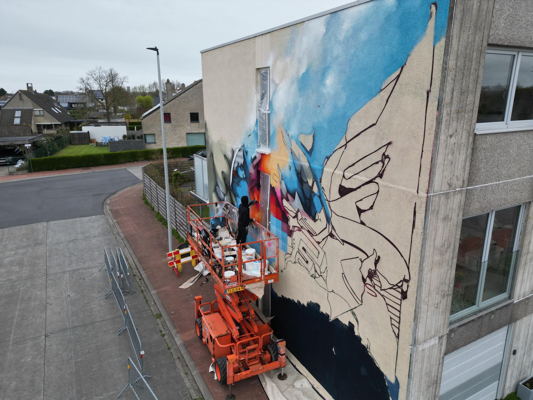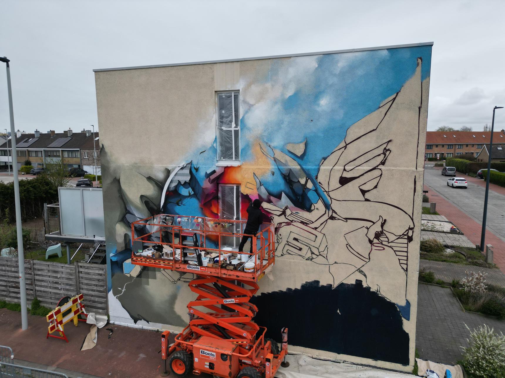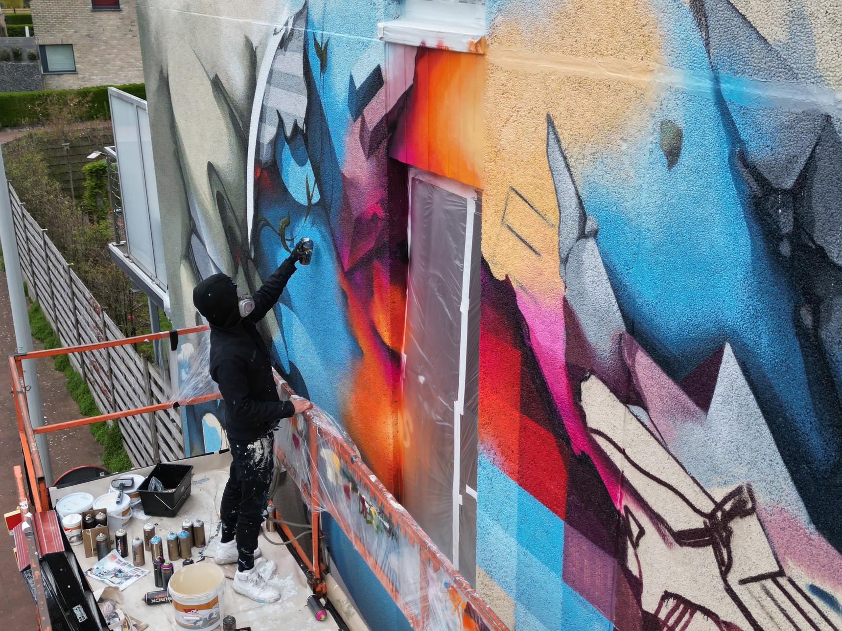 DOES' stijl bevindt zich op het snijvlak van graffiti, straatkunst en hedendaagse schilderkunst. Zijn graffiti-achtergrond brengt energie en spontaniteit, terwijl zijn schilderkunstige aanpak structuur, balans en verfijning toevoegt. Deze muurschildering belichaamt die dualiteit: dynamisch maar gecontroleerd, intuïtief maar zorgvuldig gecomponeerd. Werken in de openbare ruimte voegt een extra dimensie toe. De straat wordt een open atelier waar bewoners en bezoekers het proces zien ontvouwen. Kleine interacties – een gesprek, de interpretatie van een kind, een buurman die koffie aanbiedt – geven subtiel vorm aan de sfeer rondom het werk en versterken DOES' geloof in verbinding door middel van kunst.