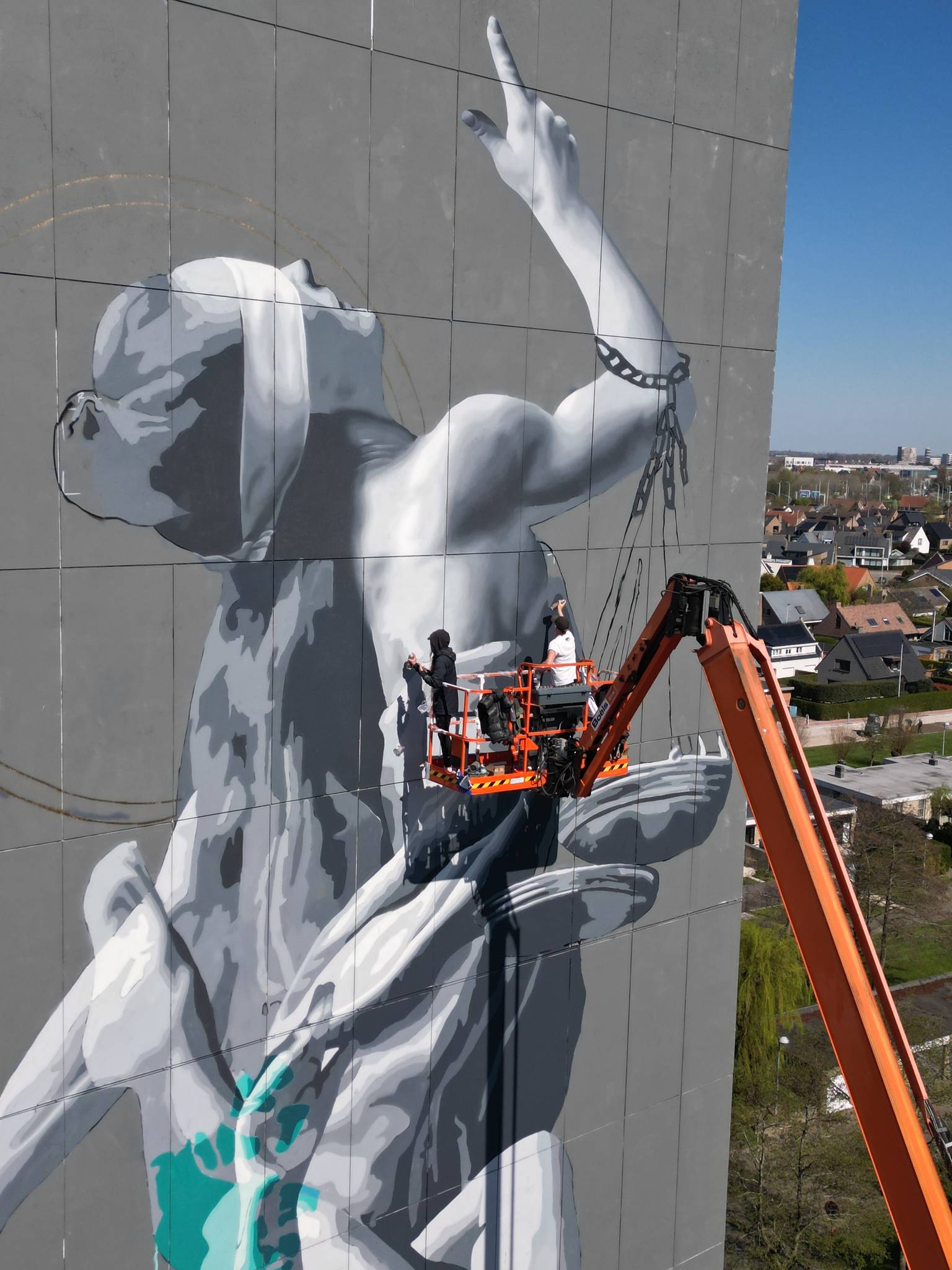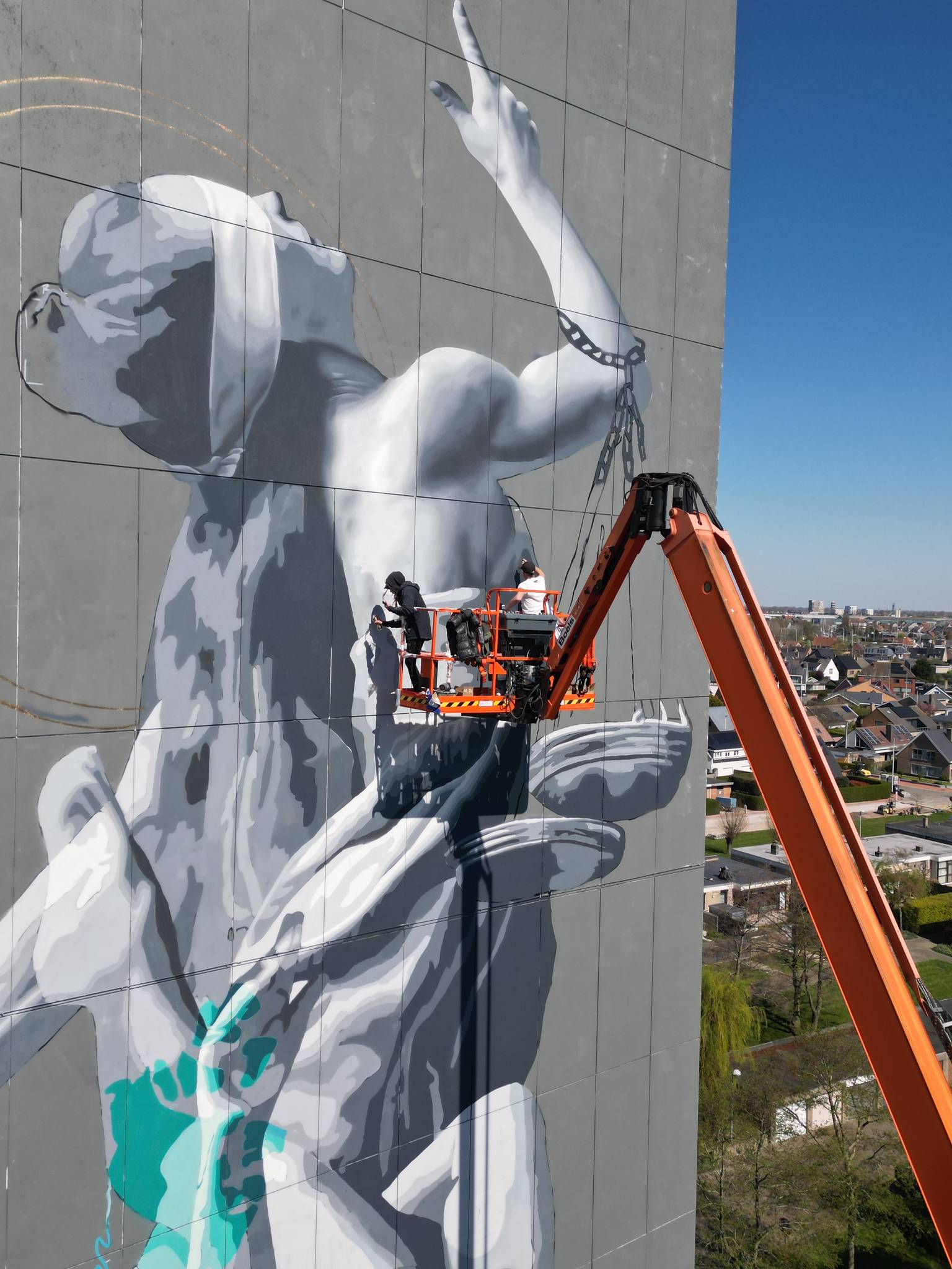As a child she was a rebel. In protest she started with Graffiti, an act of resistance. At the age of eighteen she discovered large -scale murals and knew immediately: this is it. Since then she has used the city as her canvas and the walls as her voice. Under the theme change, she mainly sees a world in transition. "Everyone sees it," she says. "The world is under pressure. Political shifts follow each other at lightning speed. That is why I paint "Lady Justitce" who literally falls from her pedestal, a symbol of justice, at a time when that word is under fire more than ever."