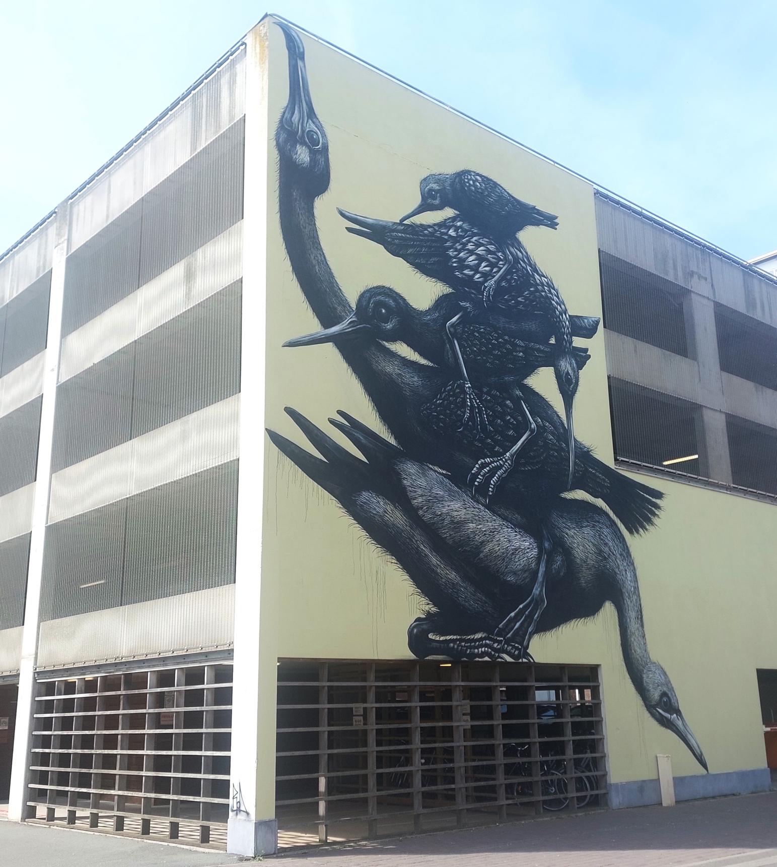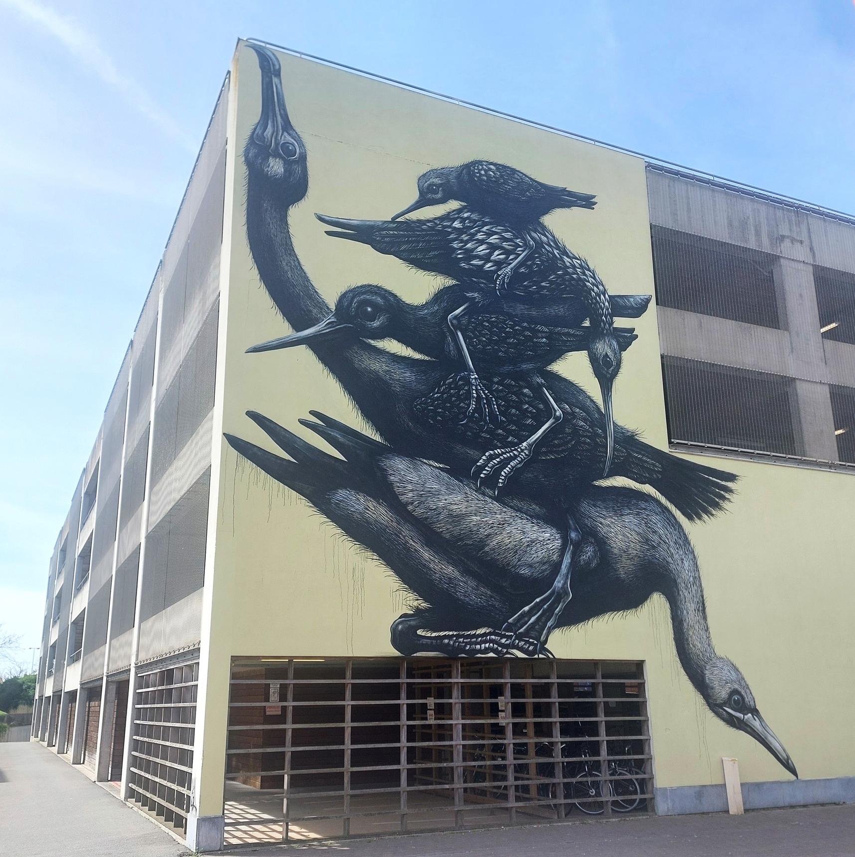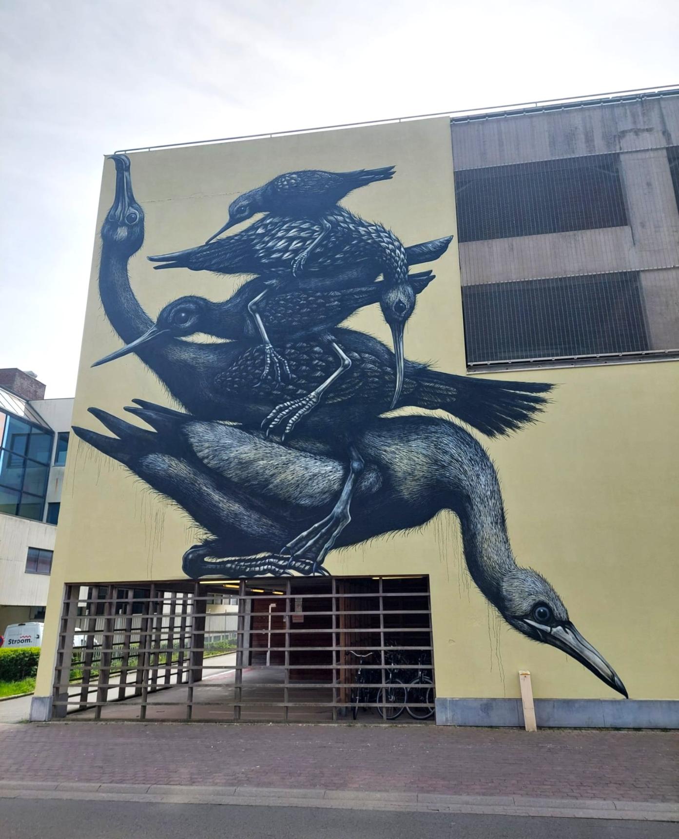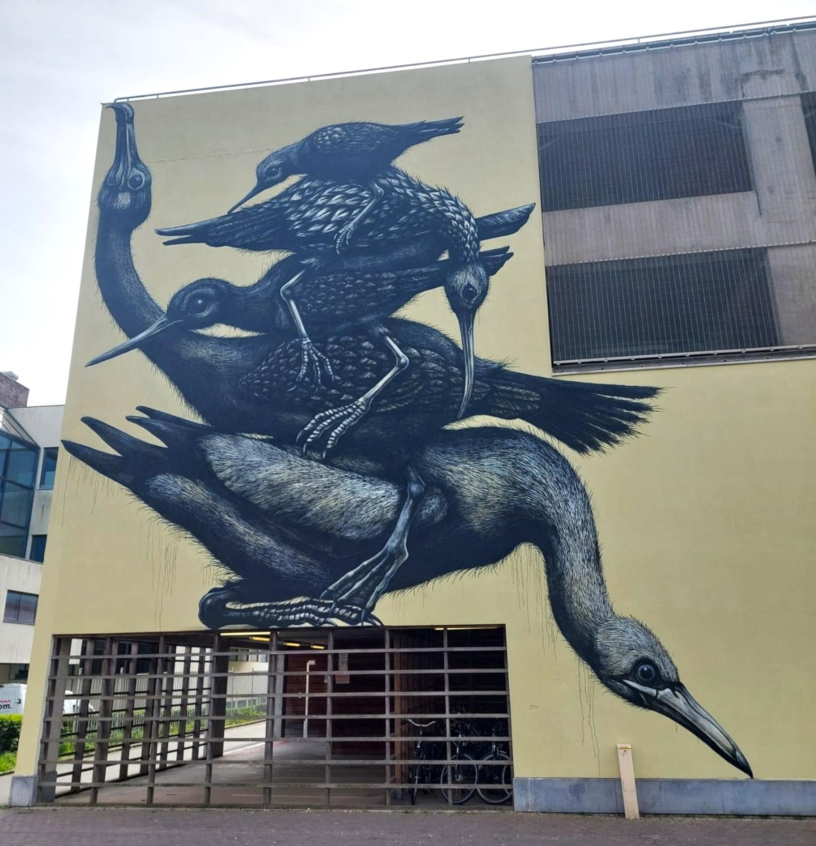 This new mural, featuring animals stacked on top of one another at the AZ hospital, evokes memories of the historic mural ROA created for The Crystal Ship 2016. As always, ROA drew inspiration from the surroundings for this mural too. The birds he painted interact with the sea: they catch a fish or wade through the seawater.