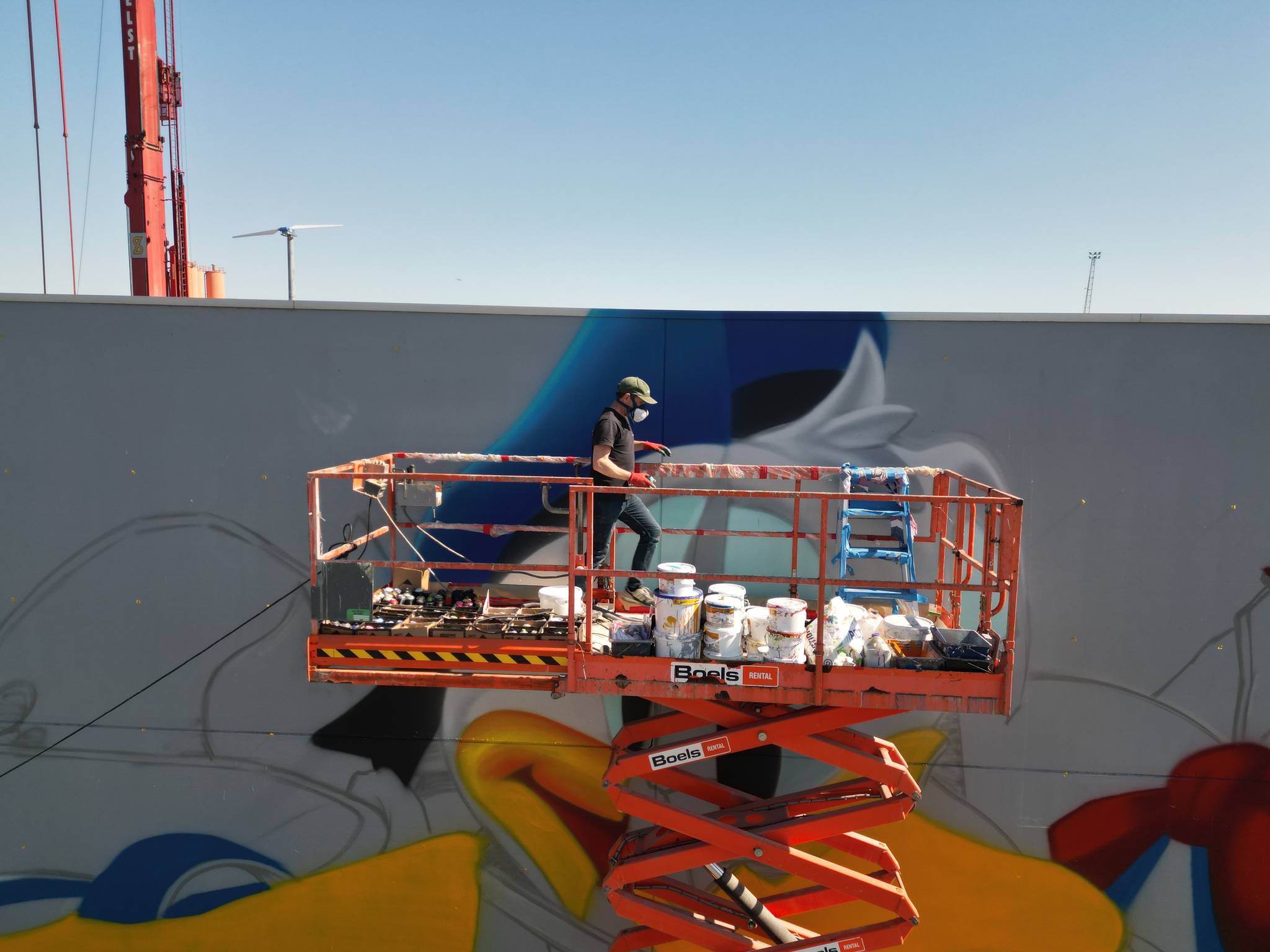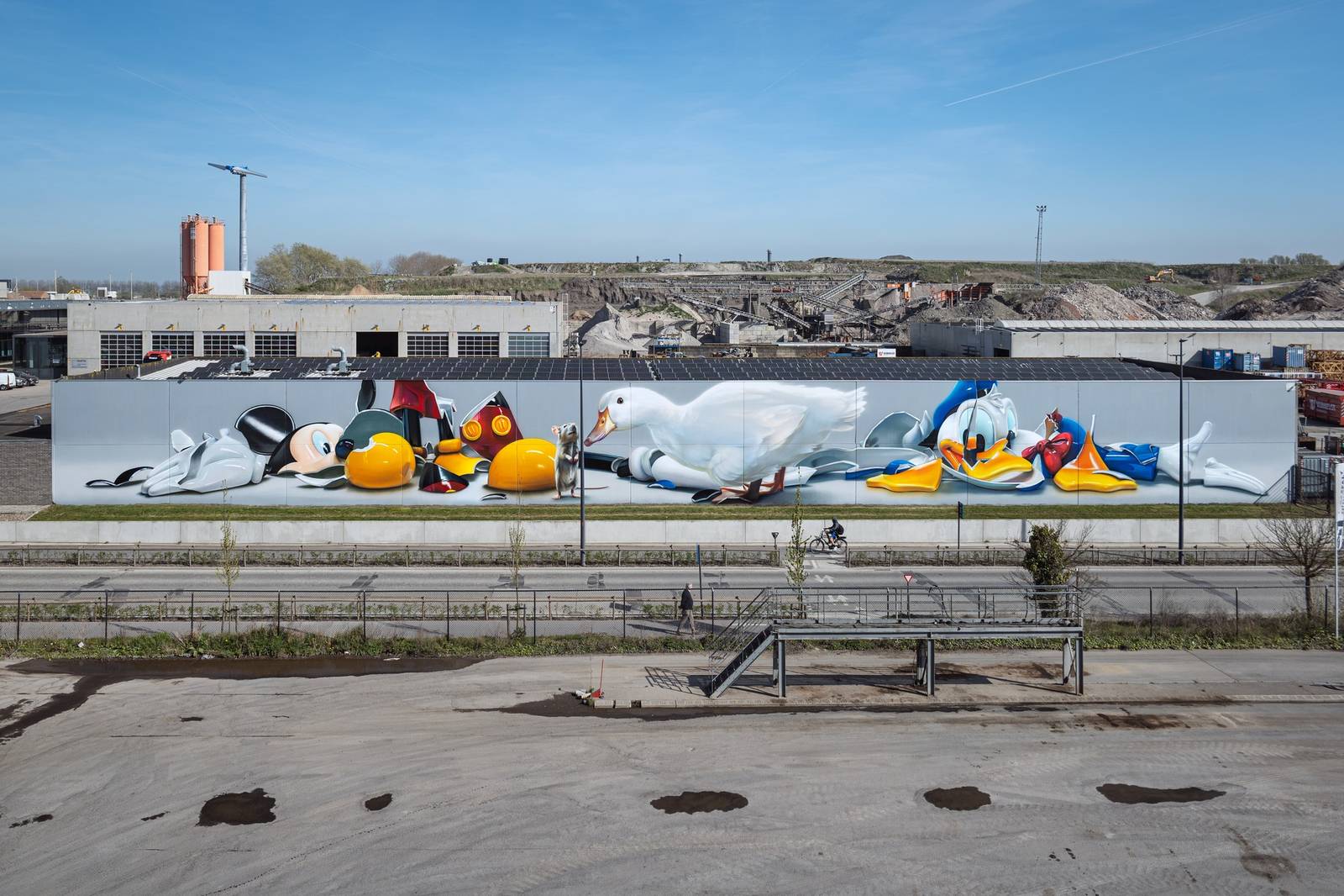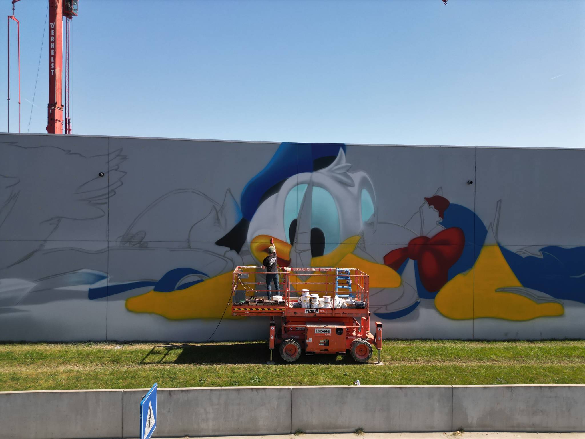 His style? "Realism with a twist," he says. He plays a lot with color and contrast in his work, which takes you into a cheerful world full of superheroes in fairy -tale decors. He sees 'CHANGE' as a theme that helps to transform "boring streets" into cities into a wonderland. He is currently working on a series with cartoon figures and the wall he gets in Ostend, he regards as a challenge because of the long, stretched form. "When I was asked to do a wall here, I happened to be busy with porcelain images that broken - literally - and in between was a realistic variant. That contrast is a recurring theme in my work. It provides reflection. Super A painted the 2 most iconic Disney figures, Mickey Mouse and Donald Duck as porcelain statuettes that splash apart through pressure we all experience today and only the realistic mouse and duck remain behind.