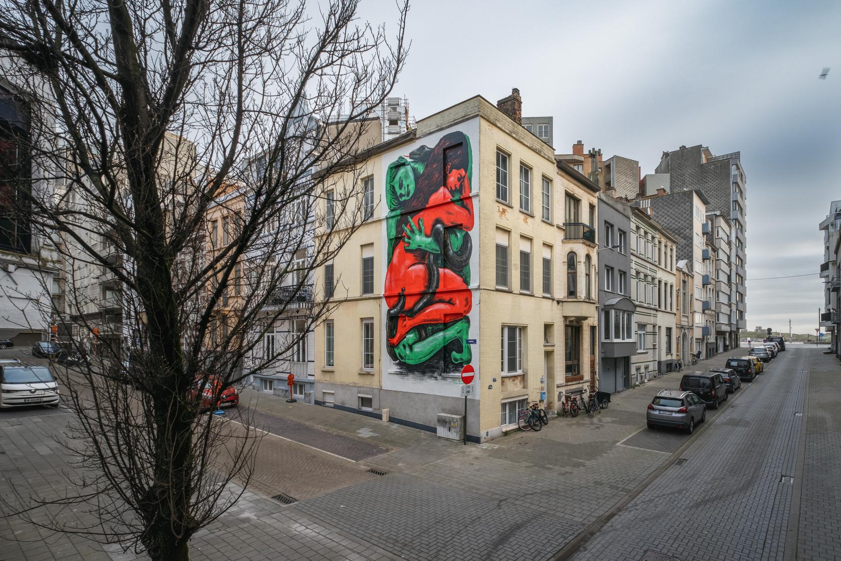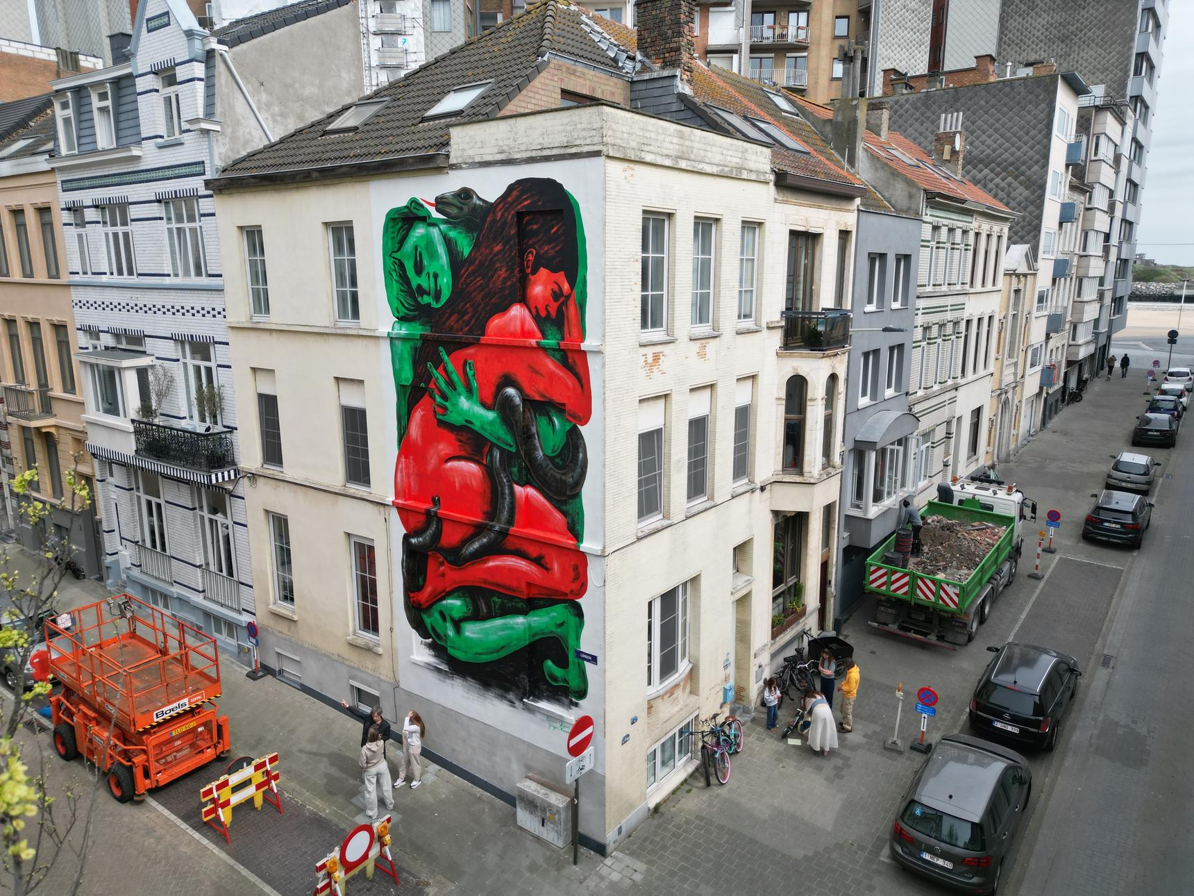 For their first large-scale mural, the multidisciplinary duo Patricia Ghijsens & Yorgos Maraziotis bring a work that merges symbolism, intimacy, and sculptural clarity into a single charged image. Known for moving fluidly between sculpture, painting, printmaking, and design, the pair translate their studio sensibilities into a 12-by-6‑metre wall that feels both meticulously constructed and emotionally raw.