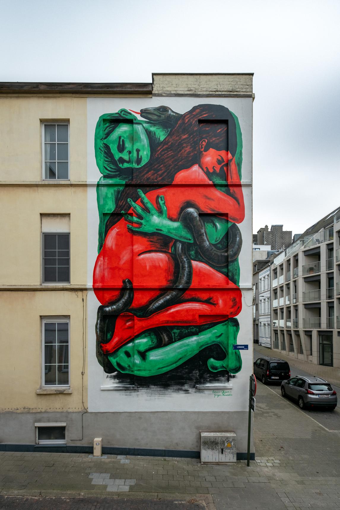 De muurschildering is geïnspireerd op een tarotserie waaraan Patricia werkt, met name de kaart De Geliefden. Hun interpretatie toont twee complementaire figuren, opgesloten in een rechthoek en verbonden door de slang van Adam en Eva. Het rood-groene kleurenpalet heeft al associaties opgeroepen; sommige kijkers zien er Palestijnse kleuren in, maar de kunstenaars benadrukken de veelheid aan betekenissen. Hun werk is nooit eendimensionaal; het is een constellatie van betekenissen, gevormd door contrast, materialiteit en de eigen projecties van de kijker.