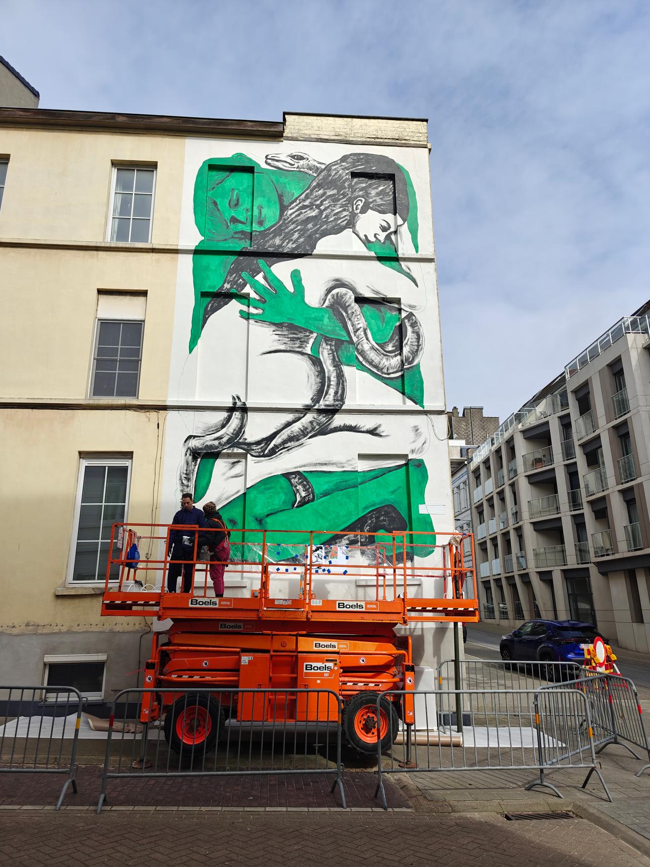 Voor hun eerste grootschalige muurschildering presenteert het multidisciplinaire duo Patricia Ghijsens & Yorgos Maraziotis een werk dat symboliek, intimiteit en sculpturale helderheid samenbrengt in één krachtig beeld. Bekend om hun vloeiende overgang tussen beeldhouwkunst, schilderkunst, grafiek en design, vertalen ze hun atelierervaring naar een muur van 12 bij 6 meter die zowel minutieus geconstrueerd als emotioneel rauw aanvoelt.