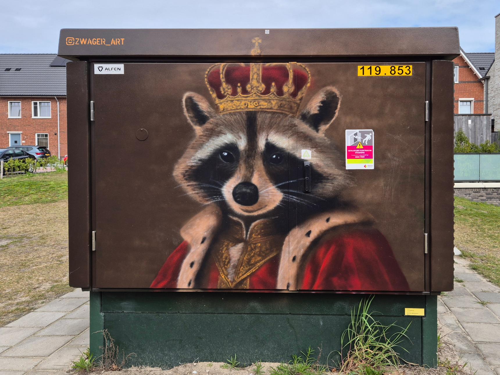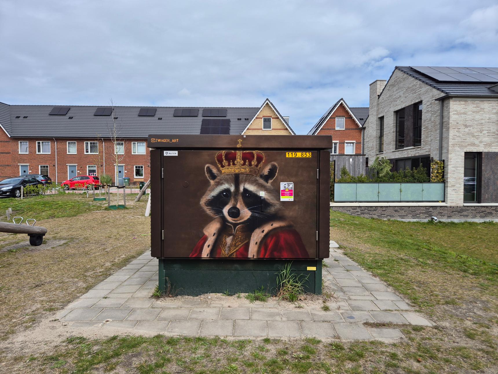 Because this electricity cabinet is situated at Koningin Maximalaan, opposite the corner with Prinses Alexiastraat, the artist was asked to paint something royal and playful.