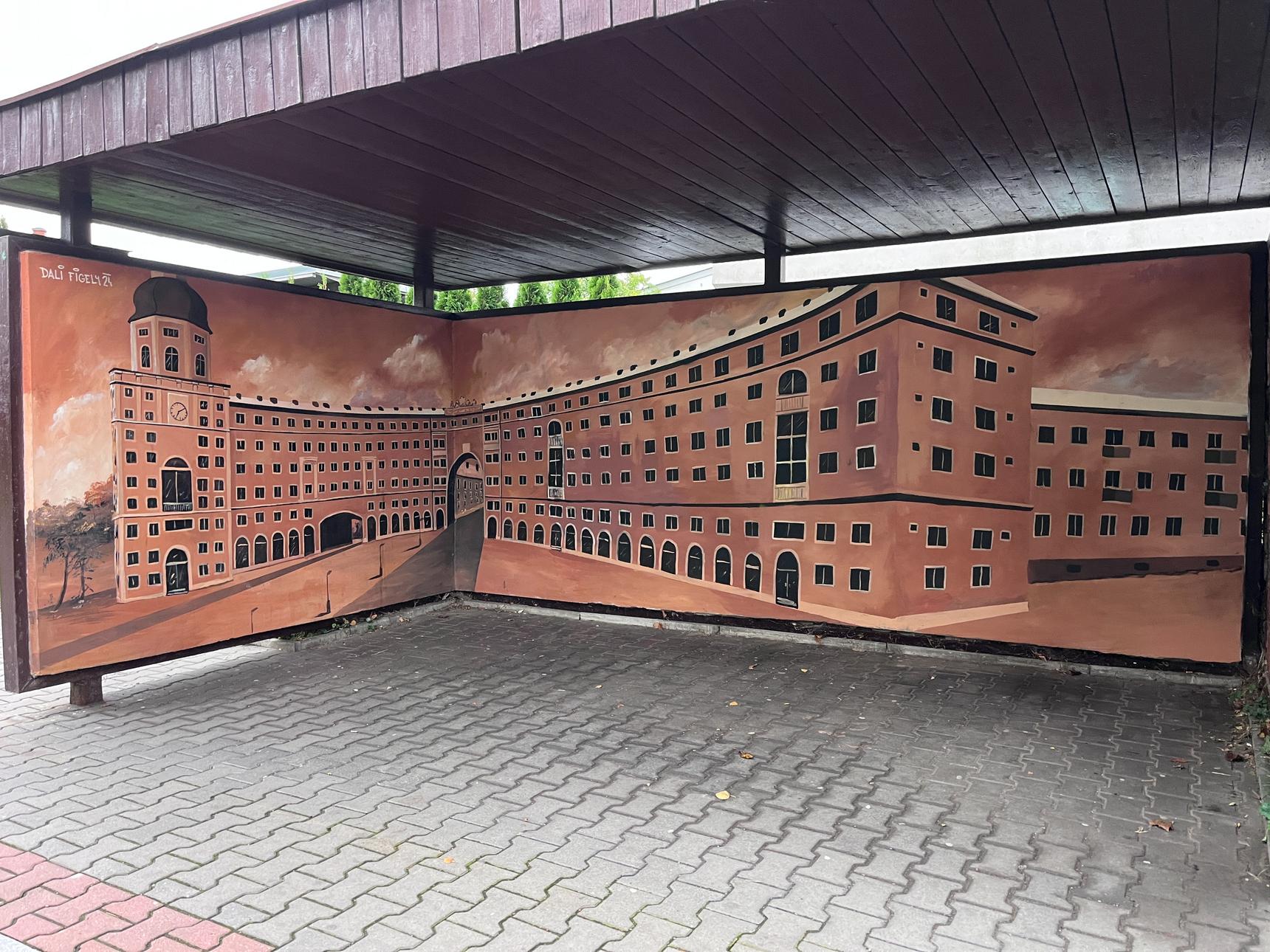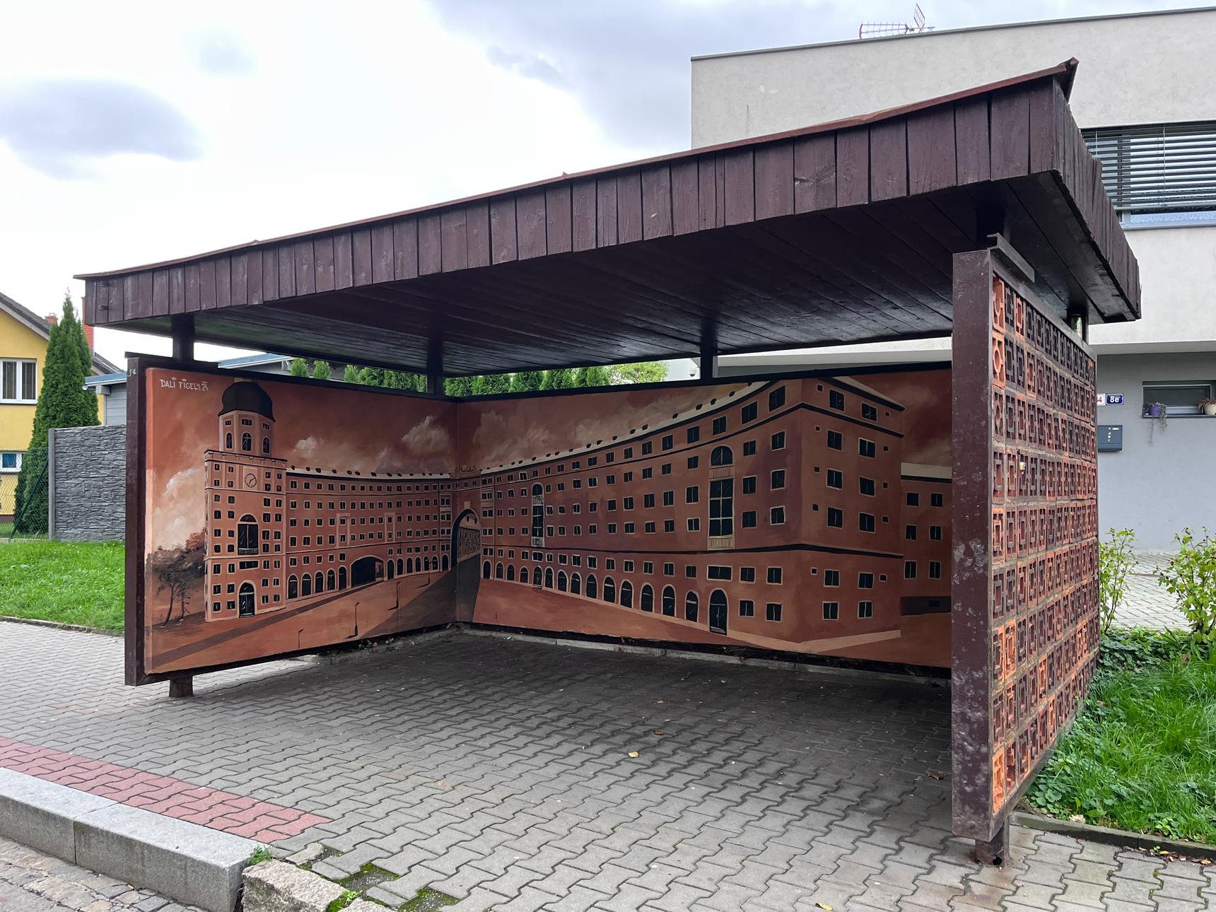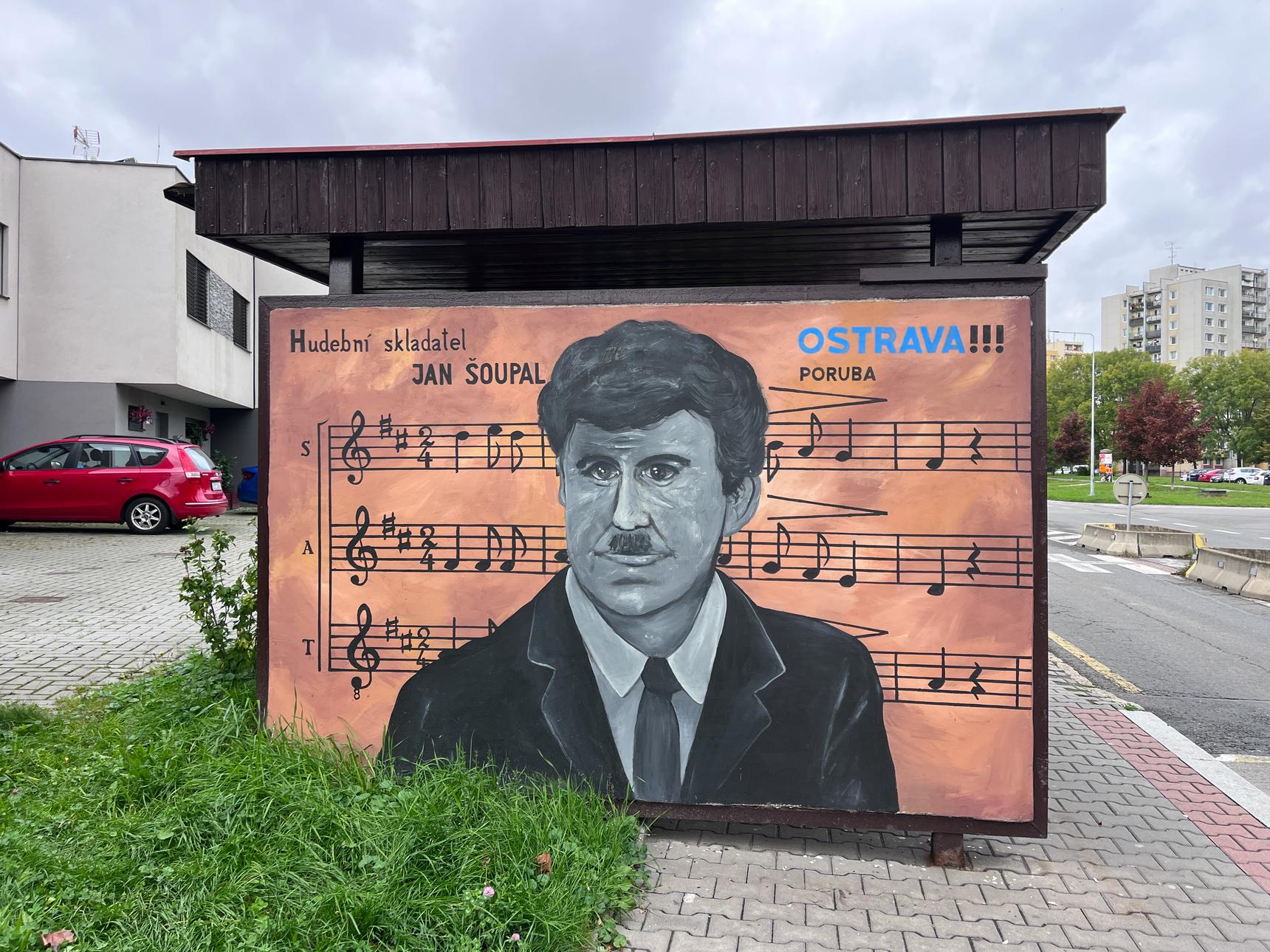 A bus stop: Jana Šoupala, with a painted portrait of the composer and a view of Ostrava’s Poruba district
