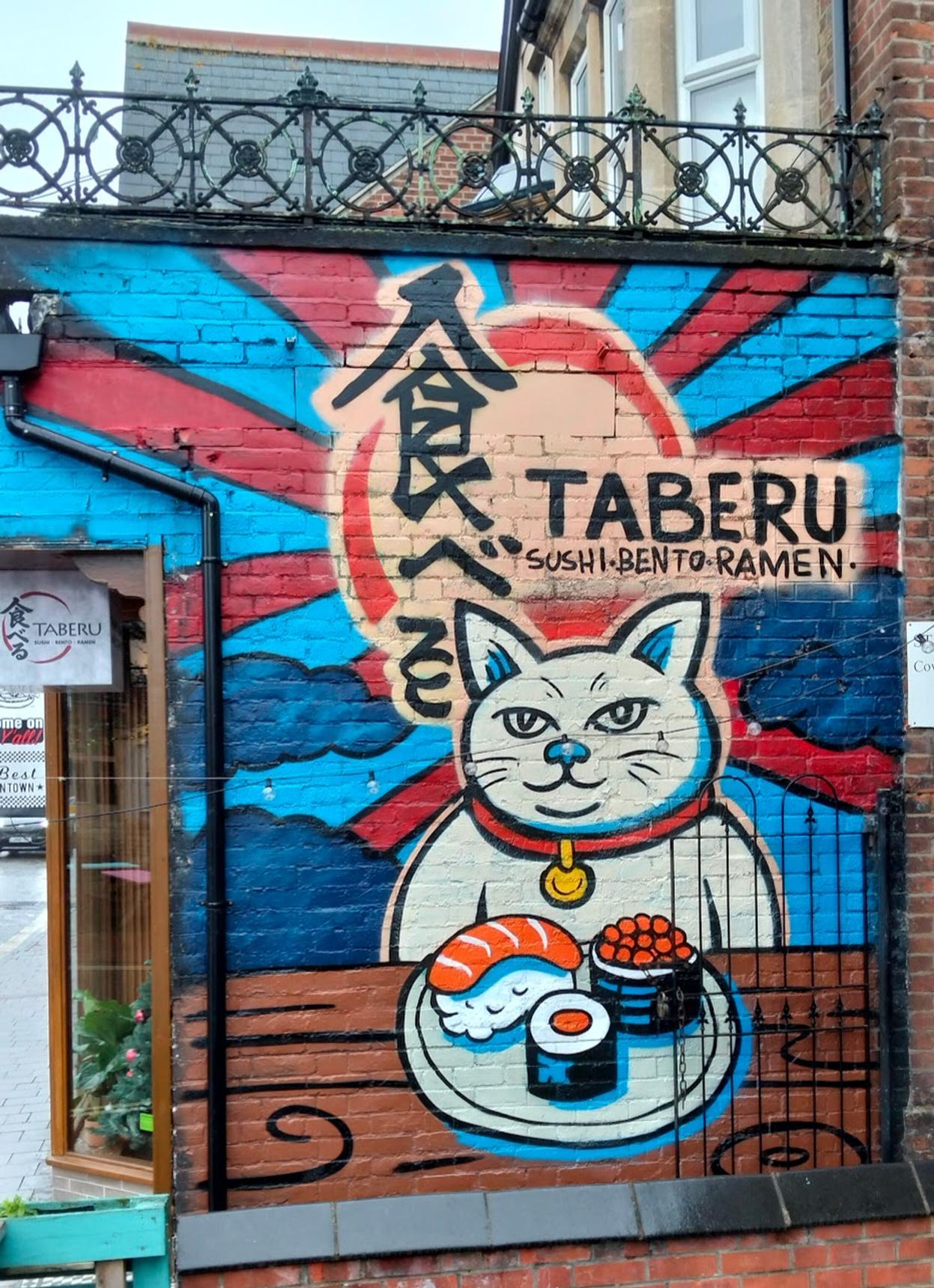an image combining Japanese food with a Maneki-neko (lucky cat)