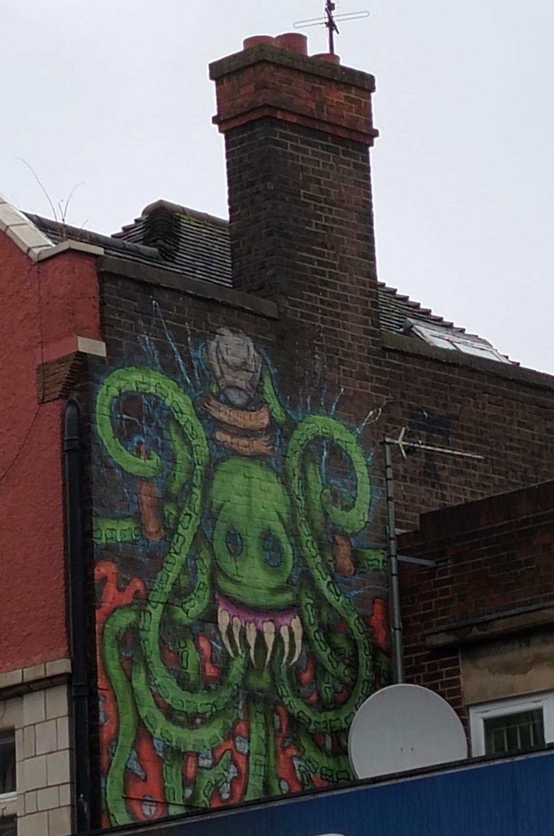 a green octopus, high on the wall