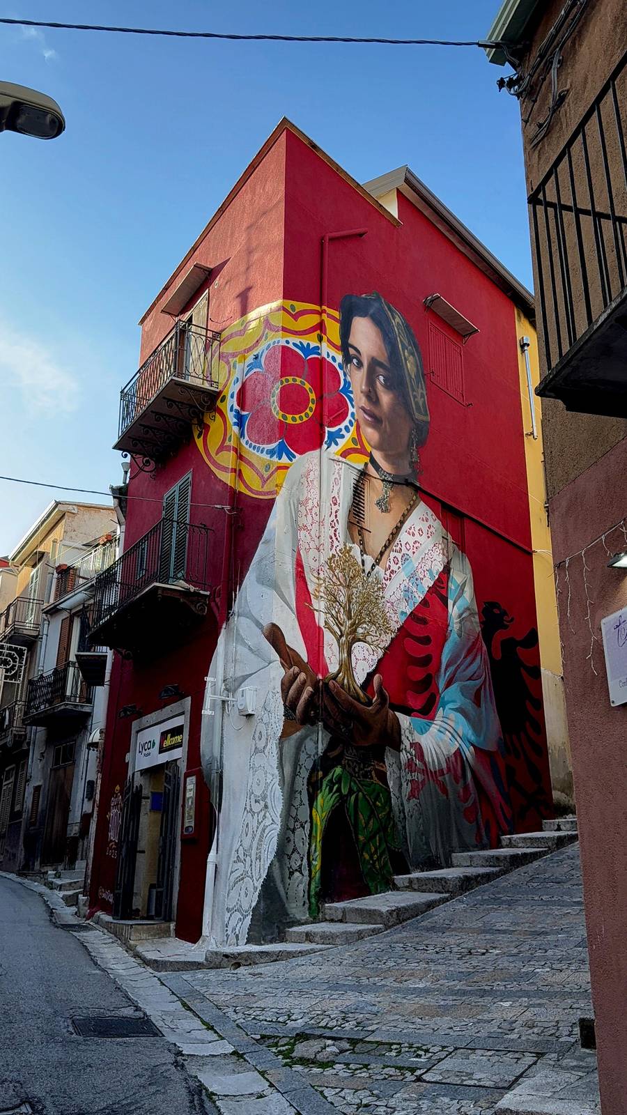 The mural depicts a young woman in traditional Arbëreshë dress holding a tree with its roots visible. Below her is the Albanian flag; above, the Made in Sicily symbol—meant to convey the unity of Sicilians across the world .