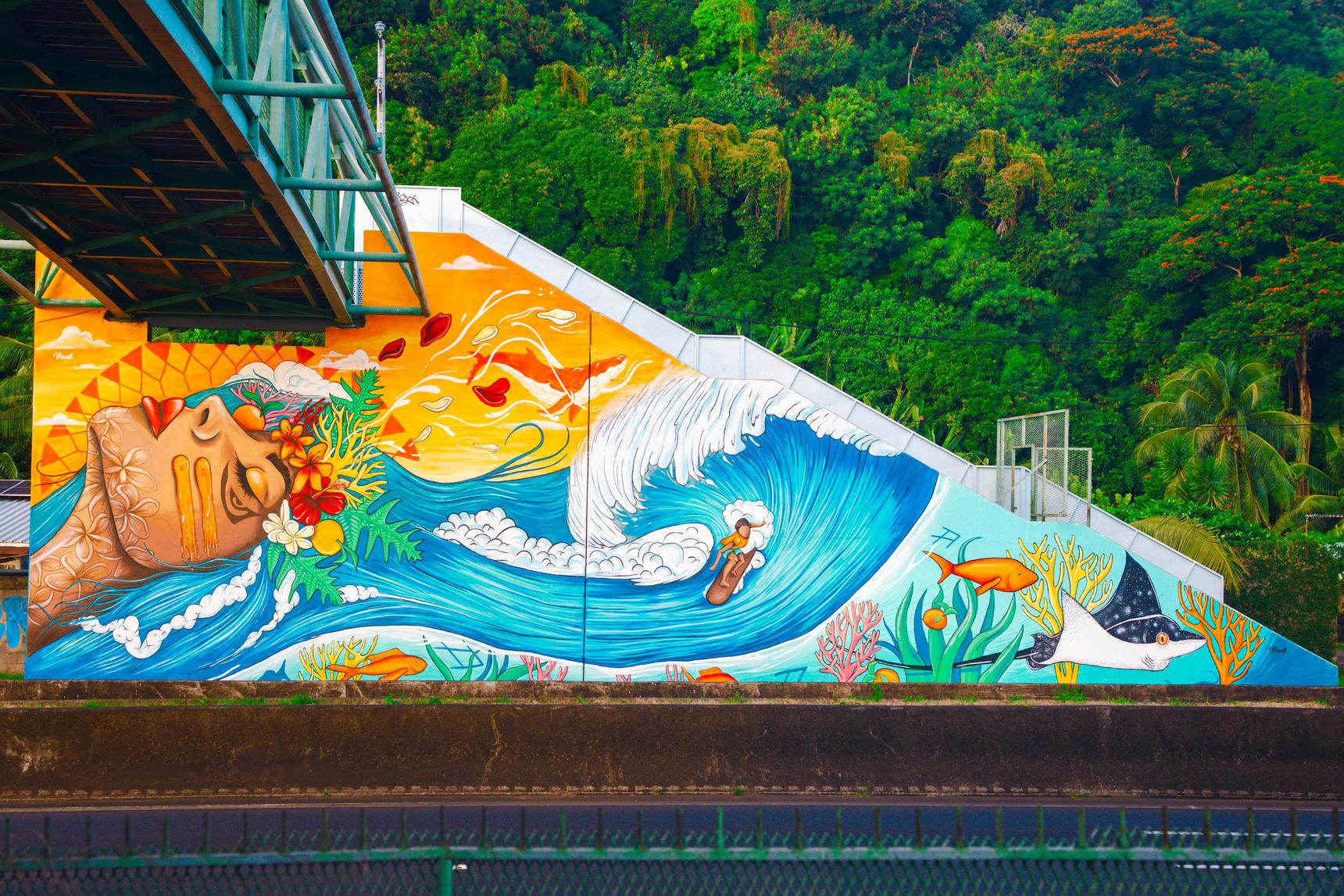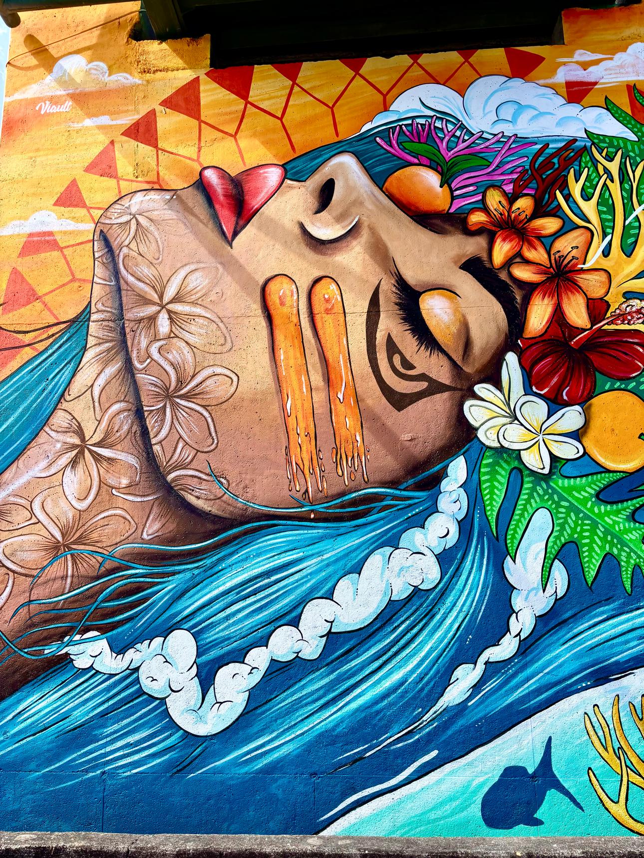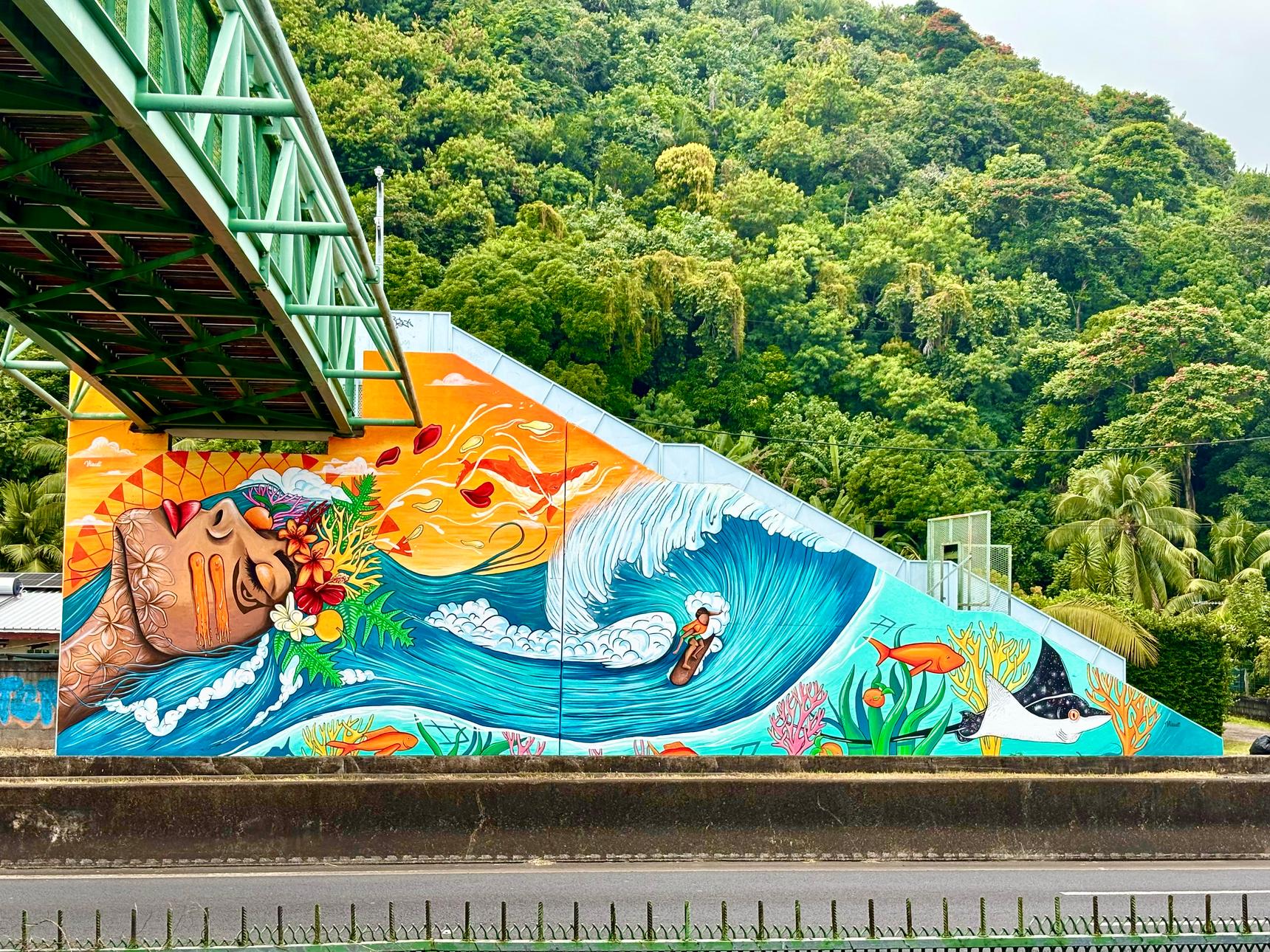 A visual tribute to the deep bond between nature and culture in Punaauia. Through powerful symbols the Mother of Oceans, an alaia surfer, the wave of Taapuna , traditional patterns, and dreamlike elements, it calls for protecting marine and land environments and honoring ancestral traditions.