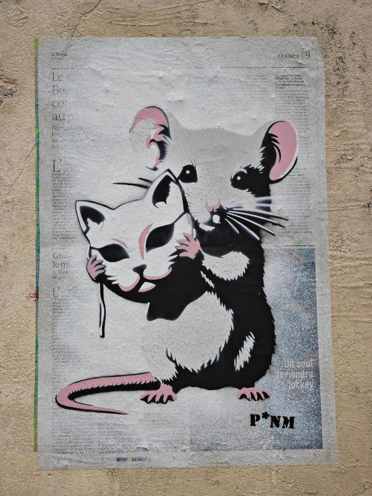 P*NM (formerly known as Click Street Art) is particularly active in the street as well as in his studio. His favorite technique is stencil, which he cuts by hand or with a laser, allowing him to rework portraits of illustrious (un)known people and familiar yet surprising animals in a typical style by combining several successive layers. In his works, he attaches particular importance to the background which sublimates the main character and sometimes adds a striking contrast. For this, during his city wanderings, P*NM is always on the lookout for a flyer, an original support, a metro map... so many supports that he combines, cuts, mixes to create his stencil paintings.
