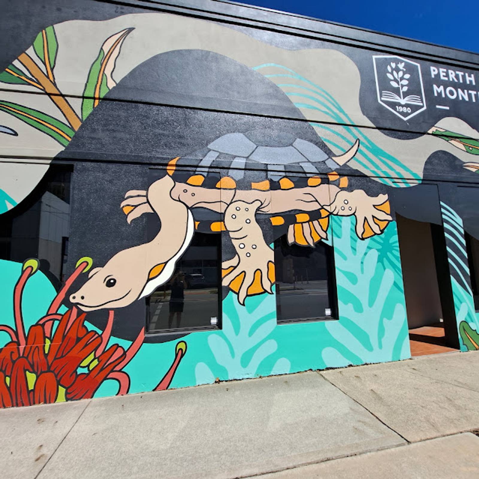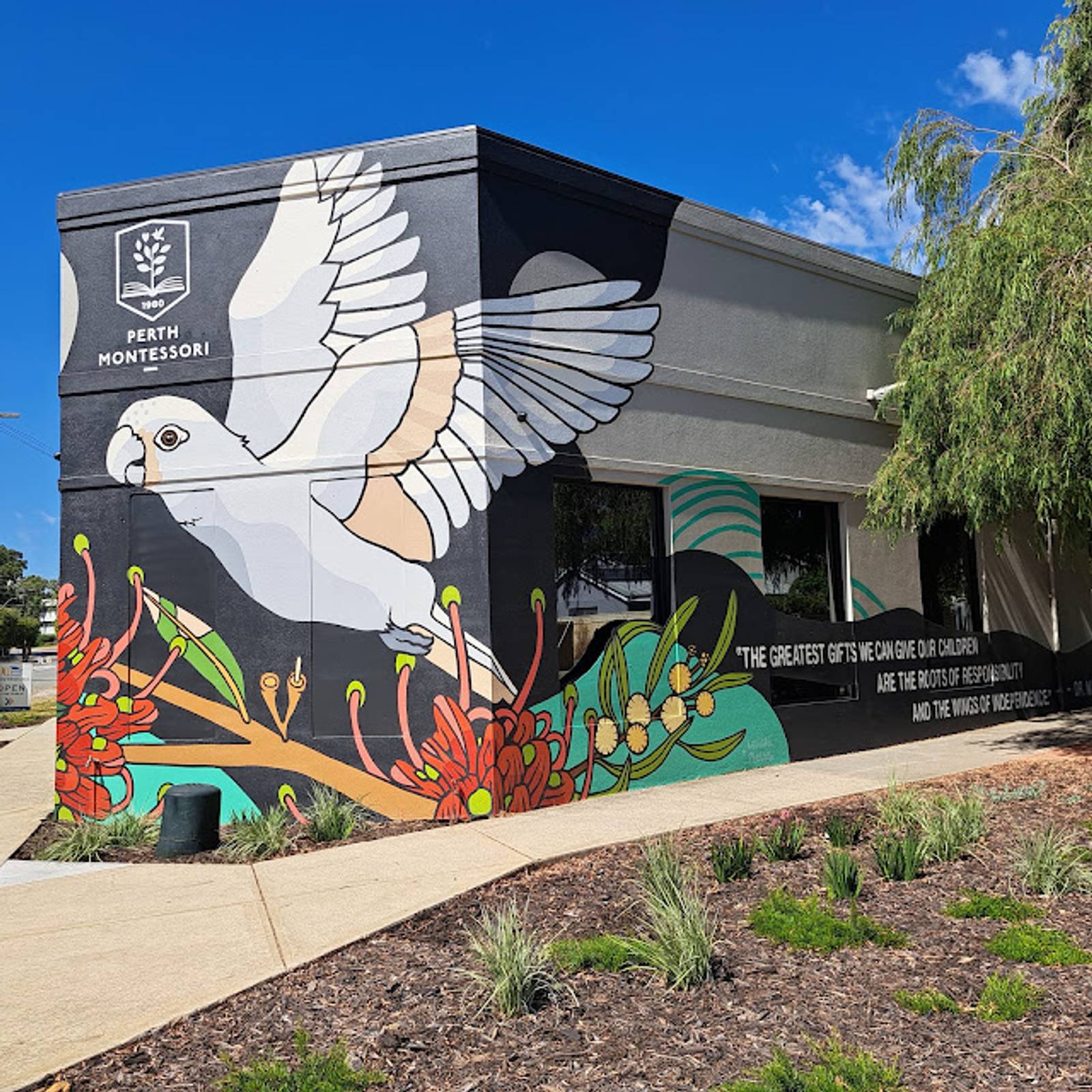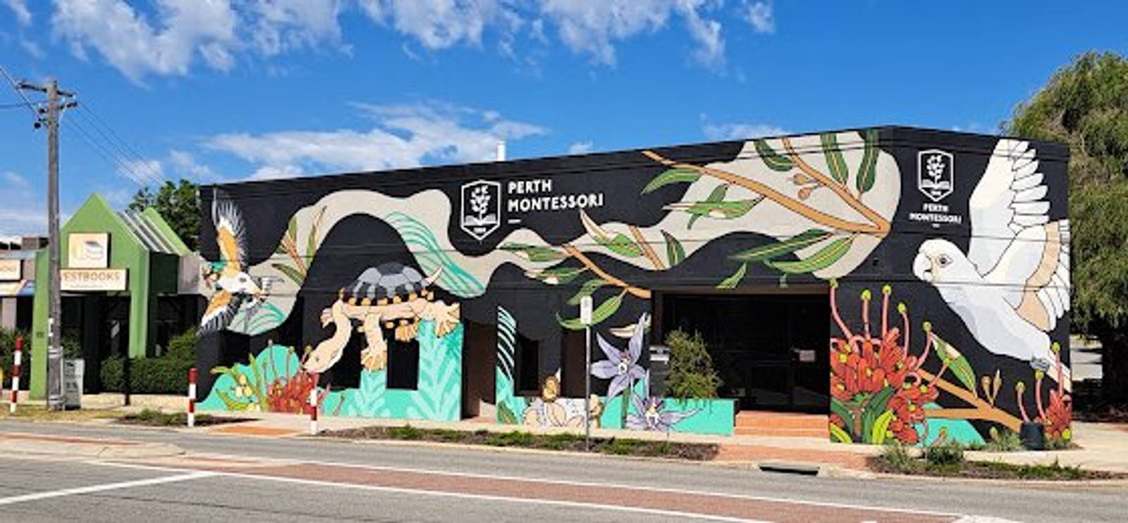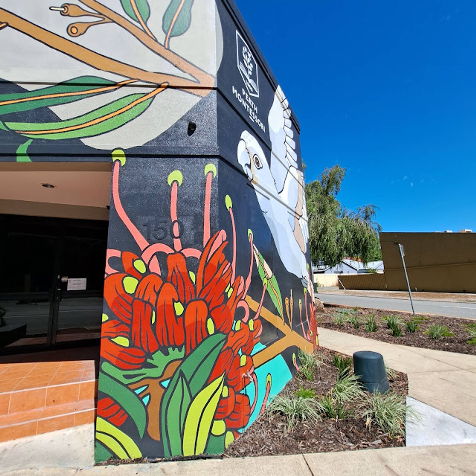 Painted in April 2022, on the walls of Perth Montessori School at 150 Burswood Road, Burswood, by Perth artist Melski with "guests" who popped in to help with the finishing touches.