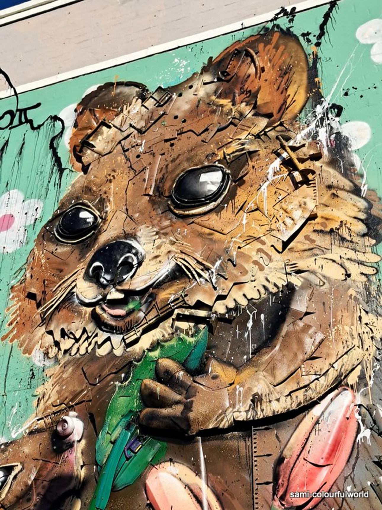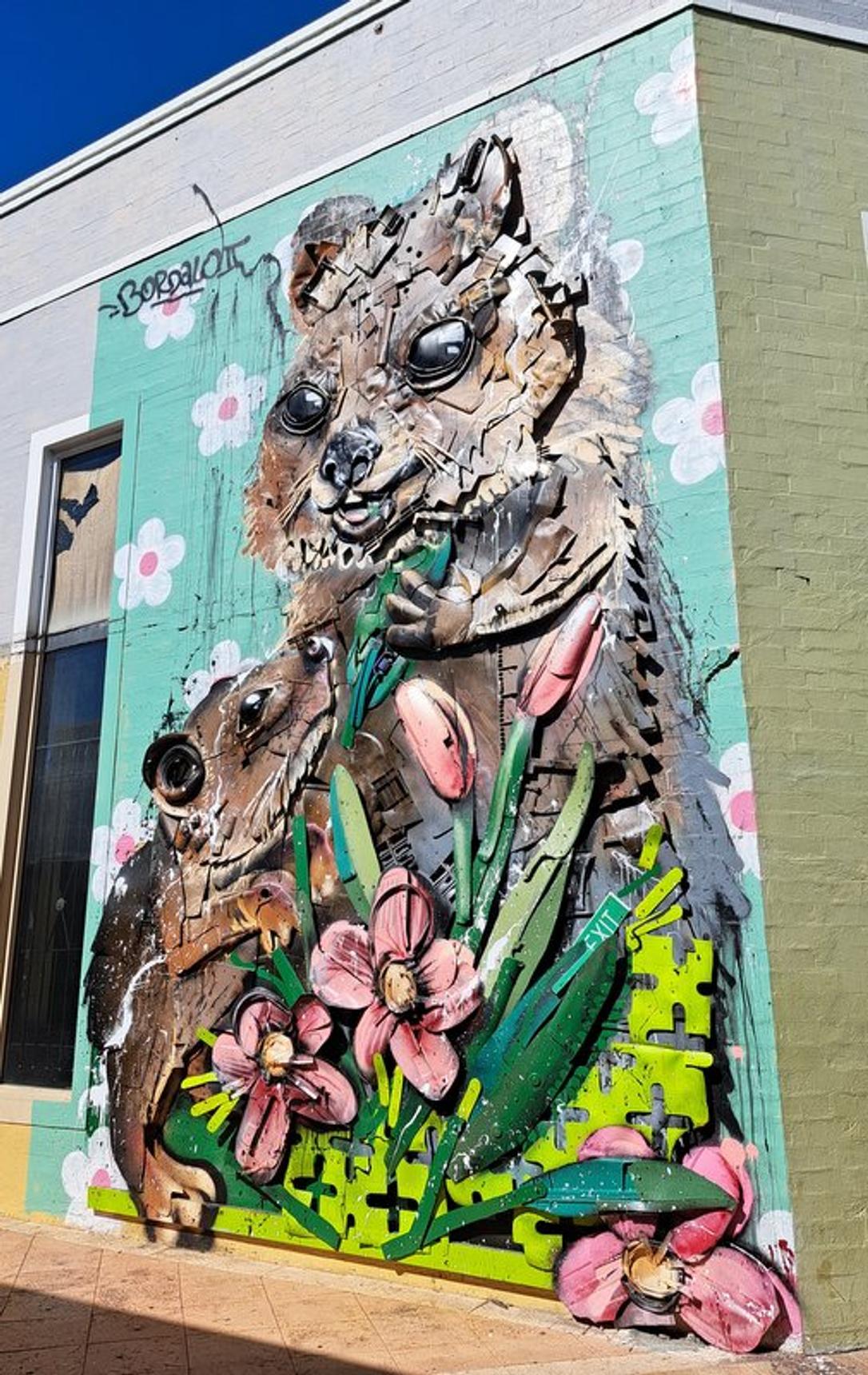 Painted by Portuguese artist Bordalo II, at The Piazza Fremantle. Another one of his 3D trash animals, this time a mom and baby quokka - the little marsupials native to Western Australia, mainly seen in Rottnest Island, using plastics and other discarded materials to highlight environmental pollution.