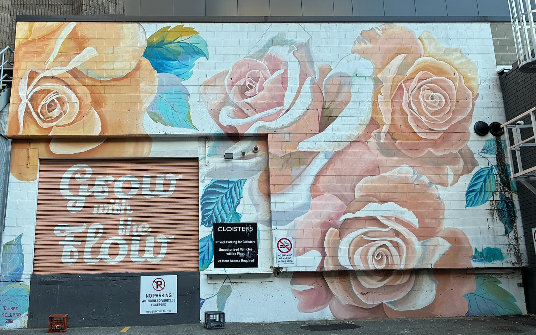 The artwork features large, soft-hued roses and the phrase "Grow with the Flow" painted on a roller door. It situated down the ally between Bankwest and Friendlies Pharmacy on Hay Street.